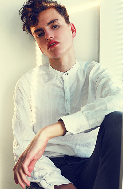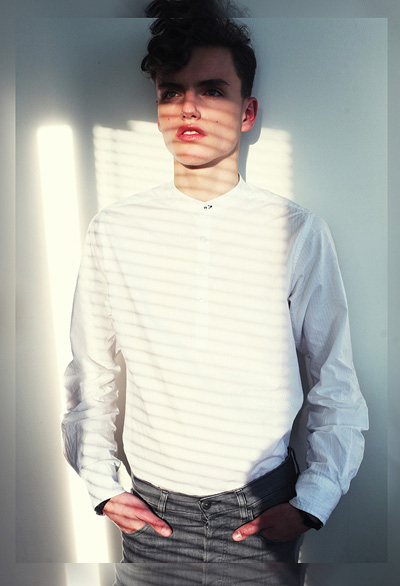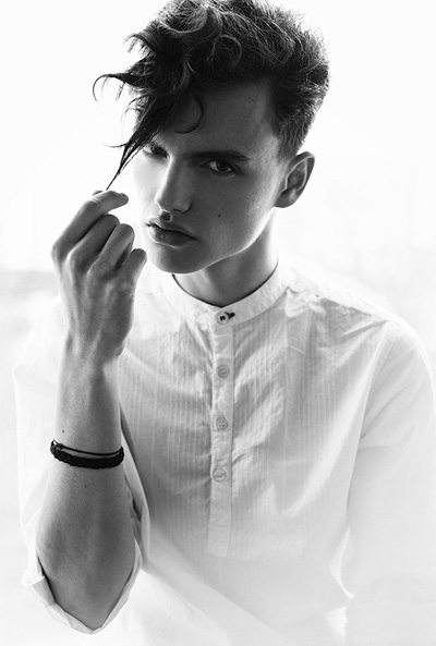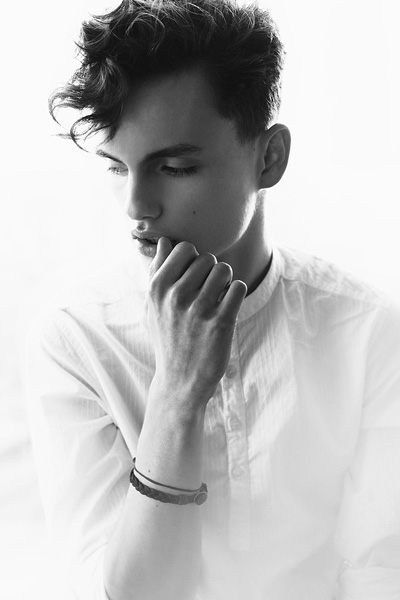 Daniel Aleksić black and white fashion portrait by Ferran Casanova in Barcelona studio