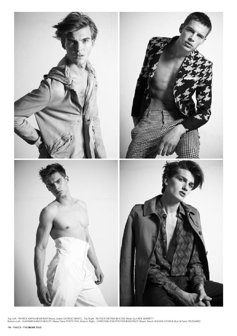 Adam Berg, Alexander Woloszynski, Christian Larsson, Christian Von Pfeffer, Francisco Lachowski, Harry Goodwins, Jonathan Marquez, Mark Cox, Nils Butler, Patrick Kafka, Ralf Javoiss, River Viiperi, Rutger Diepska, Taylor Fuchs, Ton Huekels, Sebastian Sauve and Vladimir Ivanov, shot by Saverio Cardia an styled by Lucio Colapietro for Fiasco‘s latest issue.