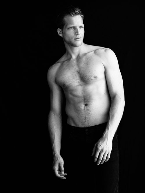 Fitness model Alex Valentin poses in Calvin Klein briefs in a striking black-and-white editorial photographed by Glenn Nutley in Paris.