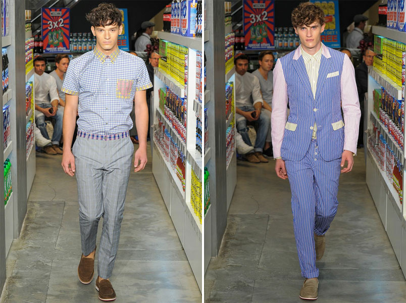 Moschino‘s Spring/Summer 2013 runway show was fashioned after a supermarket with the first round of looks using product branding as their print.