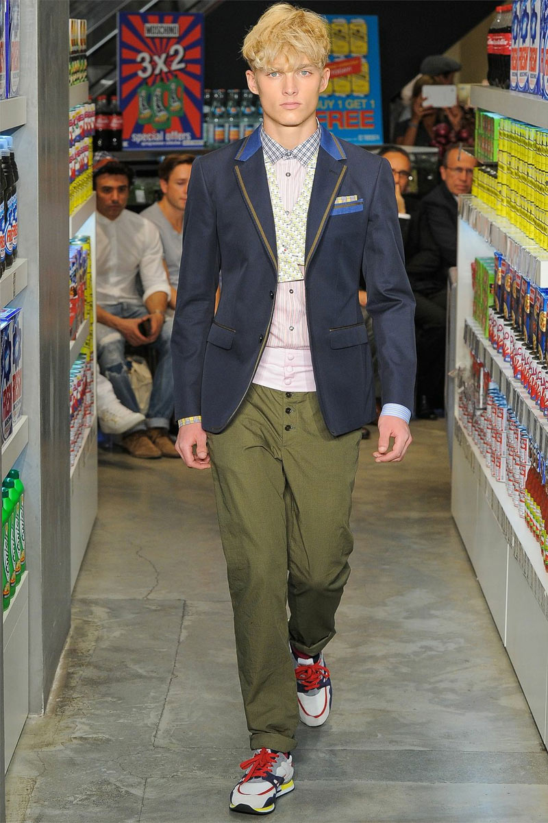 Moschino‘s Spring/Summer 2013 runway show was fashioned after a supermarket with the first round of looks using product branding as their print.