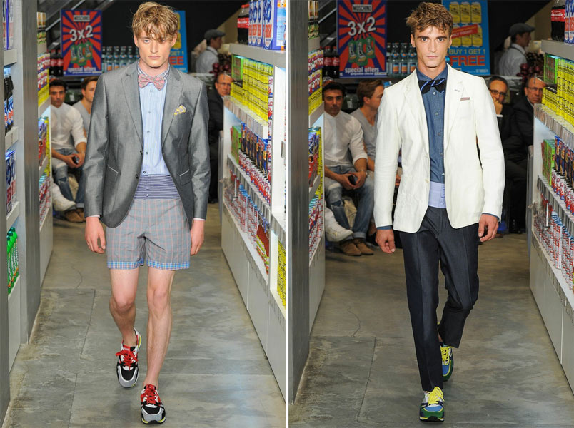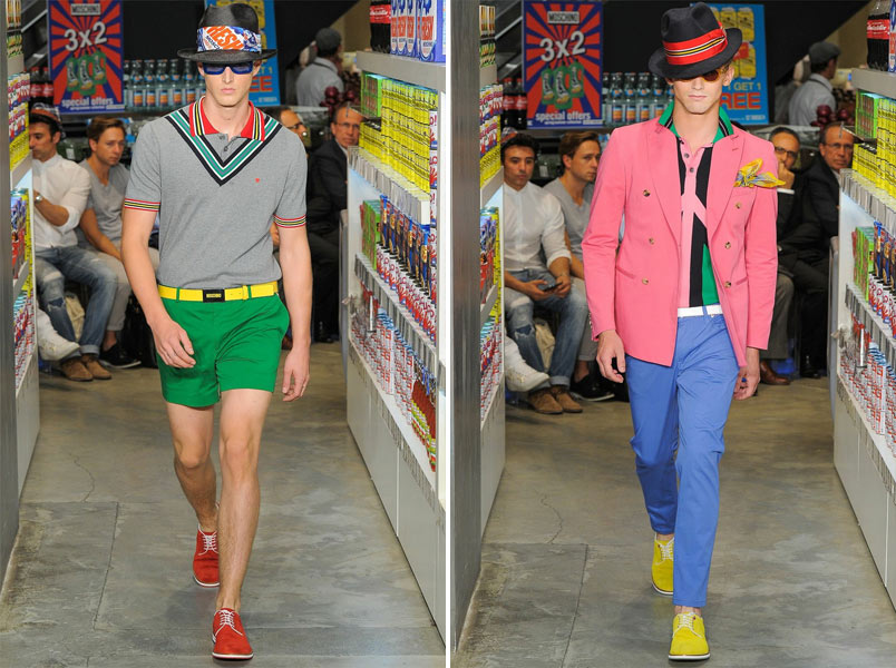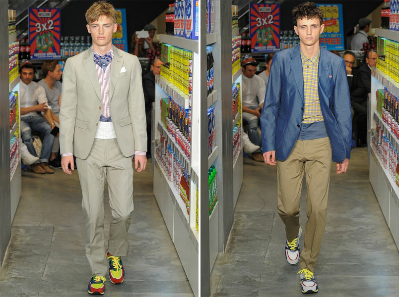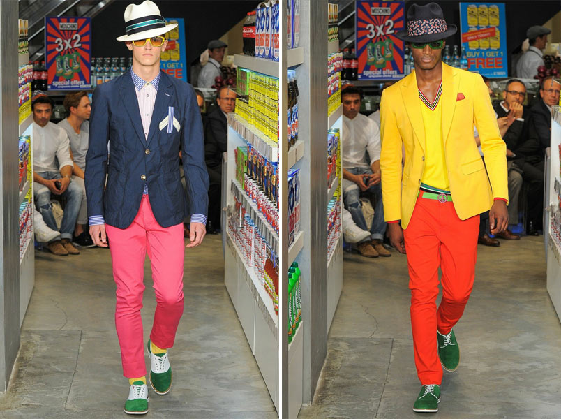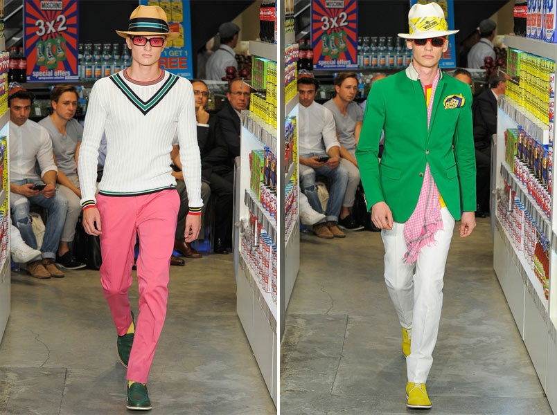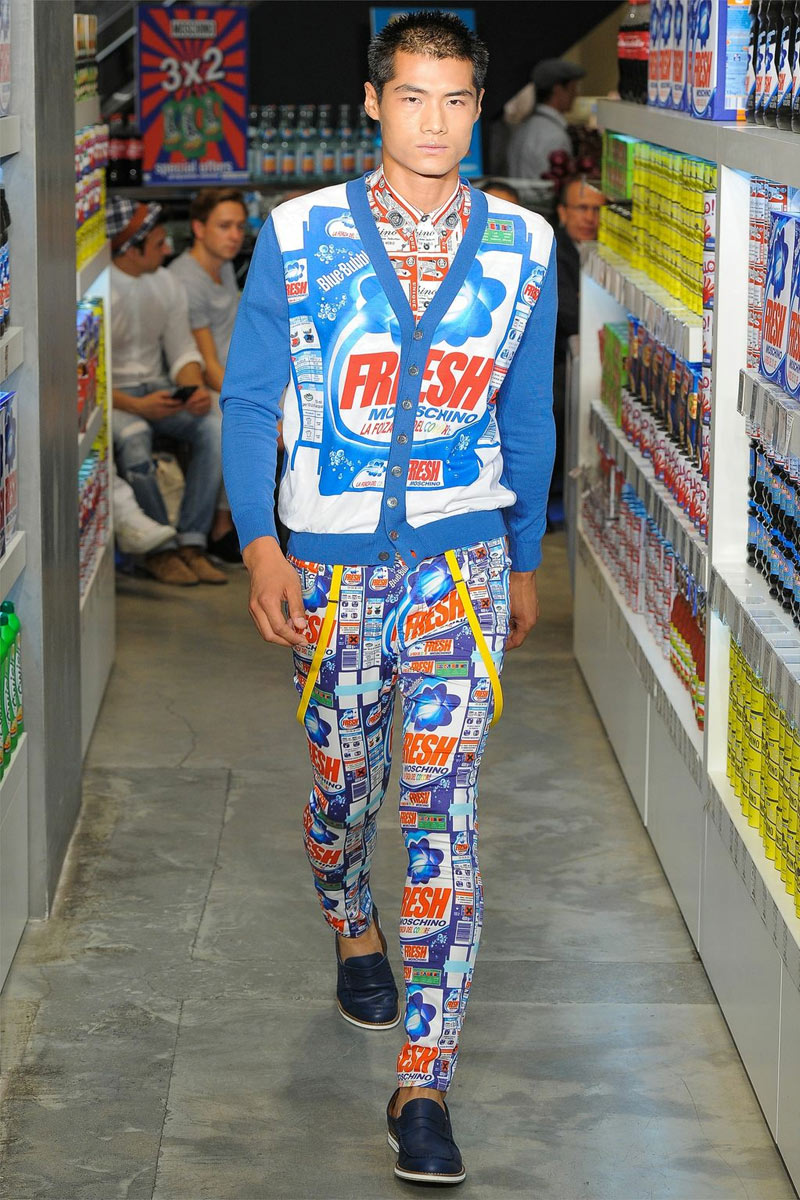 Moschino‘s Spring/Summer 2013 runway show was fashioned after a supermarket with the first round of looks using product branding as their print.