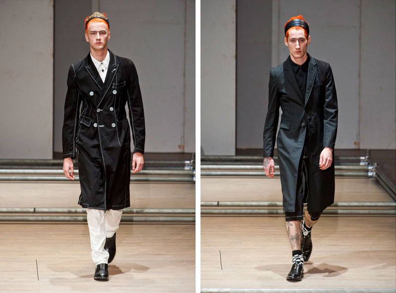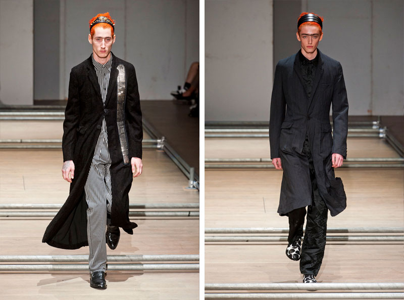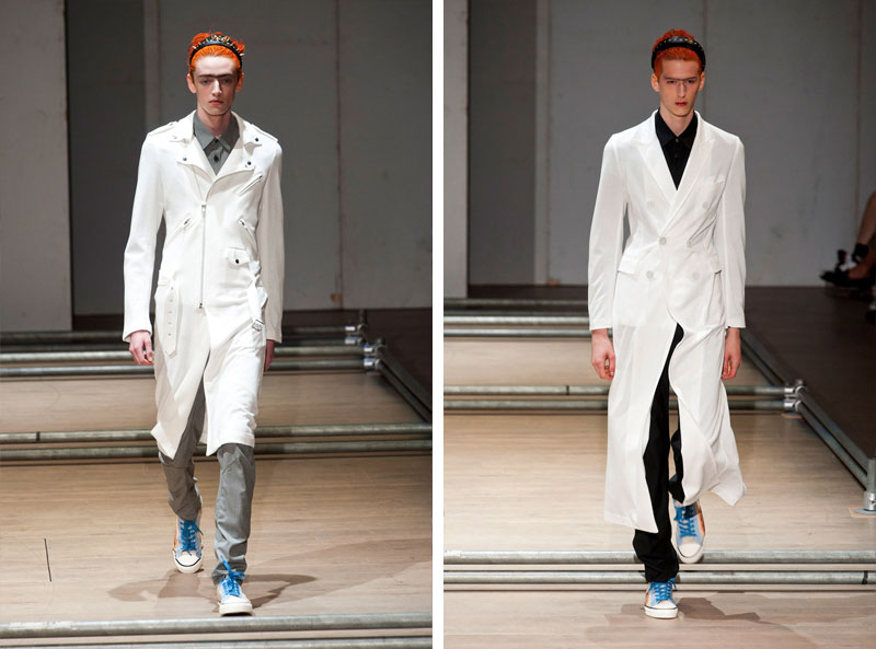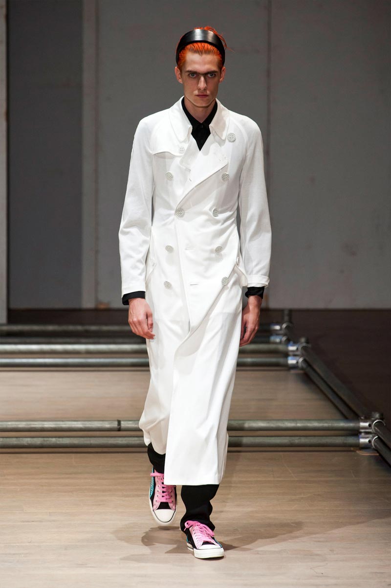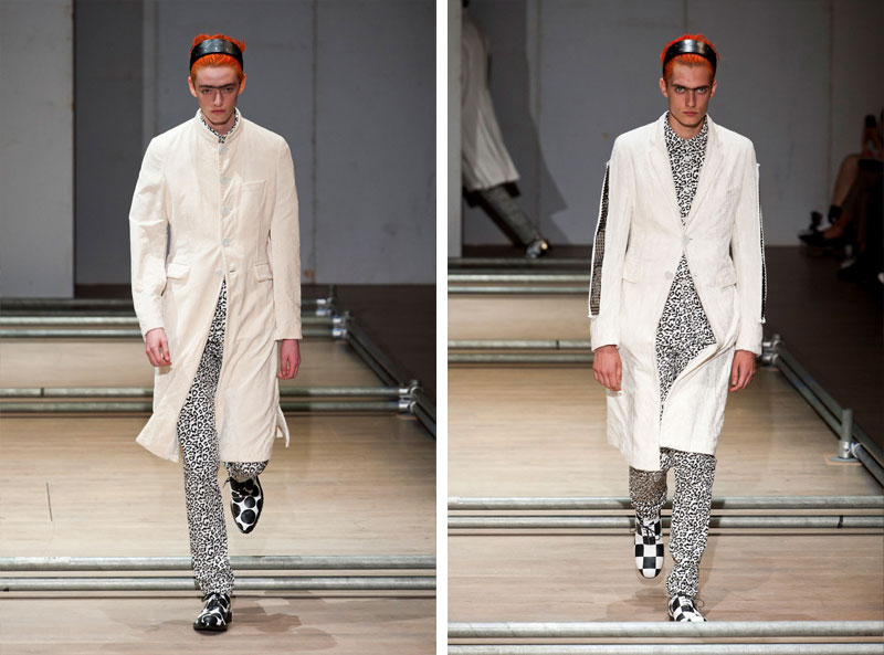 Rei Kawakubo created a strong collection for Comme des Garçons Spring/Summer 2013 season. The models, with bright orange hair and the in vogue unibrow, marched out over scaffolding laid on the floor wearing camouflage tunics and pants under slim military long coats.