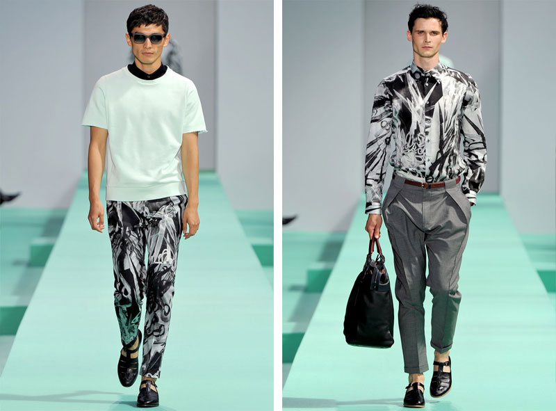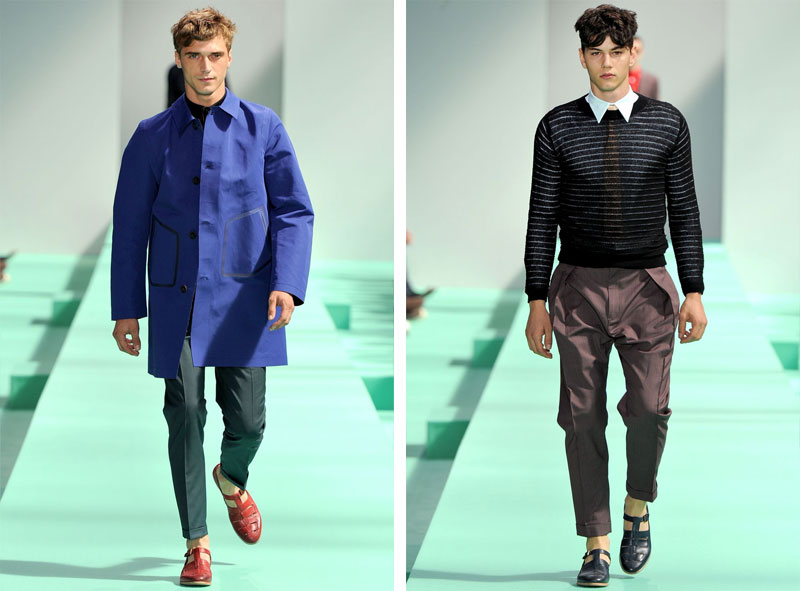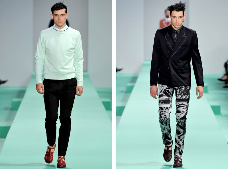 Tailoring is smart and modern; jackets, slim and unfussy, have shoulders that are structured to give definition, but are not big or bulky. Trousers are pleated and pegged, with a stitched in stay press to accentuate the silhouette. Shirts return to larger, longer, angular collar points with high neck lines, which are worn with slim silk black polka dot neckties under laddered scissor-snipped knitwear or short zipped leather pieces.