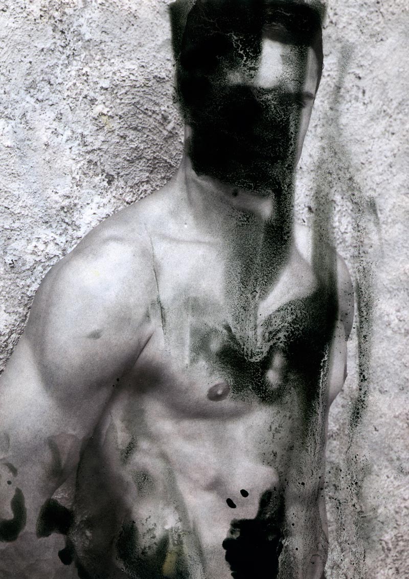 The sterility of the photoshopped male ‘prototypes’ dissolves behind dark washes and is soiled by organic structures- the computer-optimized image finding it’s way back to being analogous, and one of a kind.