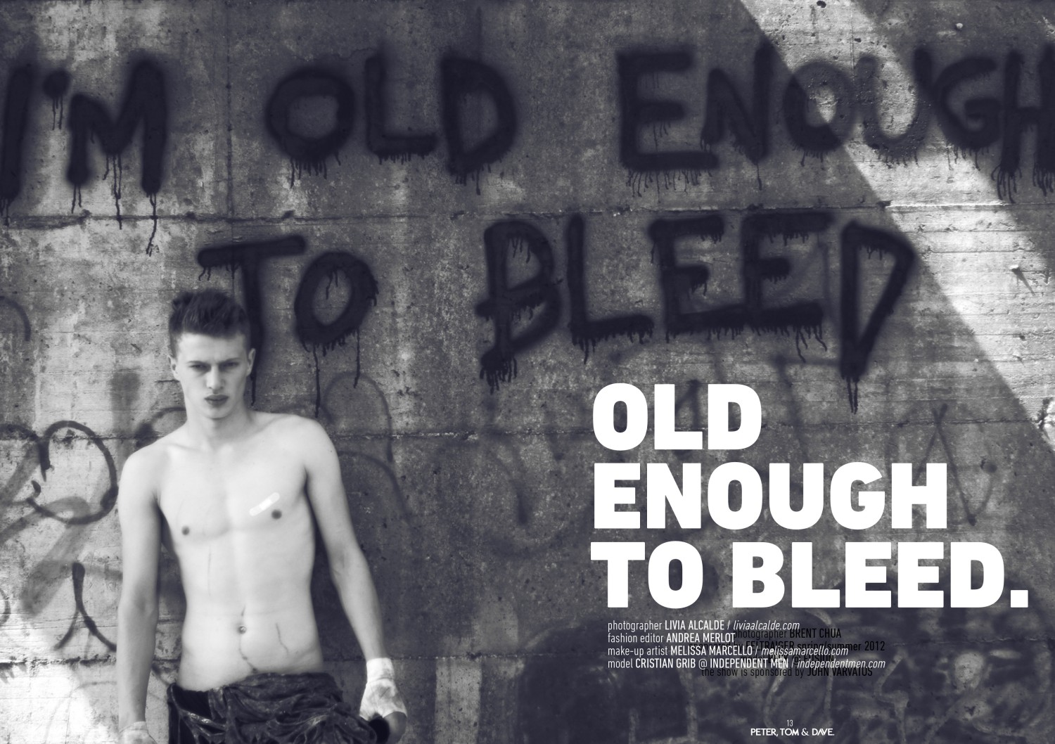 Independent Men model Cristian Grib is photographed by Livia Alcalde and styled by Andrea Merlot in the story ‘Old Enough to Bleed’ for the latest issue of Peter, Tom & Dave, with makeup by Melissa Marcello.