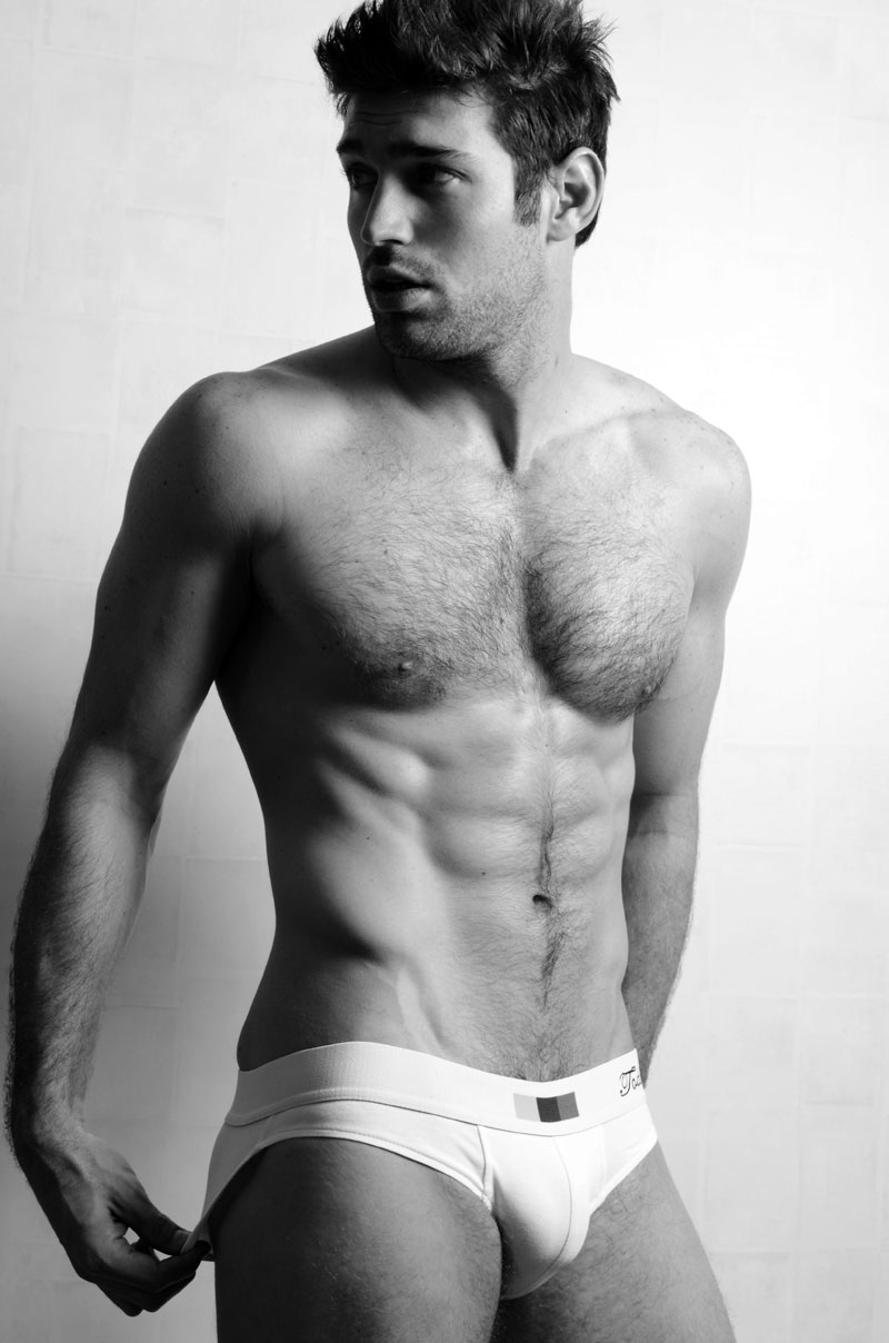 Model Bo Roberts is posing in Todd Sanfield Collection underwear for a striking black and white session by Calvin Brockington. Bo is represented by Q Model Management in New York.
