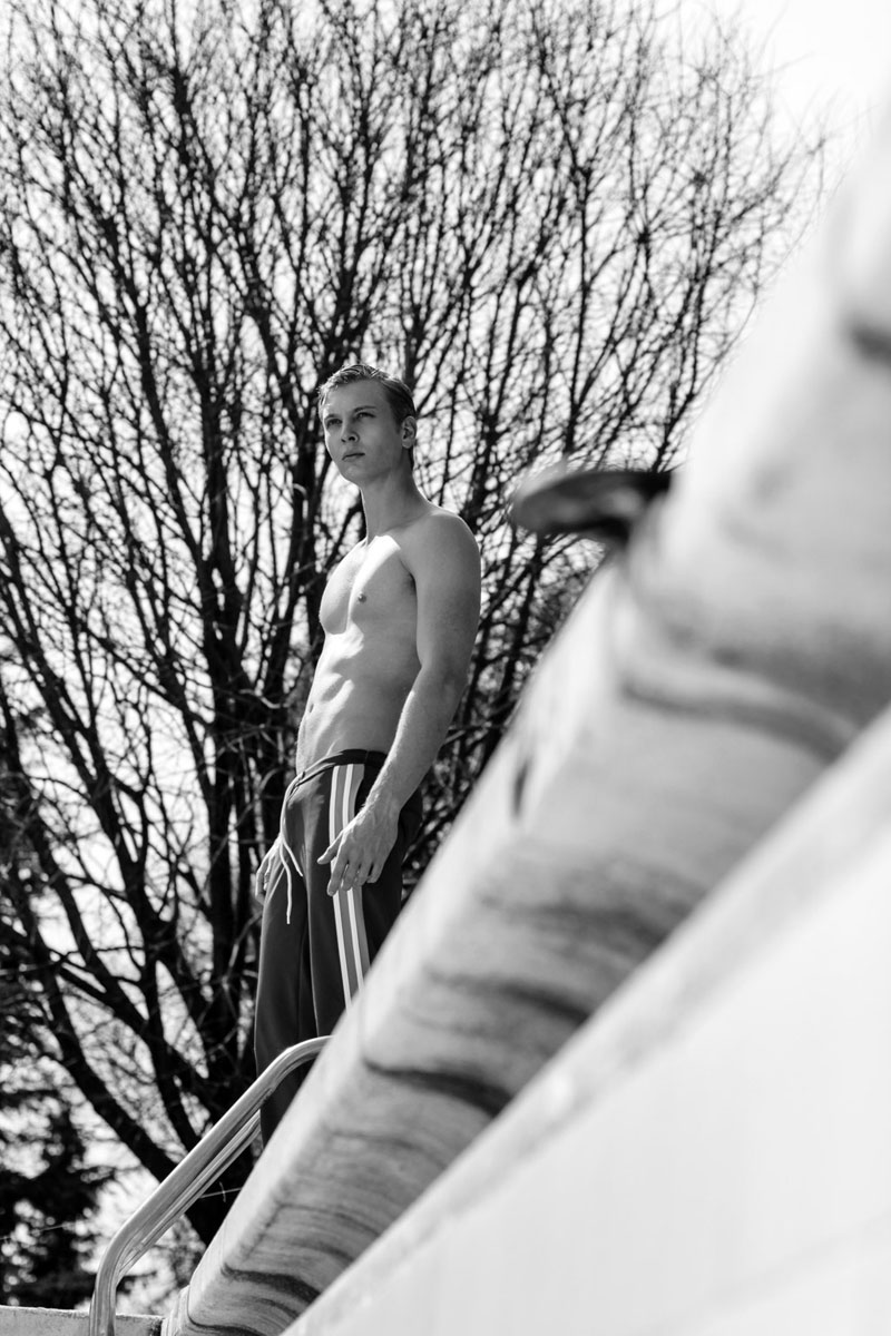 Reynier Shields (at Boss Models) in a photo story entitled “FORM”. Photographed by Steve Marais in a disused Johannesburg swimming pool and styled by fashion blogger Marco Riekstins for Man of the Cloth.