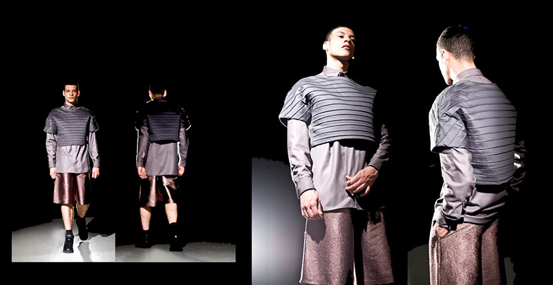 Francesca looked at everything from bare knuckle boxing to danseurs, gang related imagery to warriors. To translate this into something tangible and beautiful she used the principles of tension, strength and sensitivity and translated them into my fabrics. Rich, sumptuous brocades, wool silk mix shirting, textured silks and the key feature of the collection being the use of stainless steel chainmail. The print was developed from Francesca’s own images of the battered, barren landscape flying over Minnesota.