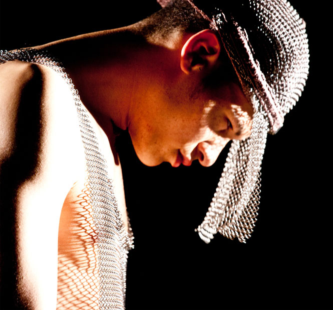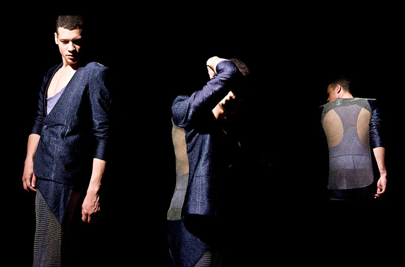 Francesca looked at everything from bare knuckle boxing to danseurs, gang related imagery to warriors. To translate this into something tangible and beautiful she used the principles of tension, strength and sensitivity and translated them into my fabrics. Rich, sumptuous brocades, wool silk mix shirting, textured silks and the key feature of the collection being the use of stainless steel chainmail. The print was developed from Francesca’s own images of the battered, barren landscape flying over Minnesota.