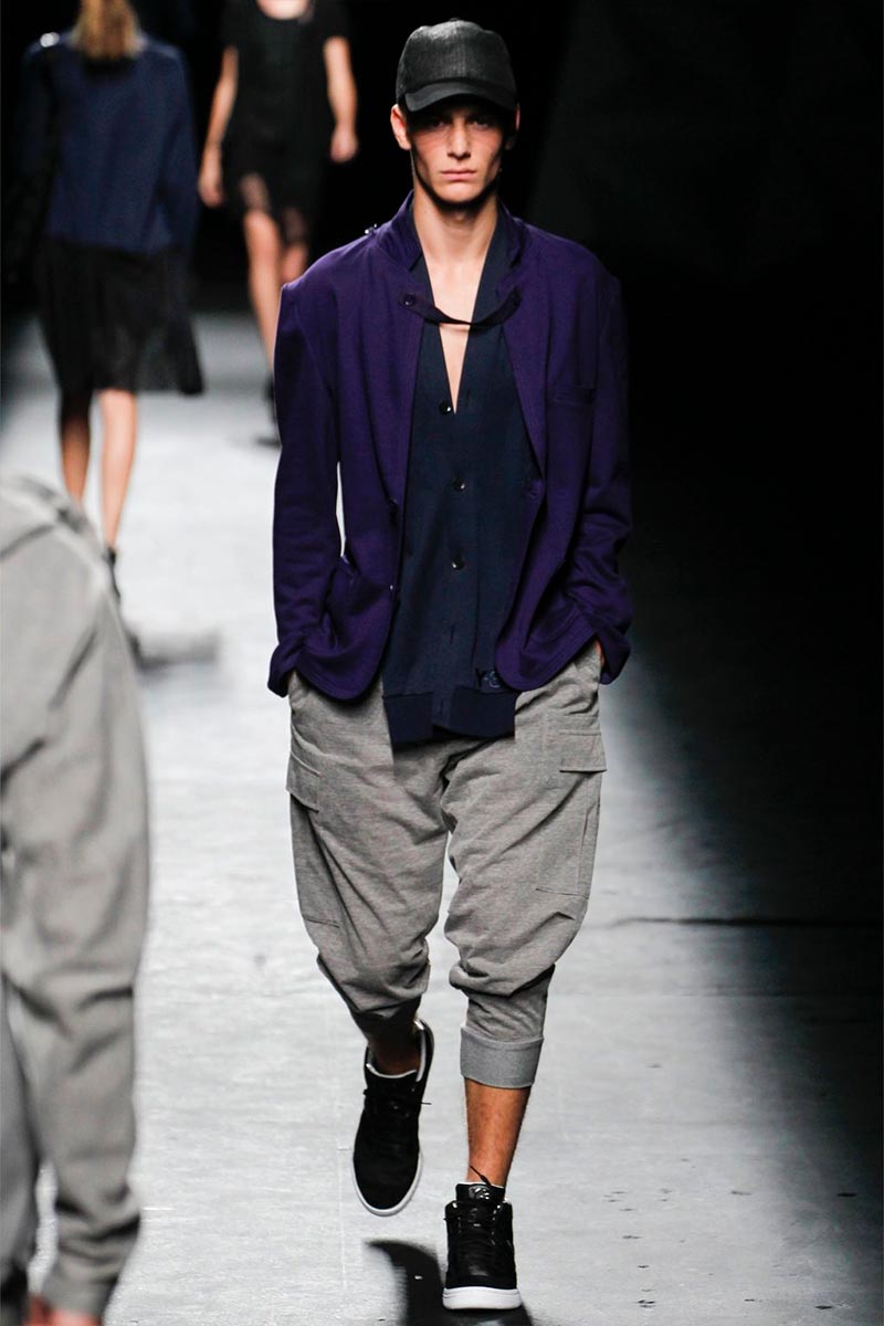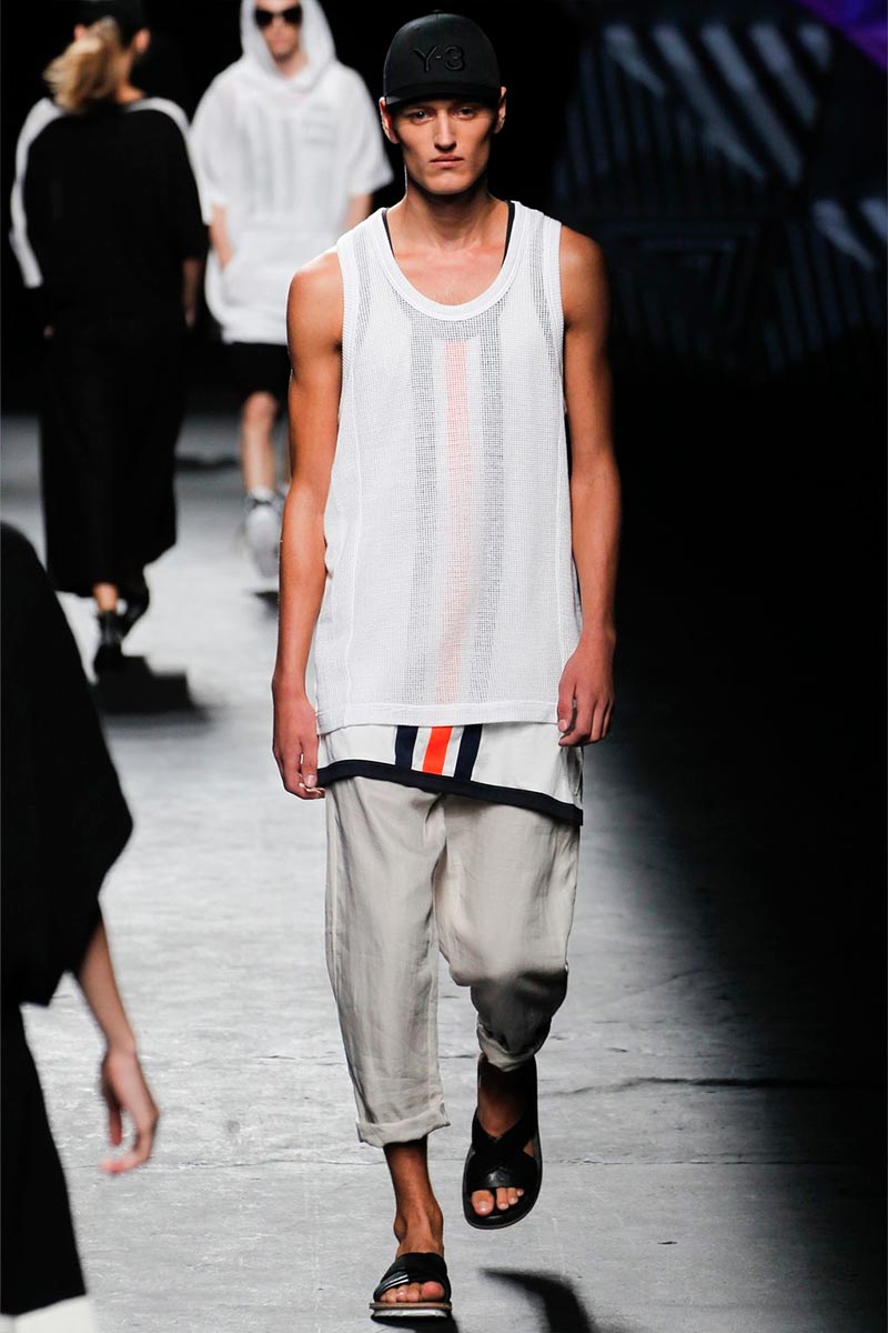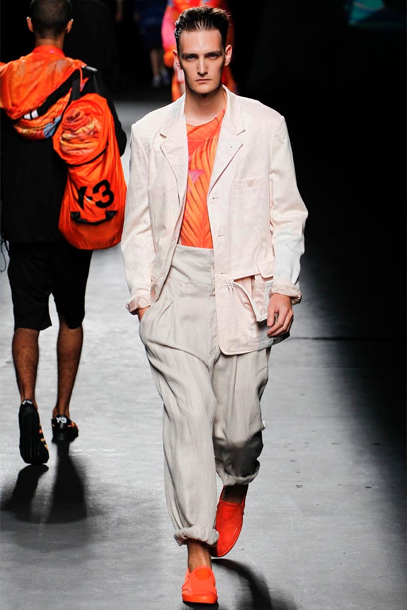 The Y-3 Spring/Summer 2013 collection explored iconic elements of the label’s pioneering aesthetic: the acid-bright prints; the bold, voluminous silhouettes; the graphic three-stripe motif; and the influential breakthroughs in footwear and apparel. Yohji Yamamoto, the label’s designer, described an act of “walking backward into the future,” suggesting an unabashed embrace of all things Y-3. As artist Devan Harlan’s 3-D projections transformed the St. John’s Center space, models walked the runway to original music by Jiro Amimoto while a front-row crowd of David Beckham, Michael Stipe, A$AP Rocky, Anton Yelchin, Brook Lopez, Isabel Lucas, Lupe Fiasco, Jesse Williams, Natasha Bedingfield, Casey Spooner, and Laure Shang looked on. The collection sought to reexamine Y-3’s founding mission: to define the future of sport and style. First and foremost, this meant the inclusion of eye-bending graphic prints, designed by Mr. Hayashi, the imperial printmaker to the Japanese royal family (who also designed the now-iconic hibiscus print found in Y-3’s debut 2003 collection). This time, Hayashi produced three motifs—called “Feather,” “Water,” and “Thorn”—in brilliant hues of orange, blue, pink, and green. These prints swirled across everything from mesh parkas, baseball caps, and silk scarves to stretch tights, canvas totes, and ruffle gloves. In similarly graphic fashion, Y-3 deployed the adidas three-stripe motif to dramatic effect: emblazoning it in varying widths on billowing coats, pleated skirts, and bold accessories.