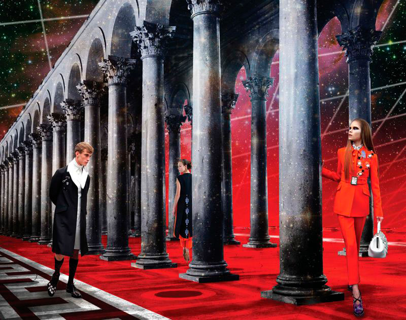 Prada have just released their “Real Fantasies” Lookbook for the Fall/Winter season. The lookbook is a creative pop-up scrap book of inspiration behind the collection, featuring the models wearing the most stand out designs from the collection. Prada projects the future of fashion as a retrofitted past. Set within a dystopian society of machines and jagged geometries, genetically perfected clones roam digital colonies. Each scene depicts an antiquated landscape within a galaxy of characters engrossed in oblique and possibly deviant power dynamics.