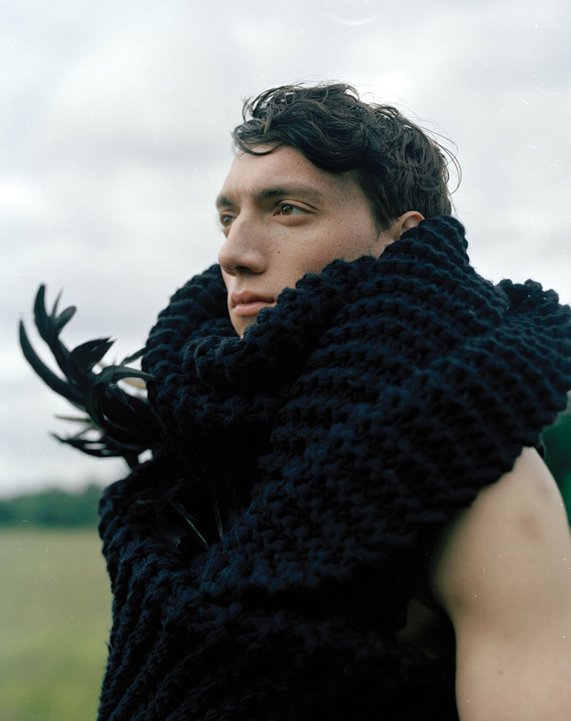 Francesco wears Scarf by Rory Parnell-Mooney customised with feathers