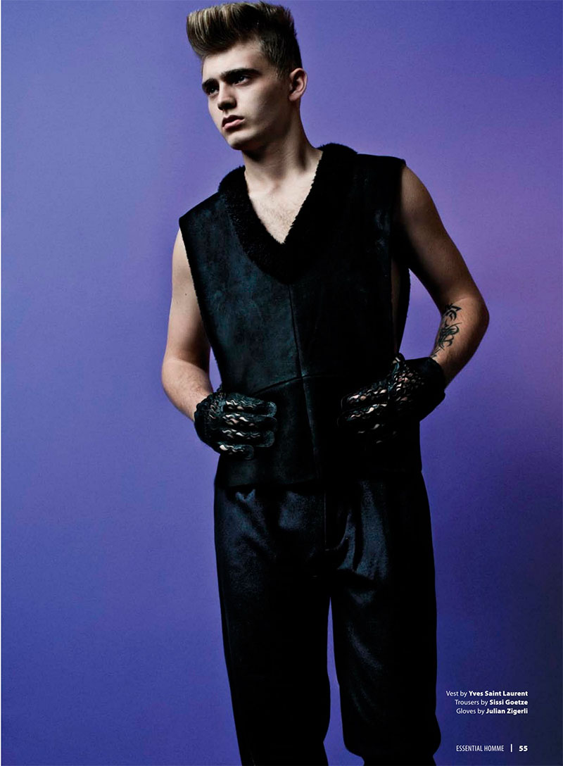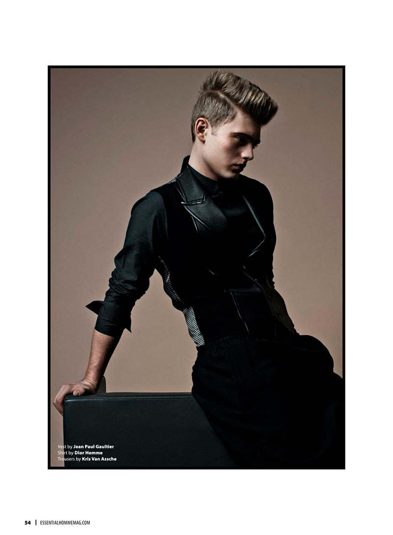 Tom Lander shot by Arcin Sagdic and styled by Bodo Emile with pieces from Jean Paul Gaultier, Issey Miyake, Dior Homme and more, for Essential Homme.