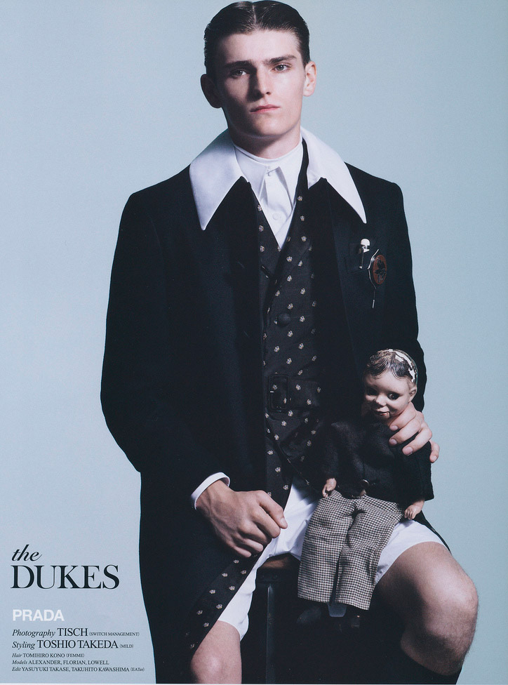 Alexander Beck, Florian Van Bael and Lowell Tautchin shot by Tisch and styled by Toshio Takeda with pieces from Prada’s Fall/Winter 2012 collection for the October 2012 issue of HUgE magazine.