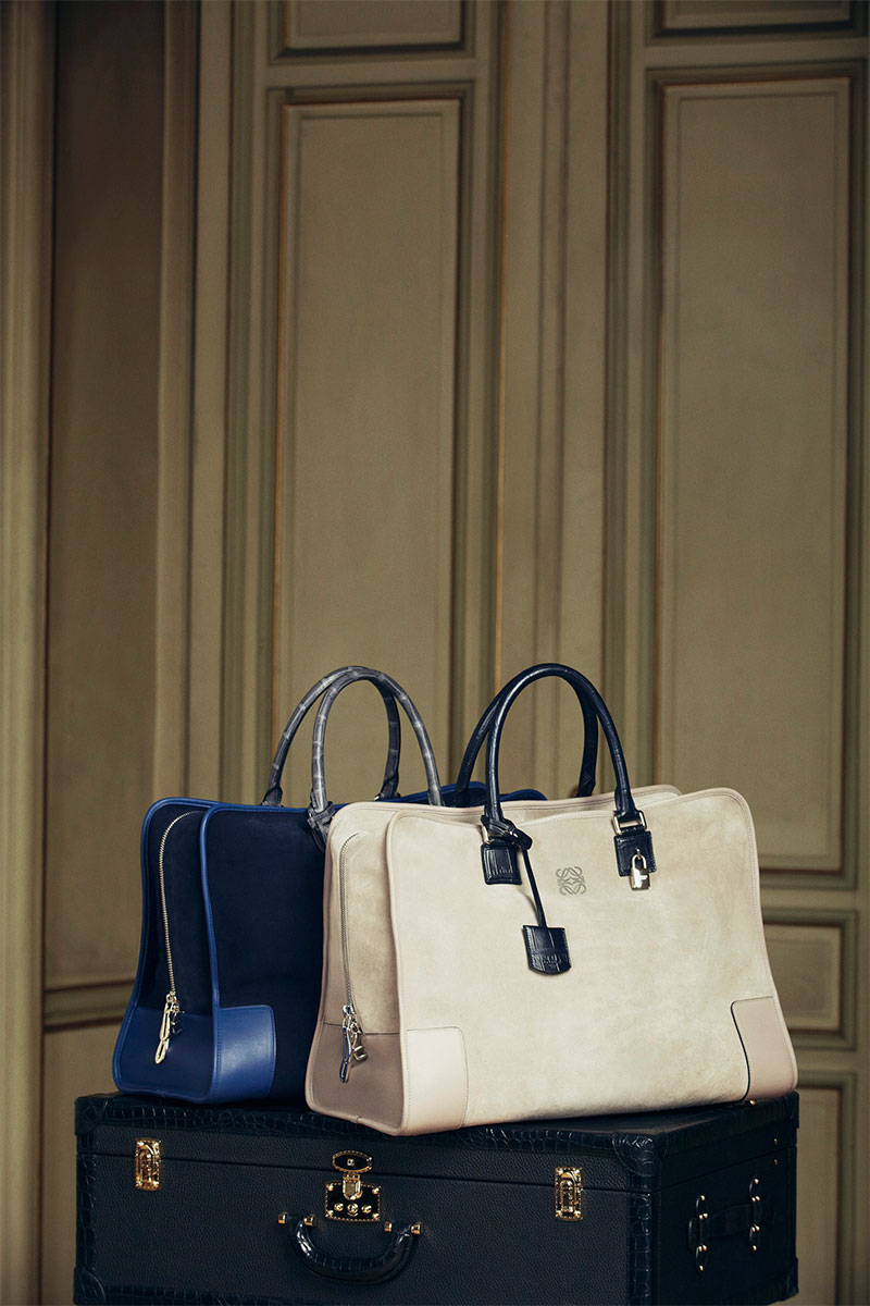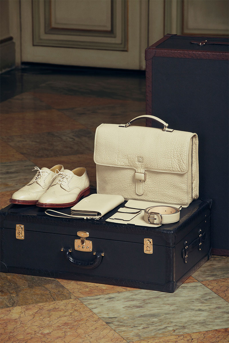 The clothing collection is of course dominated by leather, the cornerstone of Loewe, underlining the brand’s reputation for creating the softest napa pieces, but also showcasing Loewe’s expertise across a wide range of skins. The collection features a lightweight parka in suede; a raglan sleeved varsity jacket with the body in crocodile; a blazer in Loewe’s lightest napa, specifically cut to keep the weight as low as possible; an artist’s jacket in bonded suede and napa, which fastens with large metal hooks; and a biker jacket in a goatskin that’s soft to the touch while being tough and protective.