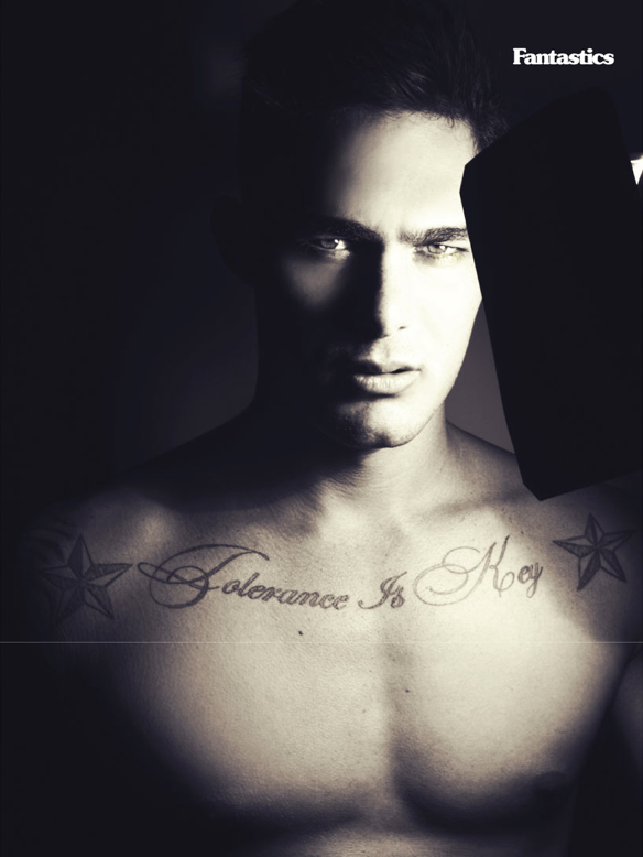 Daniel Aleksić black and white fashion portrait by Ferran Casanova in Barcelona studio