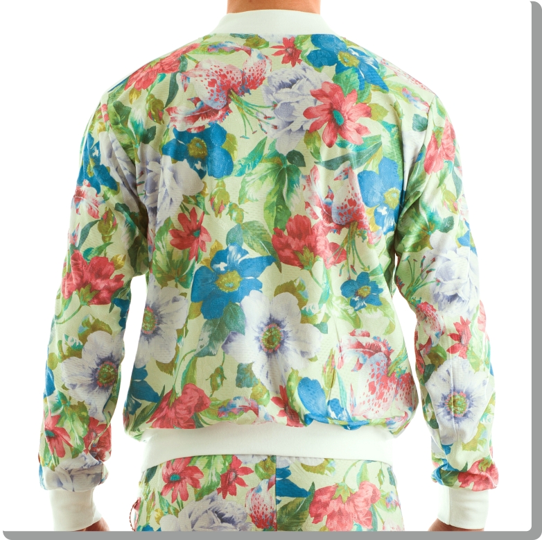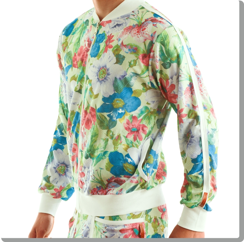 Cool, super fashionable bomber jacket in neo-retro floral design. Beautifully textured high-quality Italian athletic mesh-look fabric with white trim, zip front, low collar, side pockets and discreet Modus Vivendi detail at the cuff.