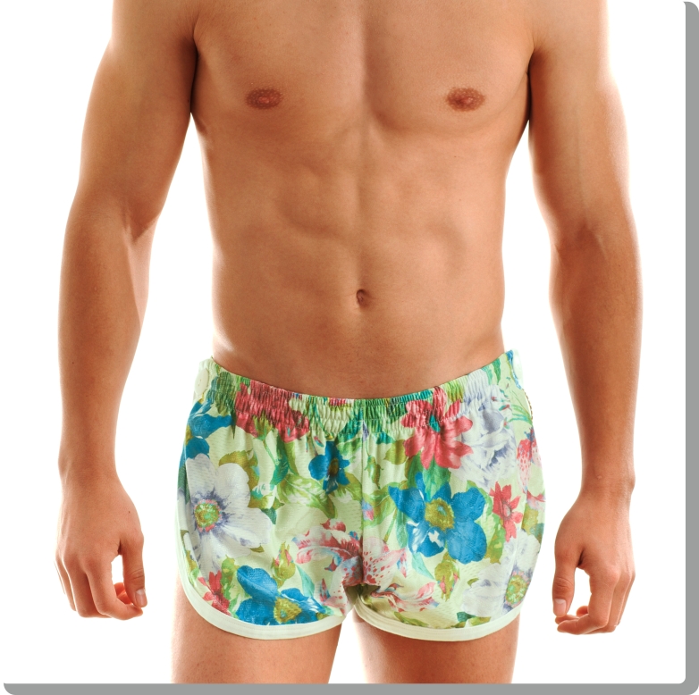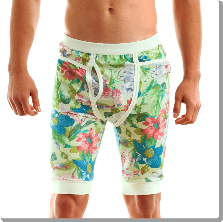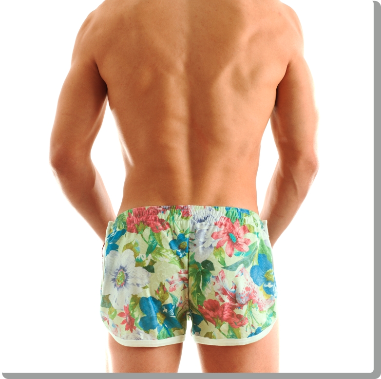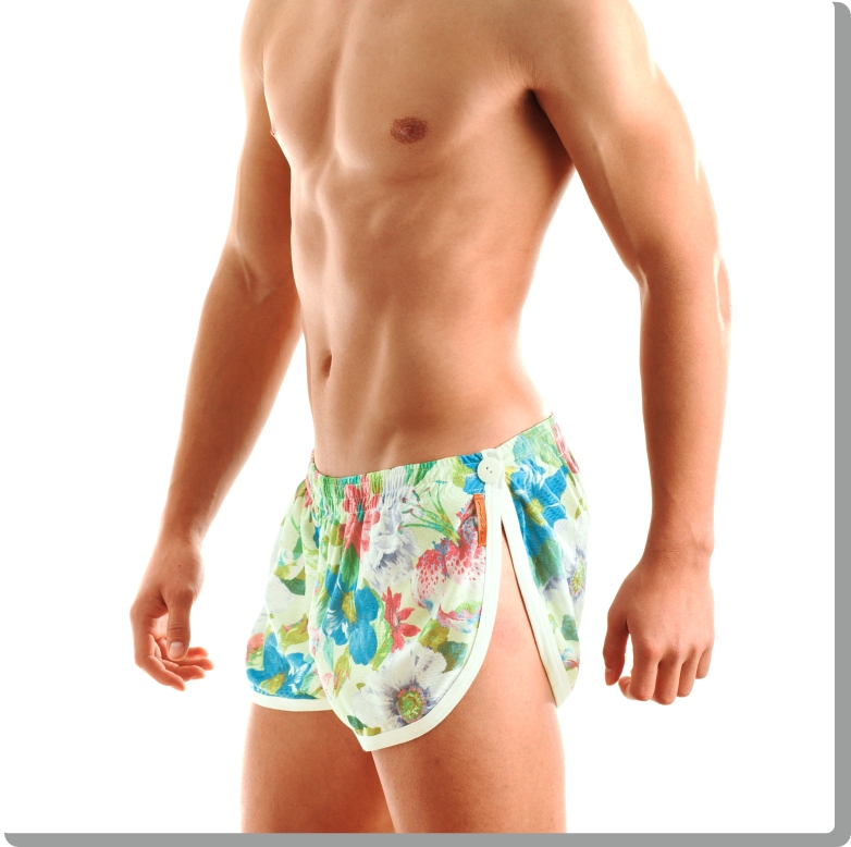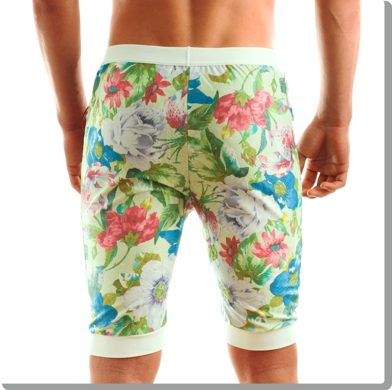 Funky, super comfortable jogging cut shorts in neo-retro floral design. Beautifully textured high-quality Italian athletic mesh-look fabric with white trim, loose fit and extra high-cut thigh. Fully functional and fun, Modus Vivendi style, with buttons to each side.Floral Bermuda green