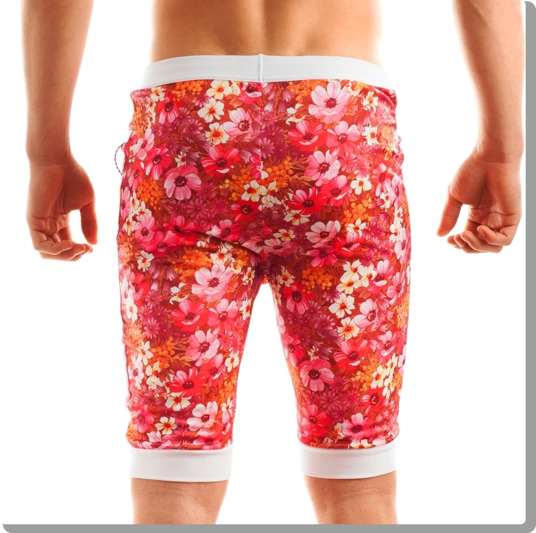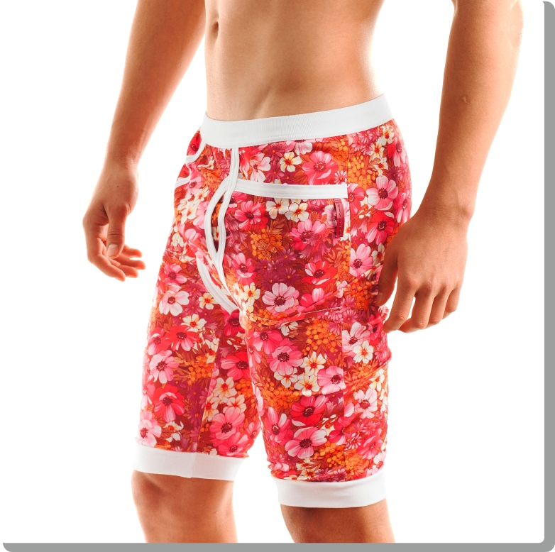 Bermuda style pants in full-on red-fuchsia-orange combination floral pattern. High-quality Italian fabric with white trim, Y-front and deep pockets. Soft cotton elasticated waistband and a discreet Modus Vivendi detail at the side.