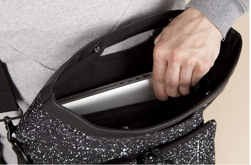 The bag is delivered in a package together with two smaller pouches designed to carry your phone, wallet or charger; and the newly developed foldable shopping bag to transport your goods if extra space is required. Both units are attachable on the inside or outside of the shoulder bag making it possible to design your bag according to your needs. The integrated, padded laptop case will allow you to carry your laptop without any concerns.