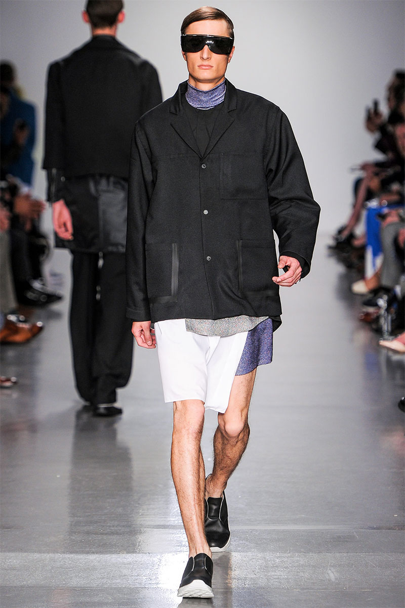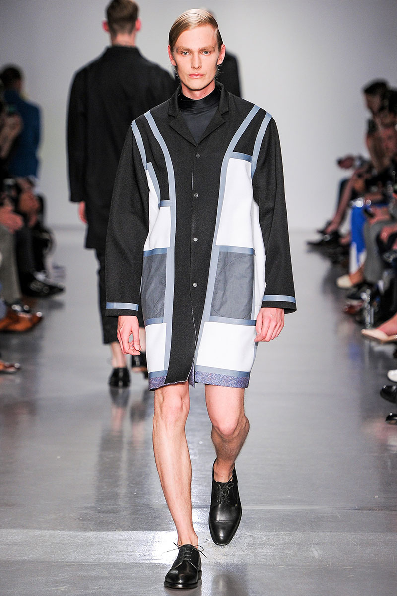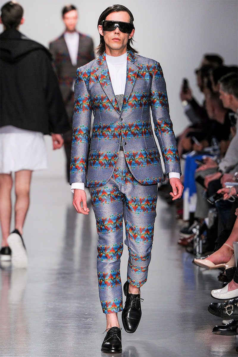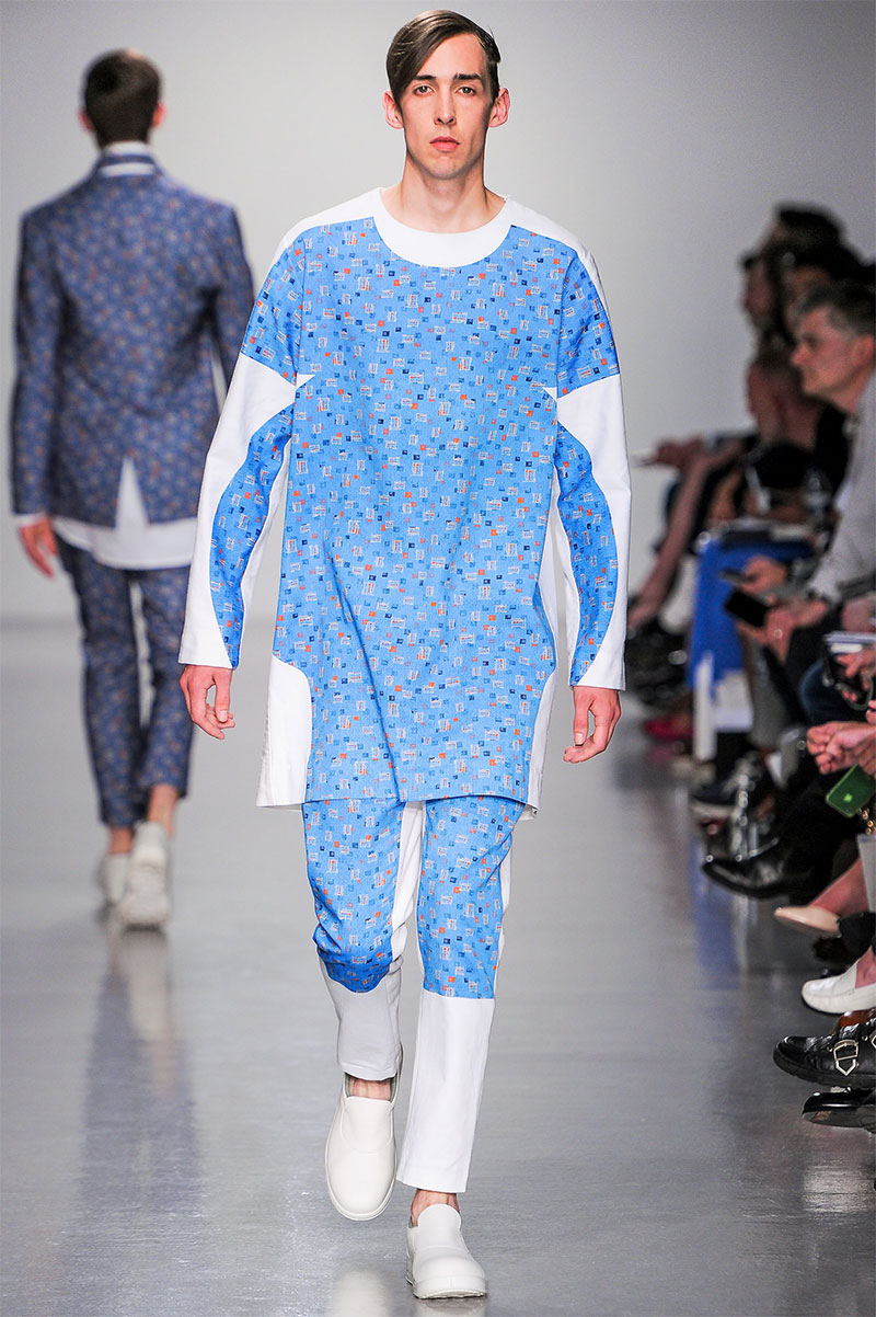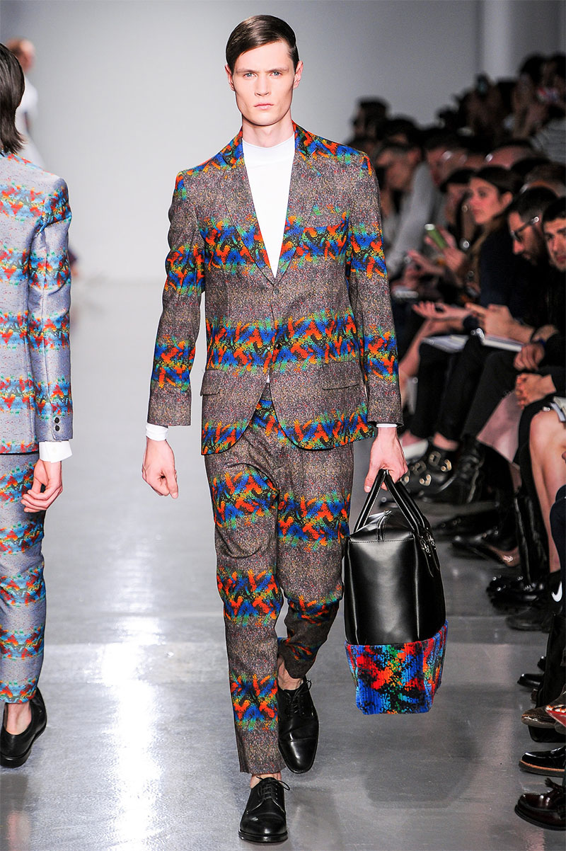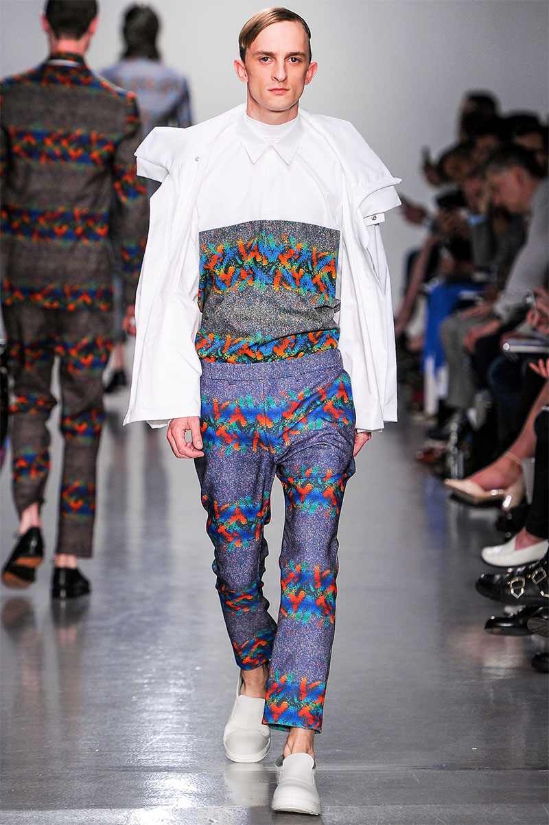 Agi & Sam presented their Spring/Summer 2014 collection during London Collections: Men, featuring a strong emphasis on print and color, oversized silhouettes and some geometric patterns.