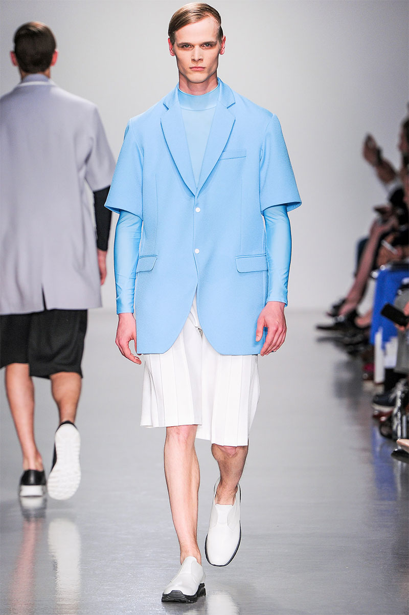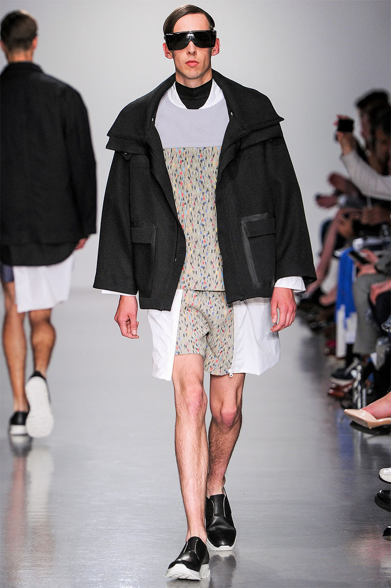 Agi & Sam presented their Spring/Summer 2014 collection during London Collections: Men, featuring a strong emphasis on print and color, oversized silhouettes and some geometric patterns.