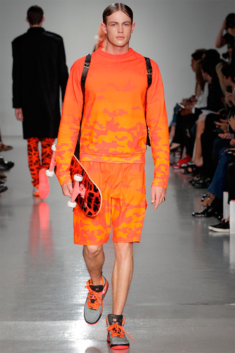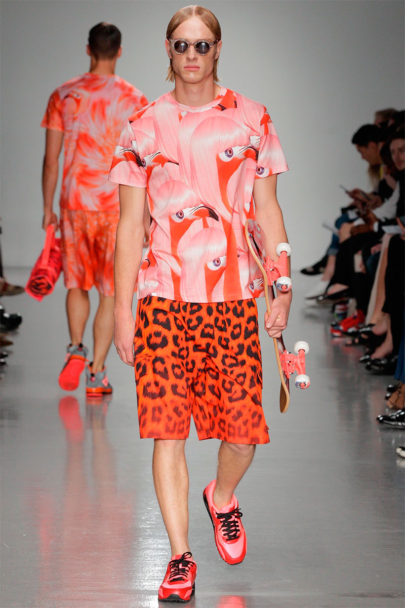 Katie Eary presented her Spring/Summer 2014 collection during London Collections: Men. Full of wild flamboyance, the collection featured the models carrying skateboards under their arms and wearing dazzling looks with pink flamingos wearing pink wigs and leopard print.