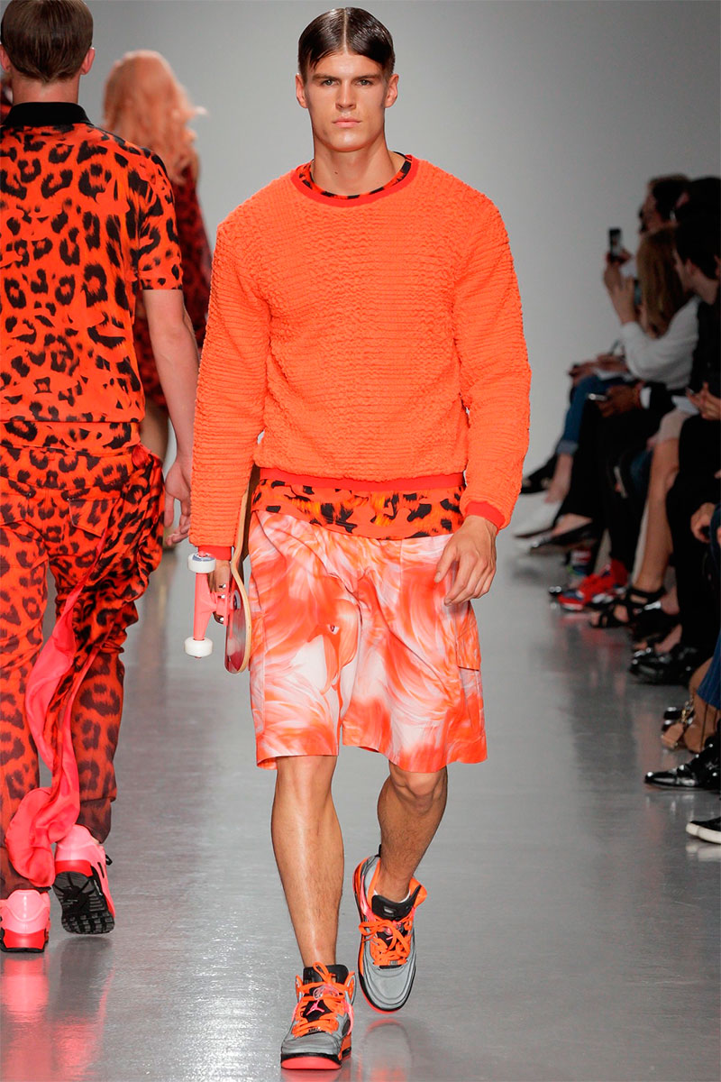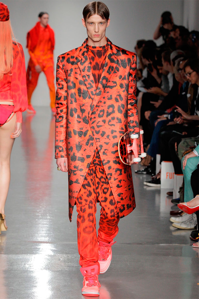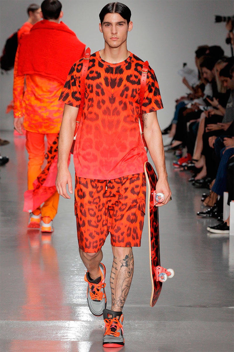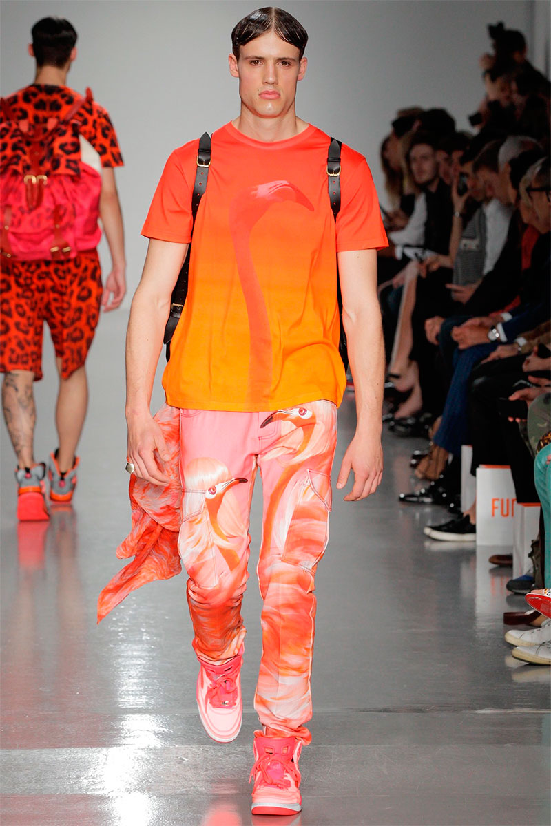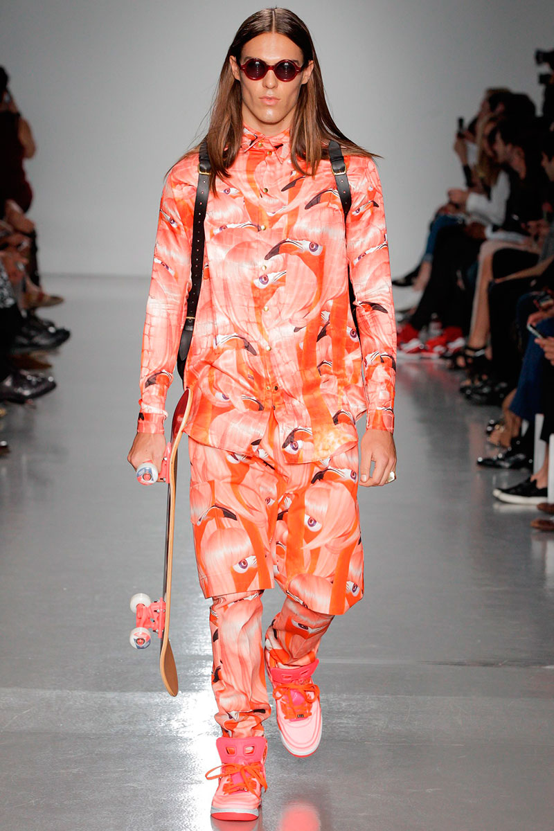 Katie Eary presented her Spring/Summer 2014 collection during London Collections: Men. Full of wild flamboyance, the collection featured the models carrying skateboards under their arms and wearing dazzling looks with pink flamingos wearing pink wigs and leopard print.