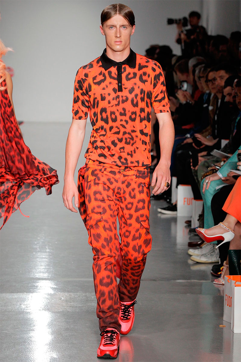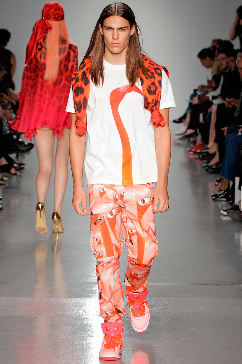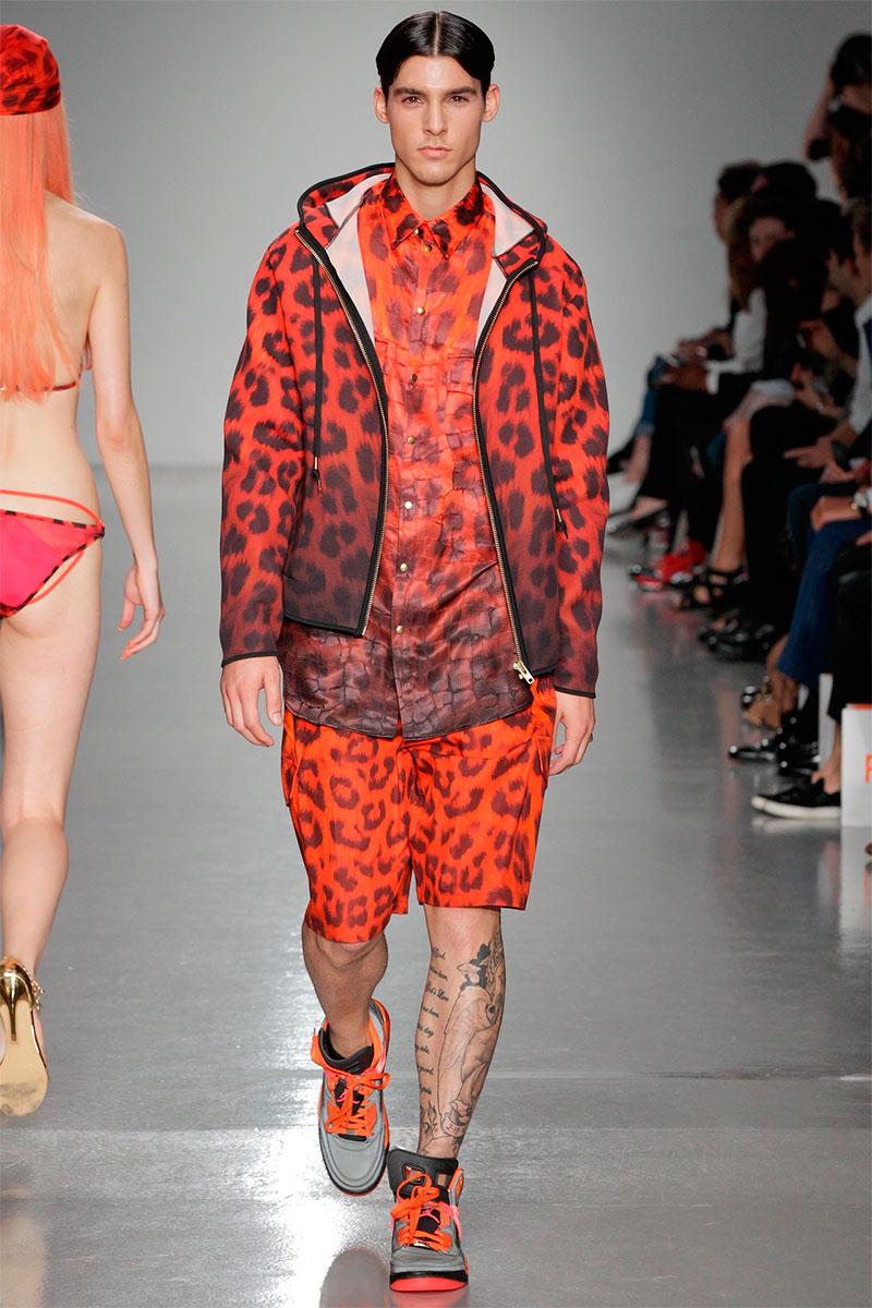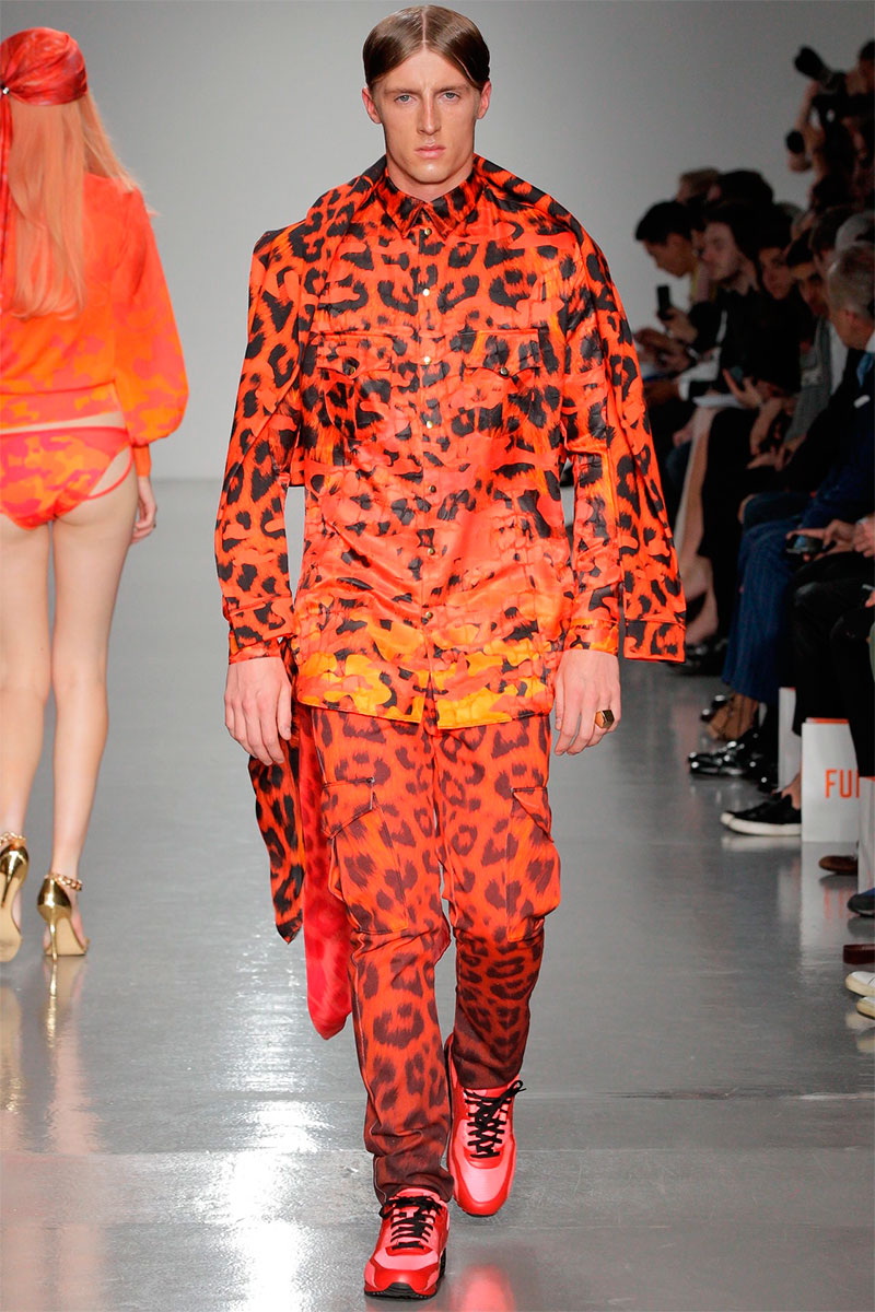 Katie Eary presented her Spring/Summer 2014 collection during London Collections: Men. Full of wild flamboyance, the collection featured the models carrying skateboards under their arms and wearing dazzling looks with pink flamingos wearing pink wigs and leopard print.