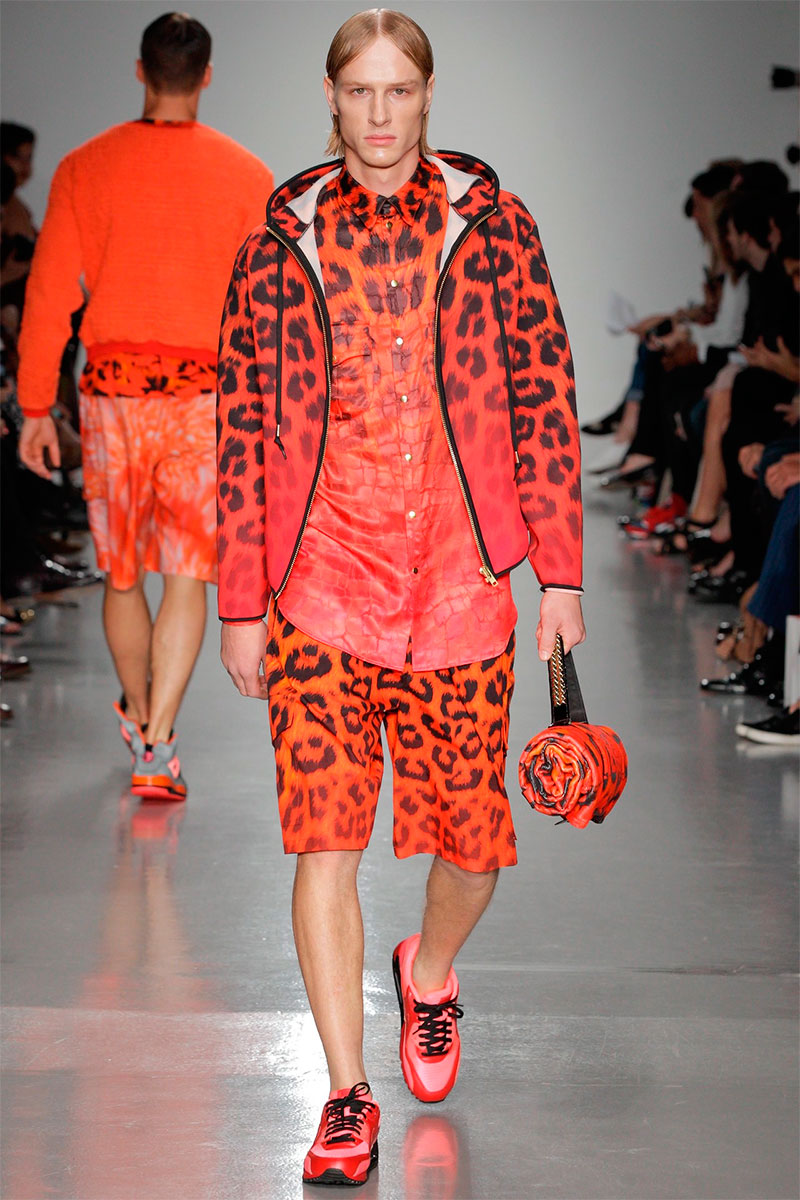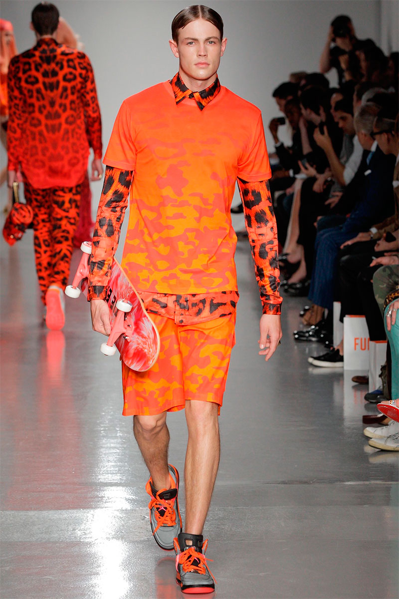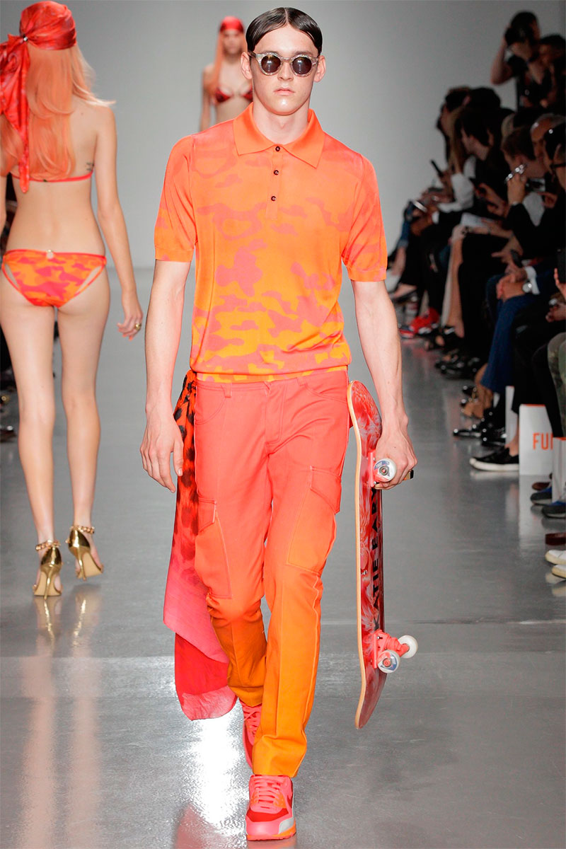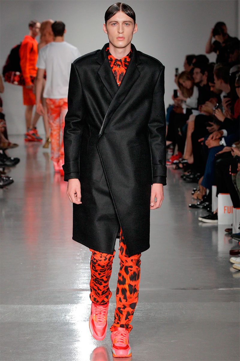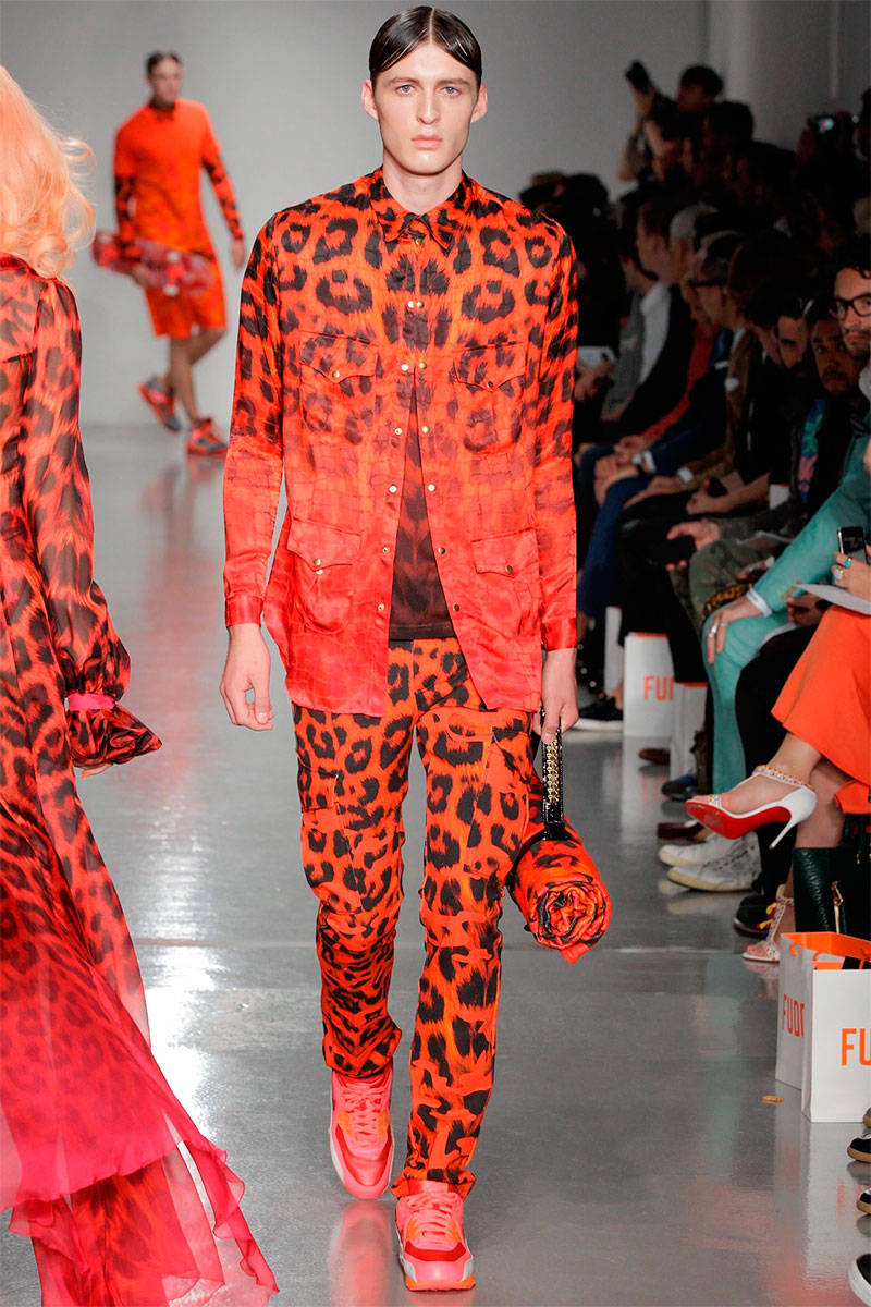 Katie Eary presented her Spring/Summer 2014 collection during London Collections: Men. Full of wild flamboyance, the collection featured the models carrying skateboards under their arms and wearing dazzling looks with pink flamingos wearing pink wigs and leopard print.