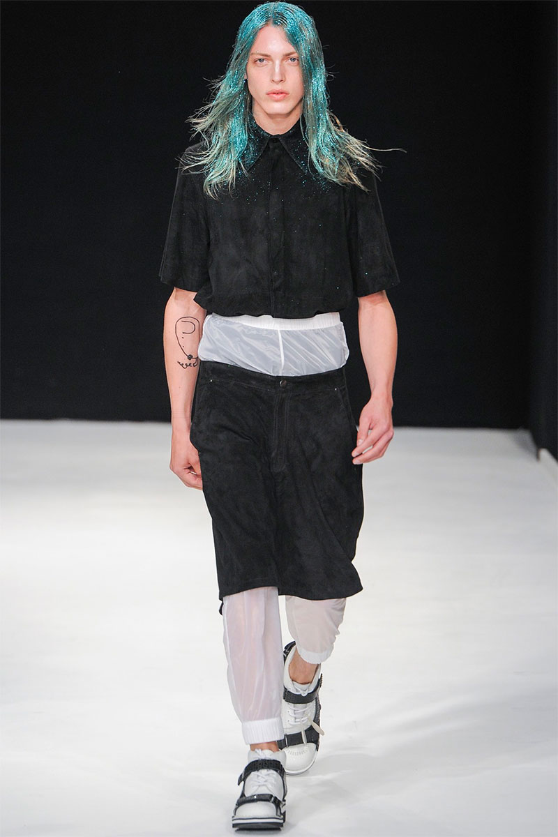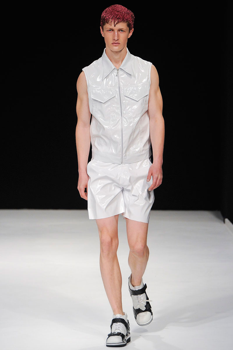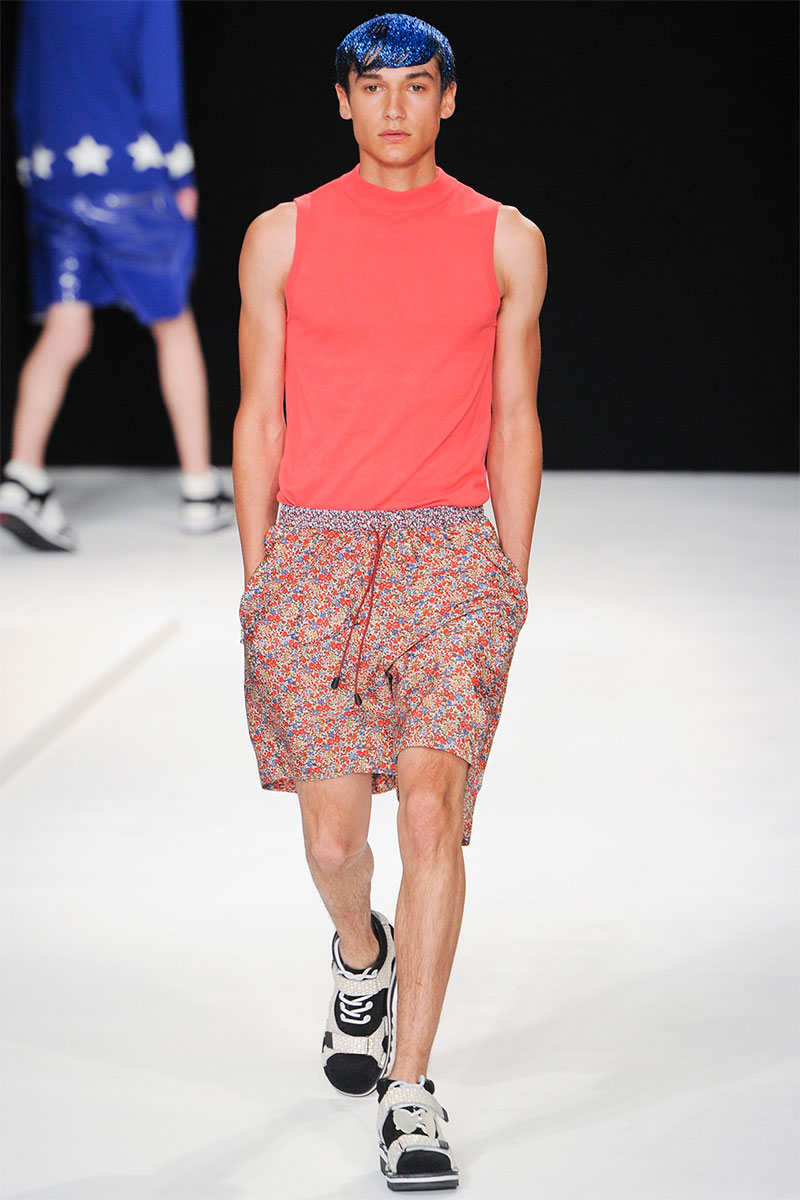 Christopher Shannon presented his Spring/Summer 2014 collection during London Collections: Men, featuring some futuristic looks, vibrant colors, florals and glitter sprayed barnets.