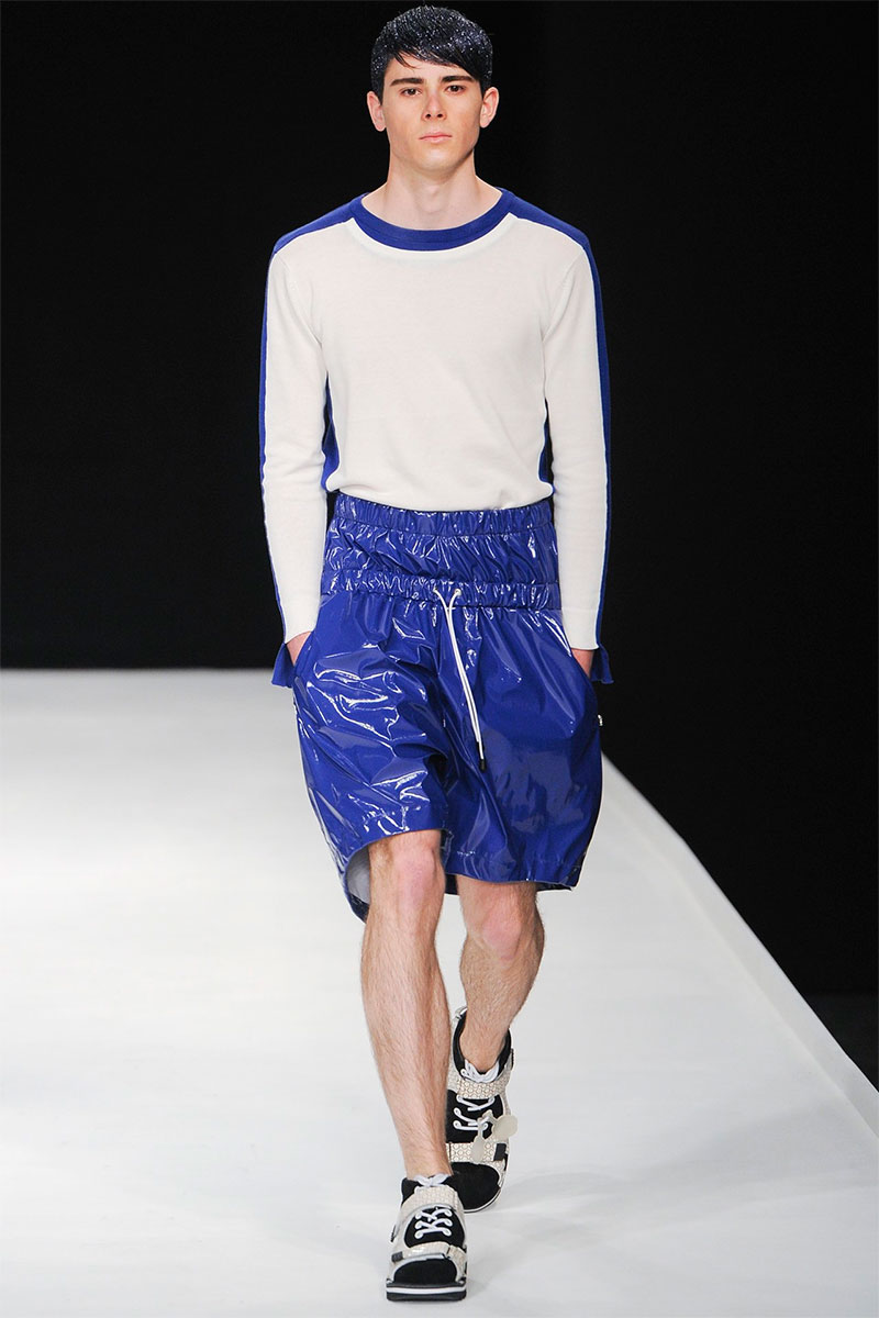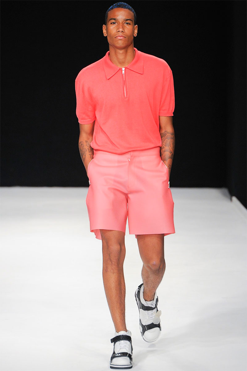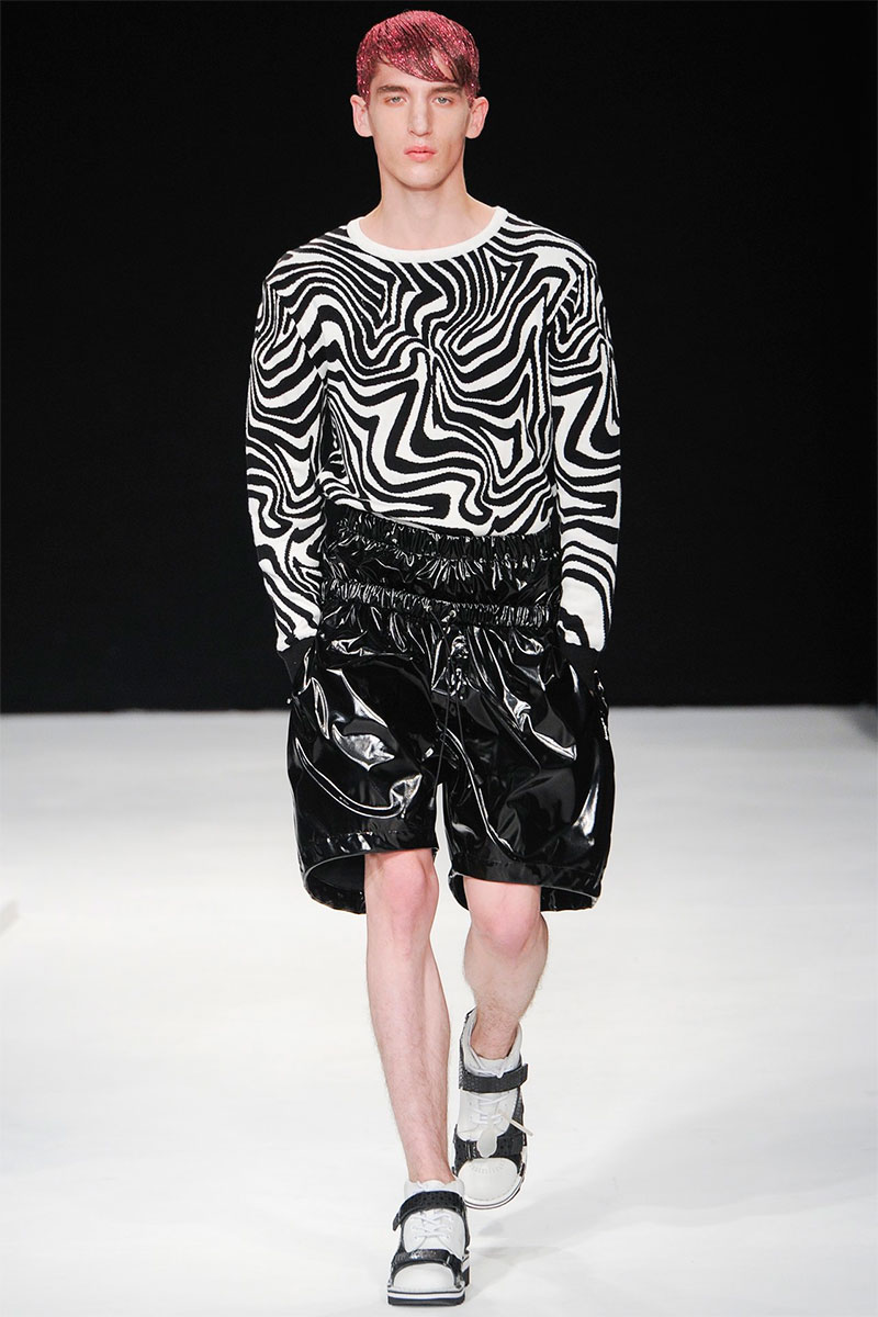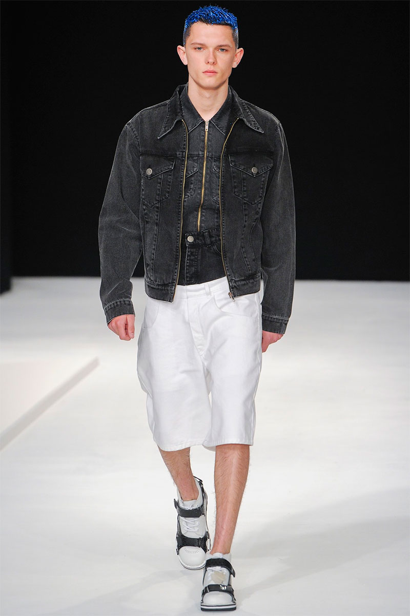 Christopher Shannon presented his Spring/Summer 2014 collection during London Collections: Men, featuring some futuristic looks, vibrant colors, florals and glitter sprayed barnets.