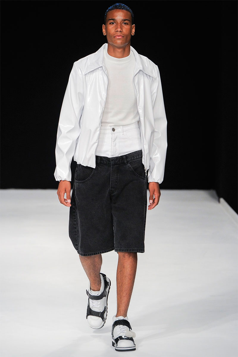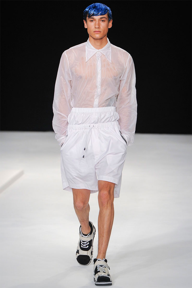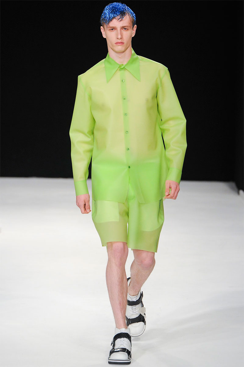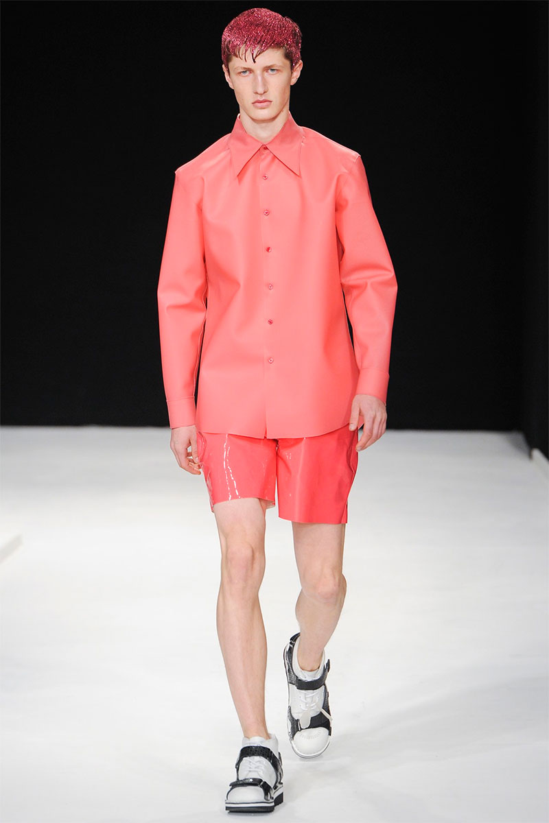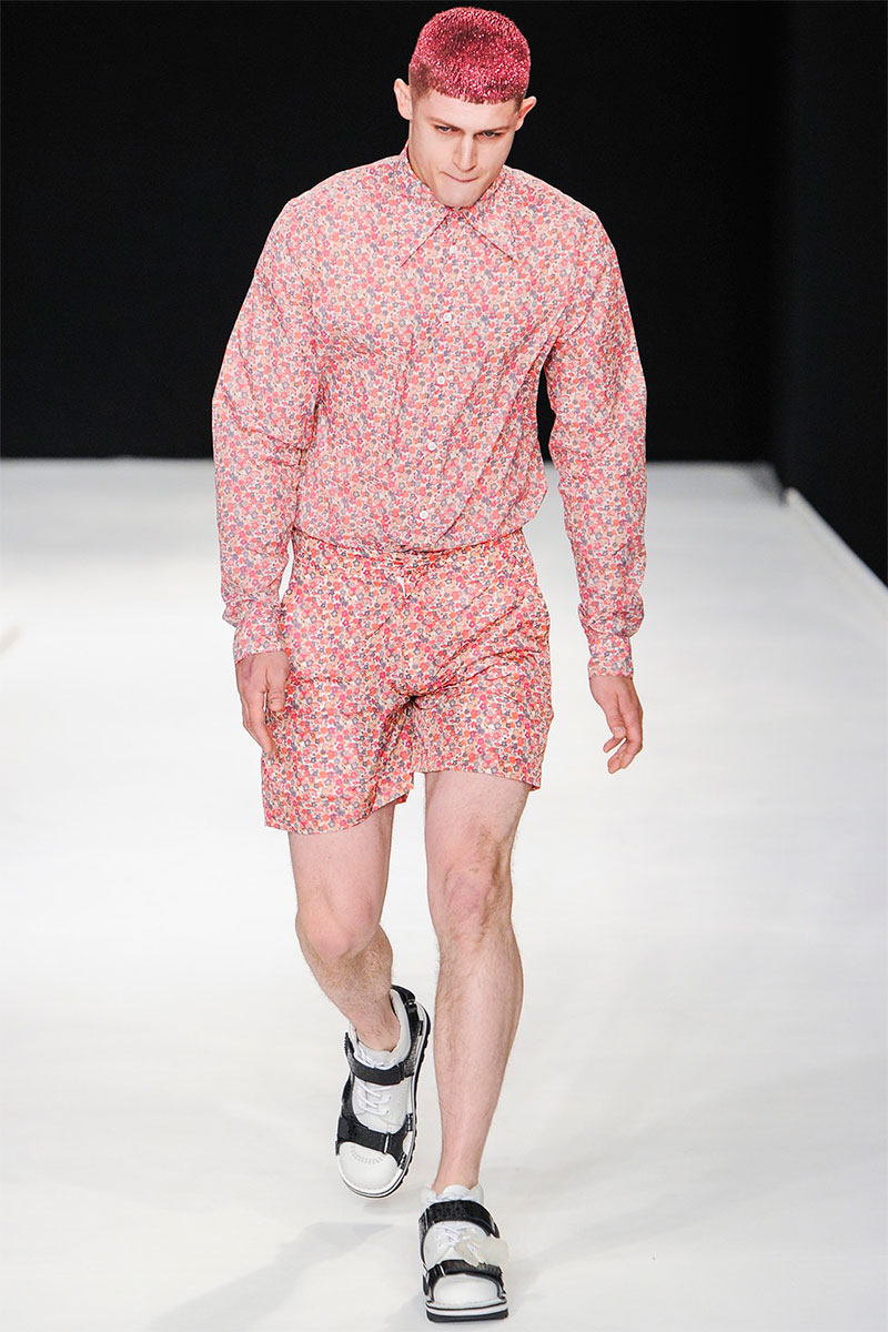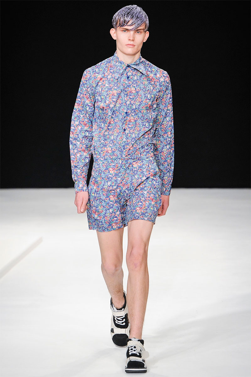 Christopher Shannon presented his Spring/Summer 2014 collection during London Collections: Men, featuring some futuristic looks, vibrant colors, florals and glitter sprayed barnets.