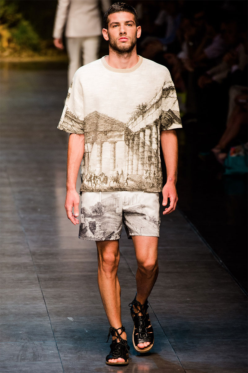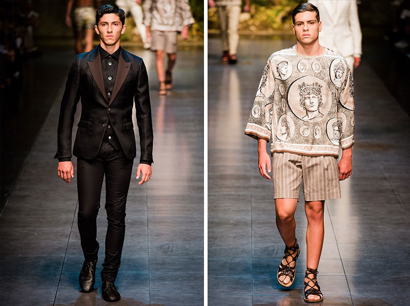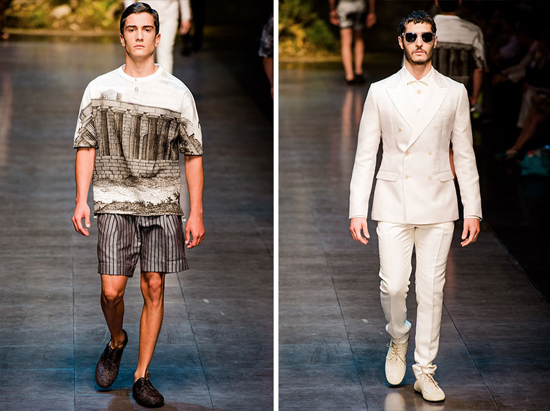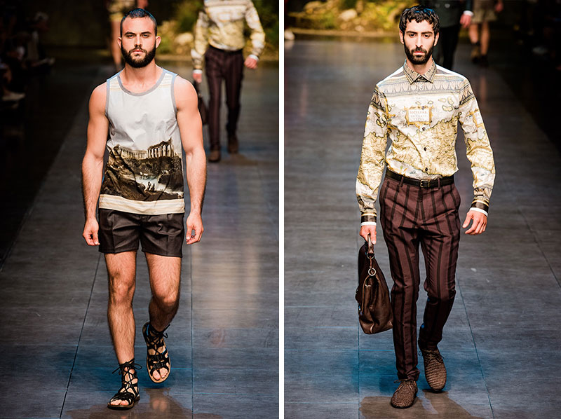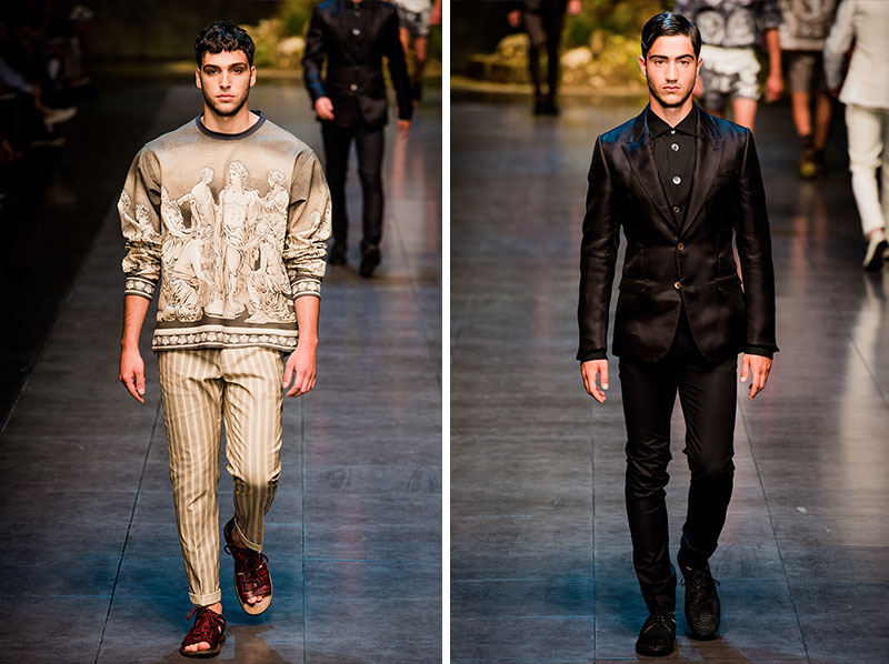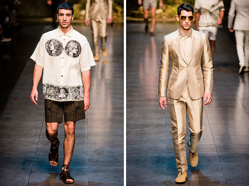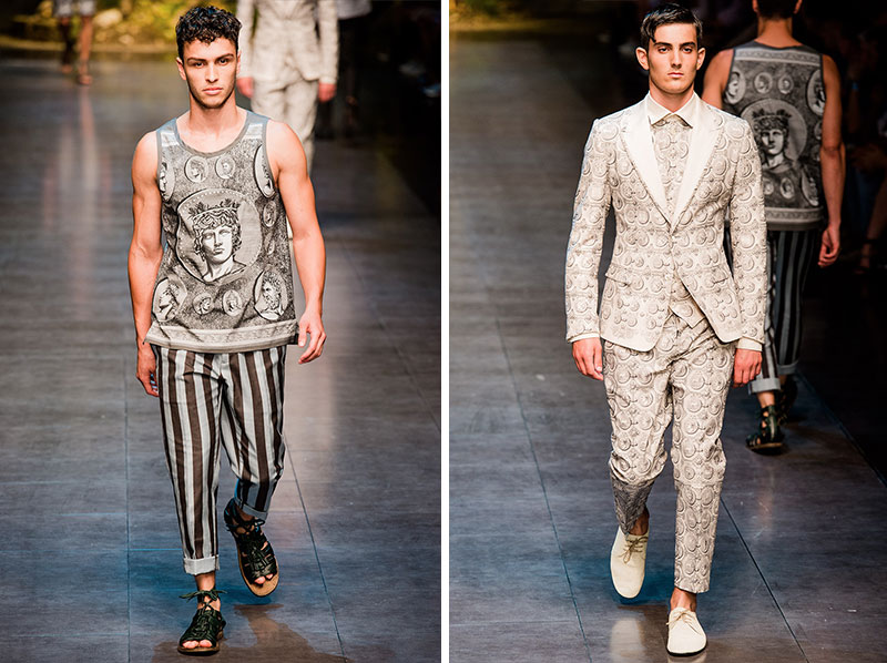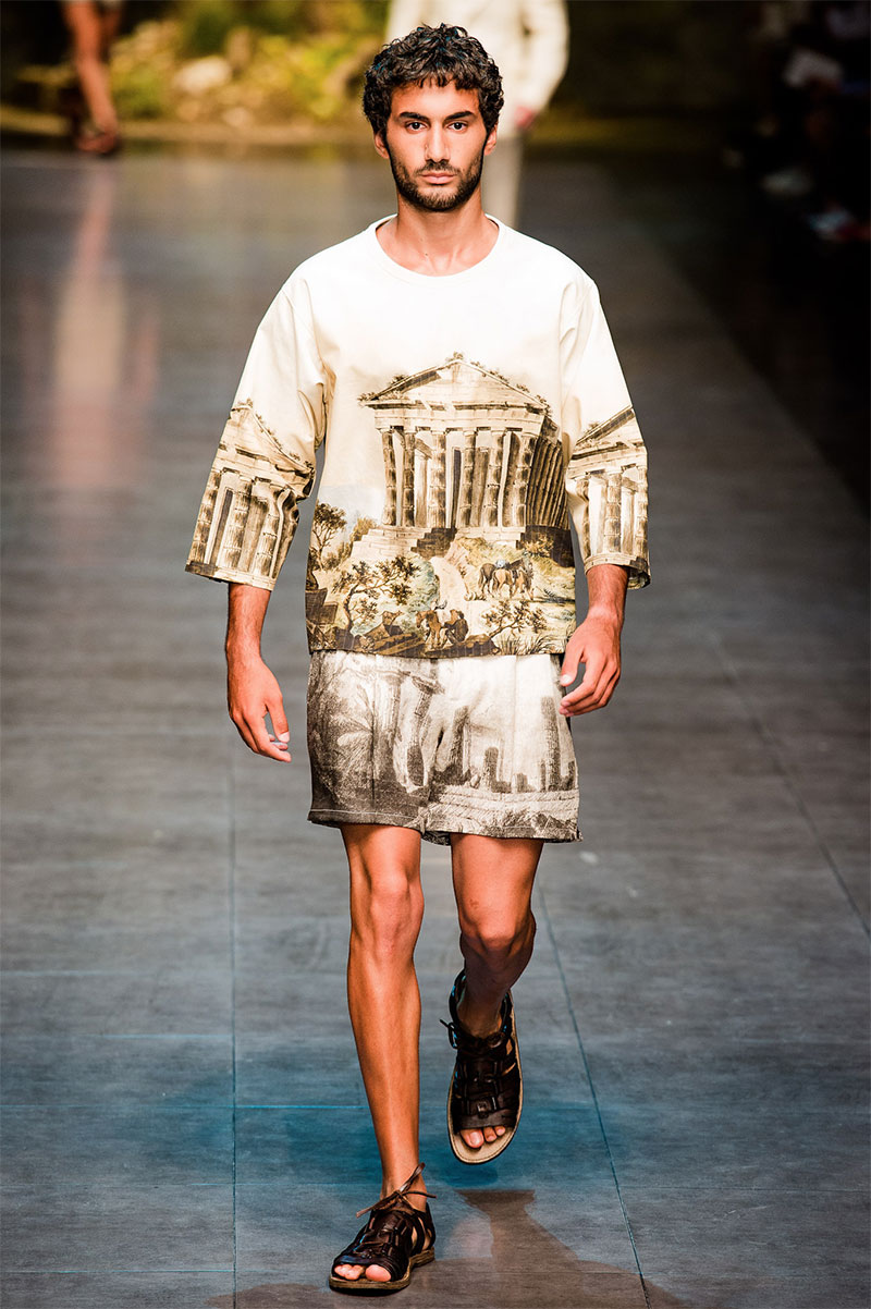 Domenico Dolce and Stefano Gabbana created a Spring/Summer 2014 collection inspired by Sicilian mythology, featuring prints of places such as the Valle dei Templi of Agrigento and the Tempio di Apollo of Syracuse, prints of antique gods such as those of Zeus and Apollo, and great tailoring.