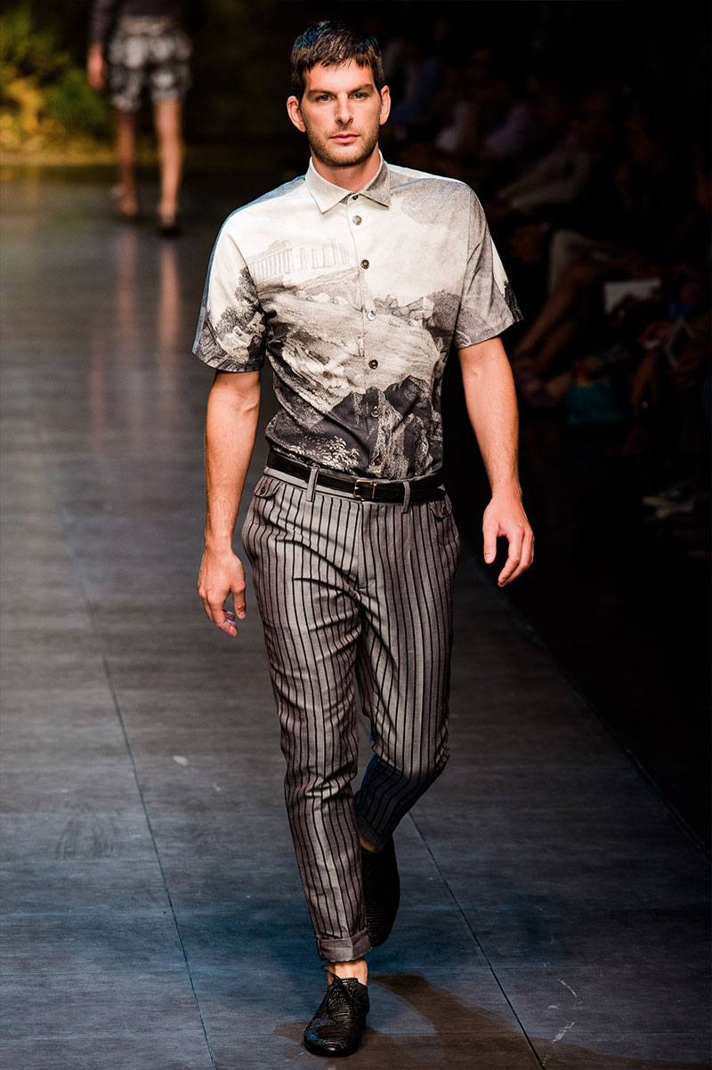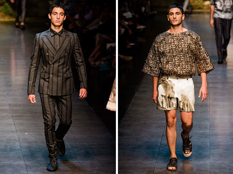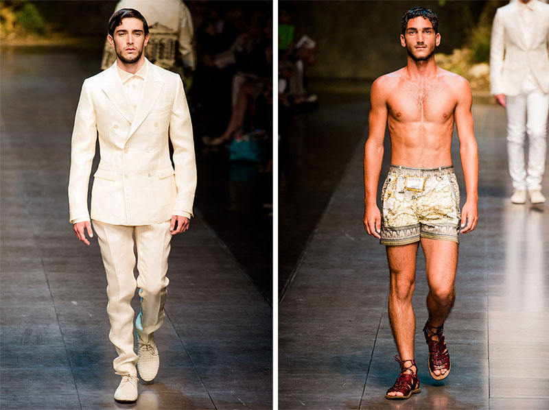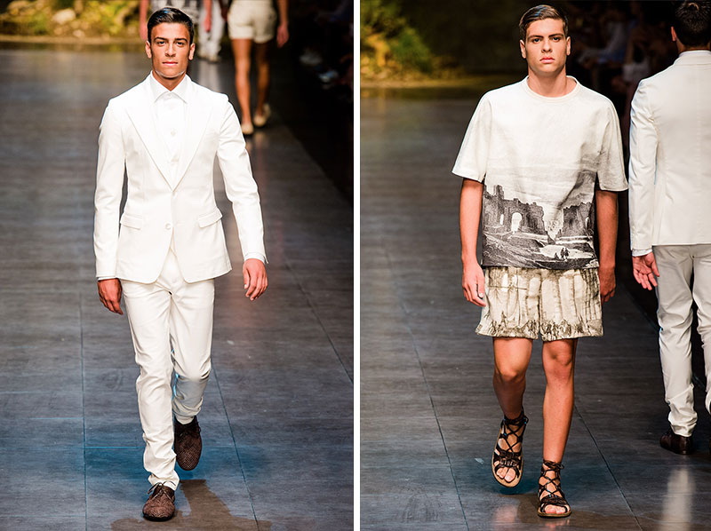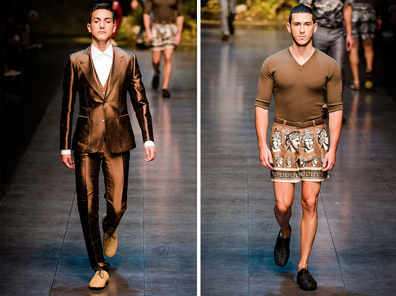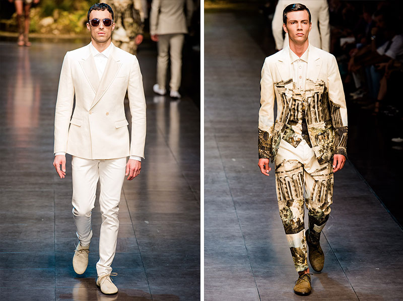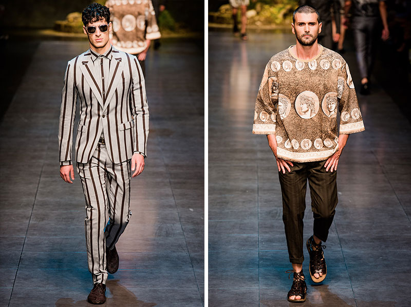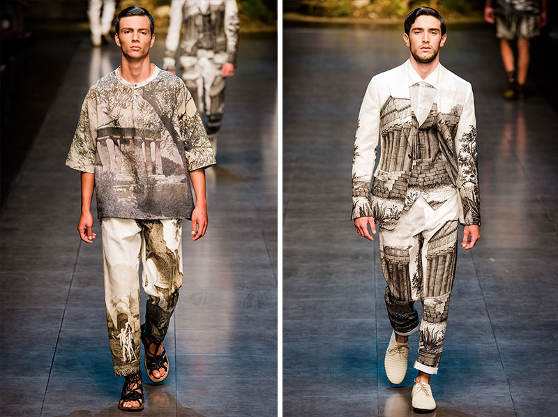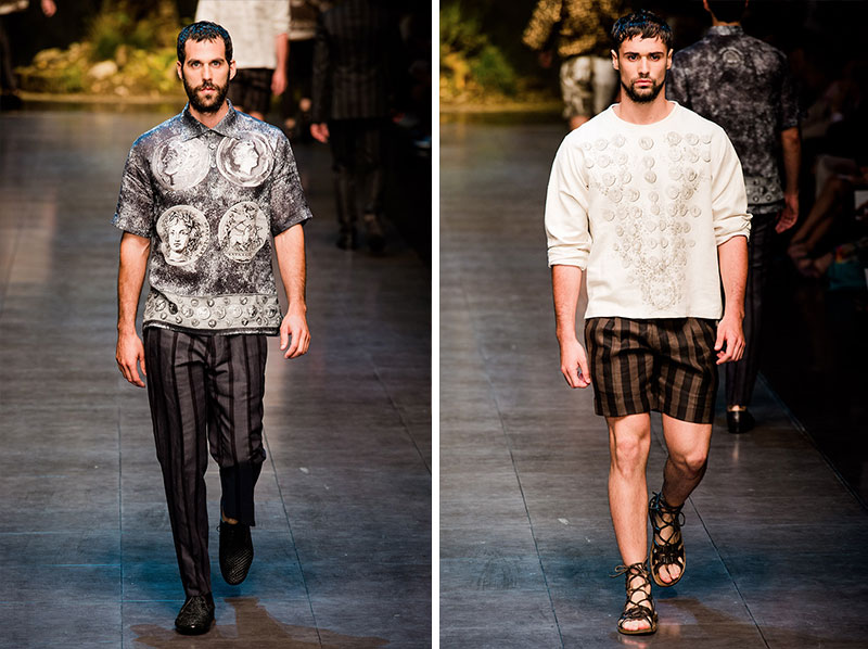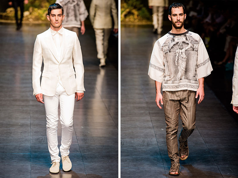 Domenico Dolce and Stefano Gabbana created a Spring/Summer 2014 collection inspired by Sicilian mythology, featuring prints of places such as the Valle dei Templi of Agrigento and the Tempio di Apollo of Syracuse, prints of antique gods such as those of Zeus and Apollo, and great tailoring.
