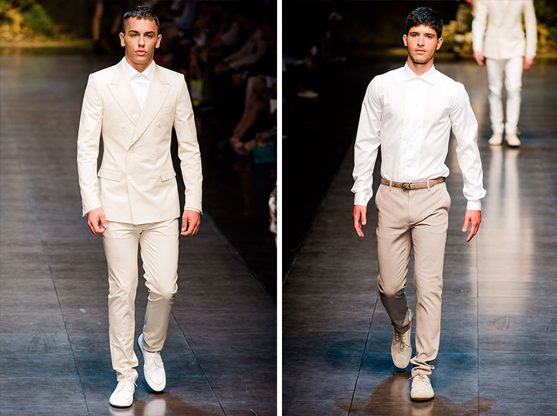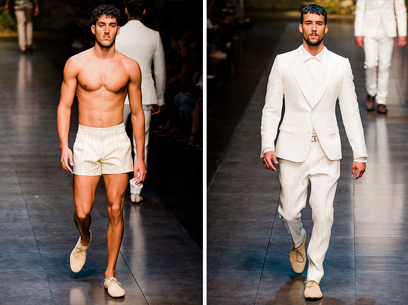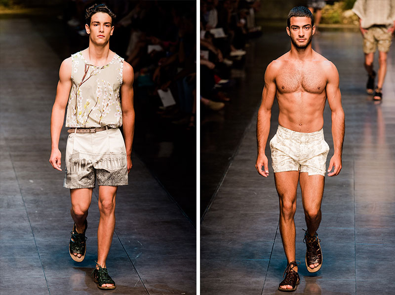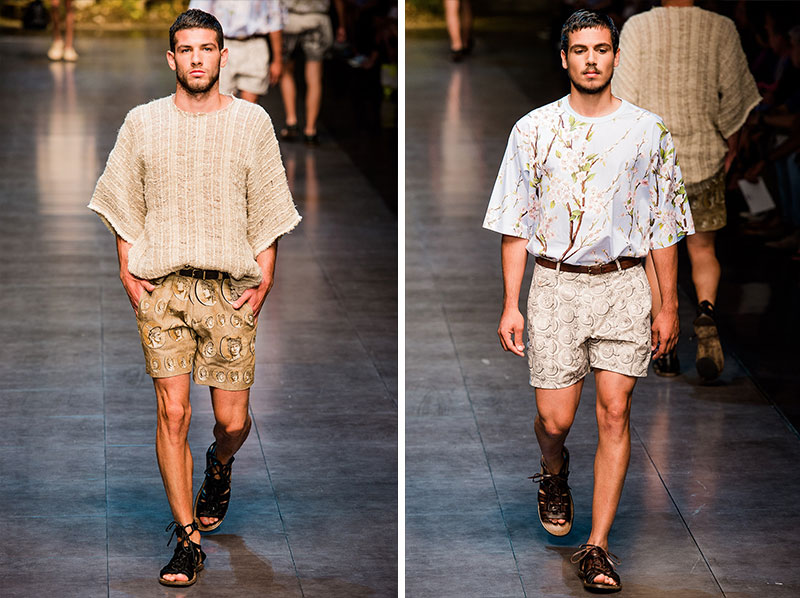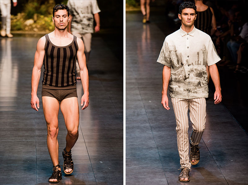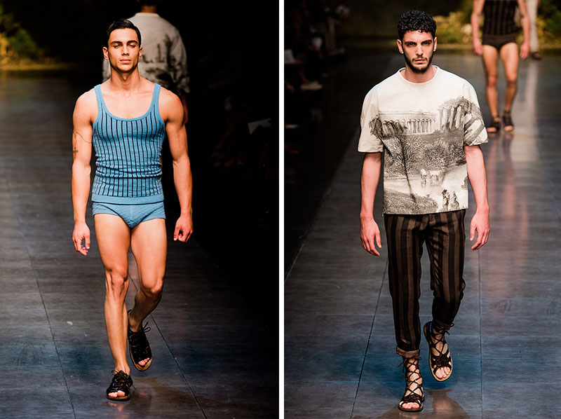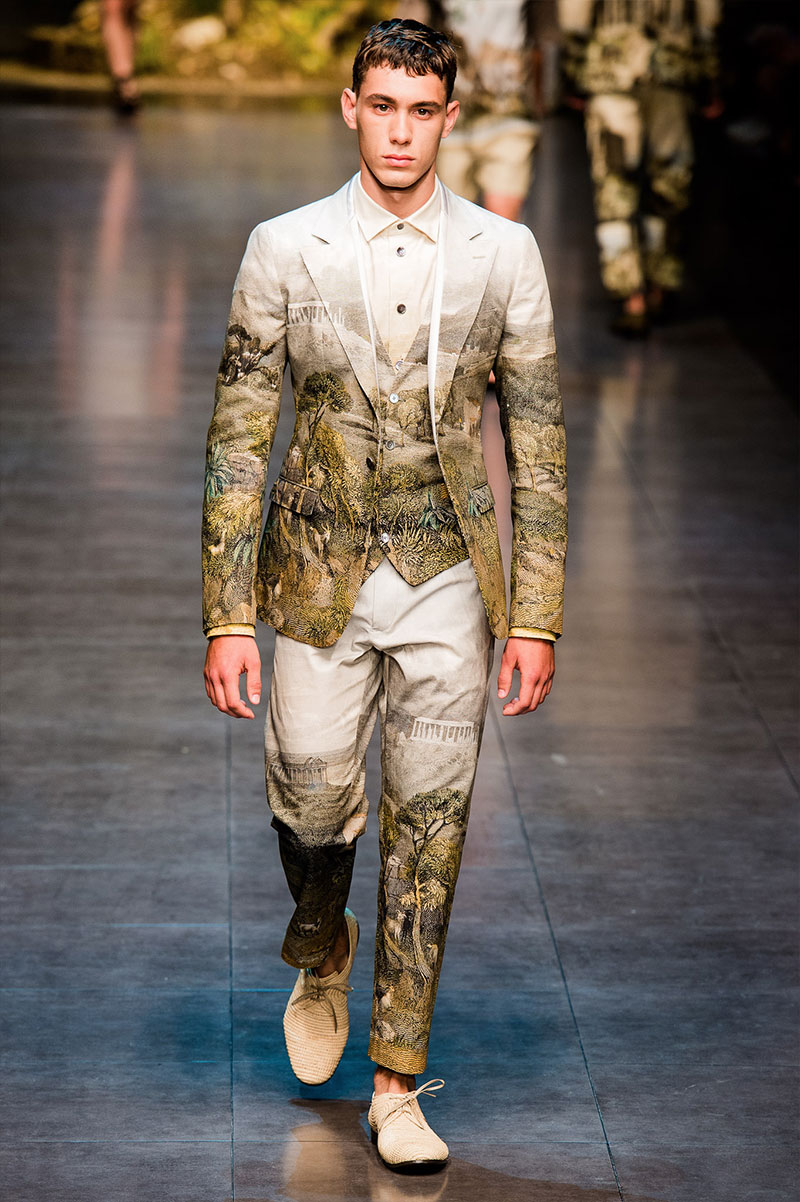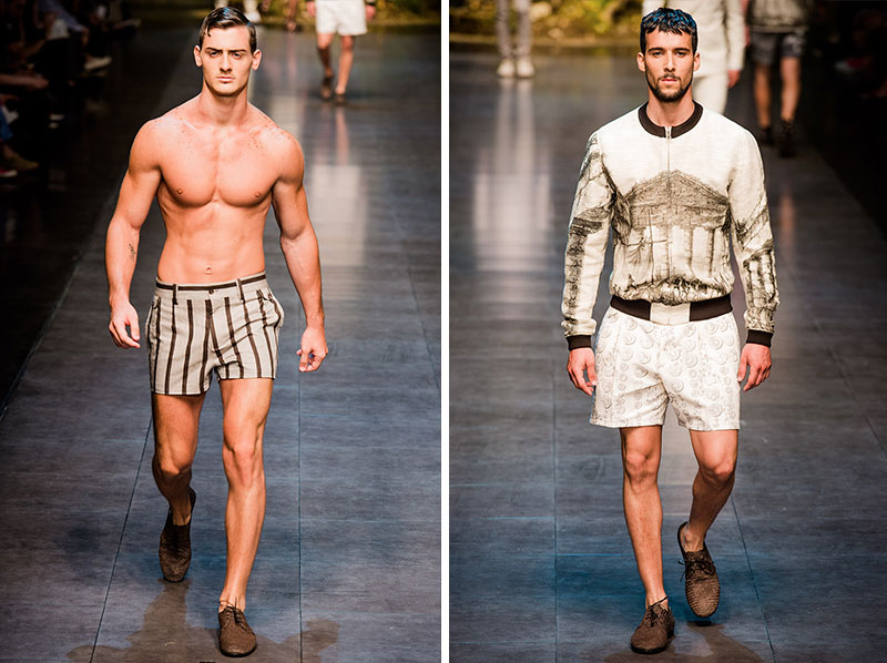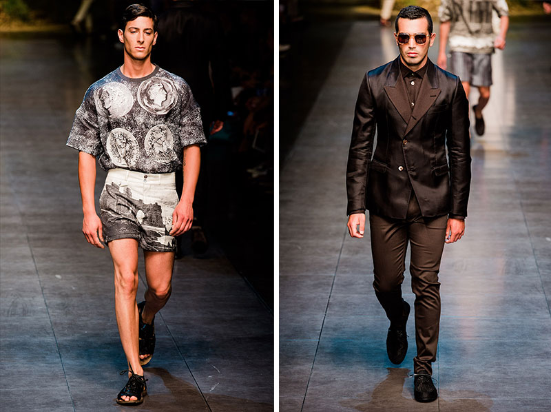 Domenico Dolce and Stefano Gabbana created a Spring/Summer 2014 collection inspired by Sicilian mythology, featuring prints of places such as the Valle dei Templi of Agrigento and the Tempio di Apollo of Syracuse, prints of antique gods such as those of Zeus and Apollo, and great tailoring.