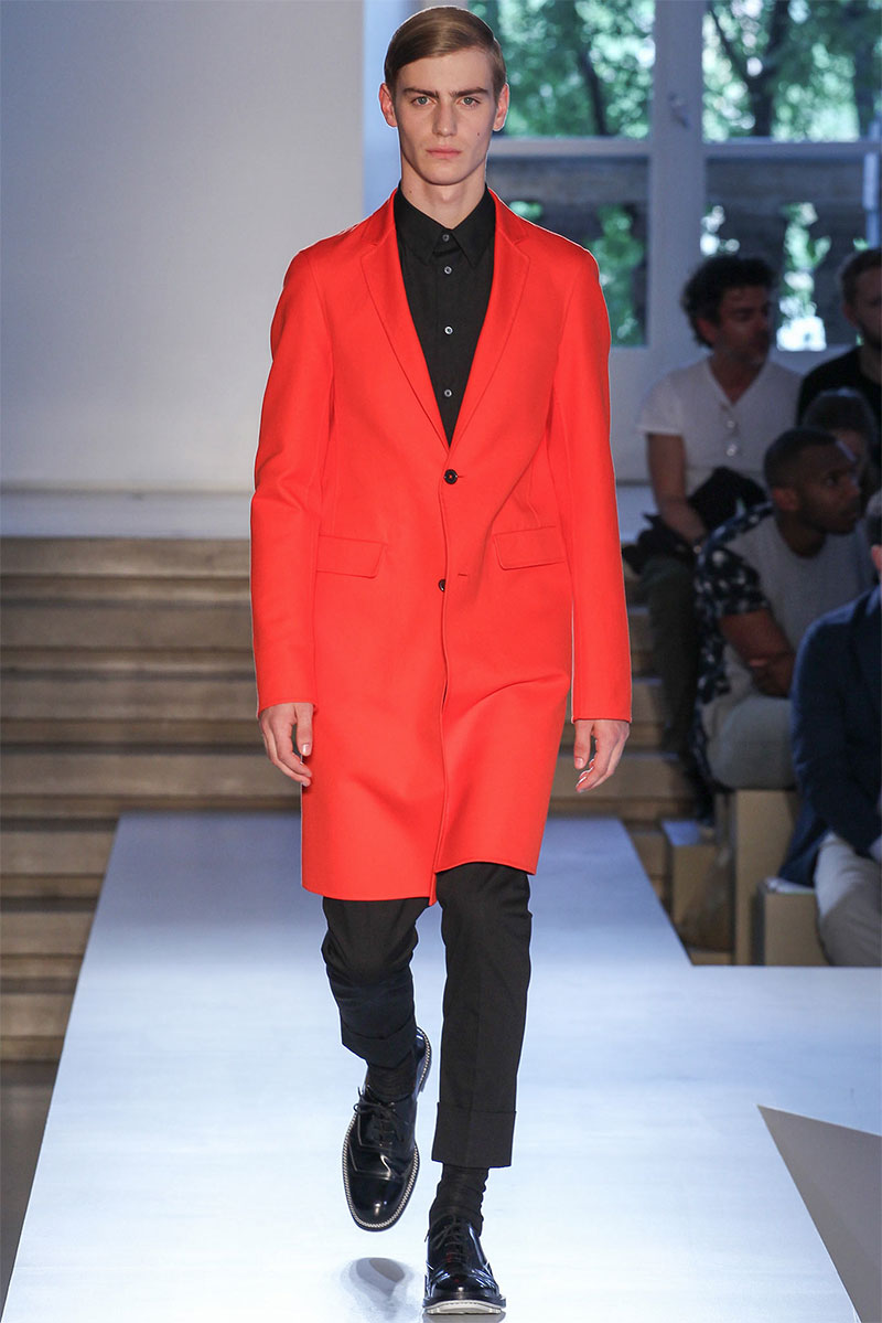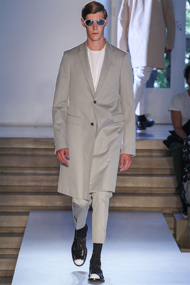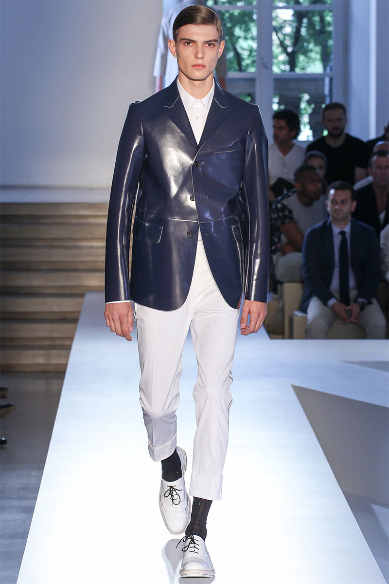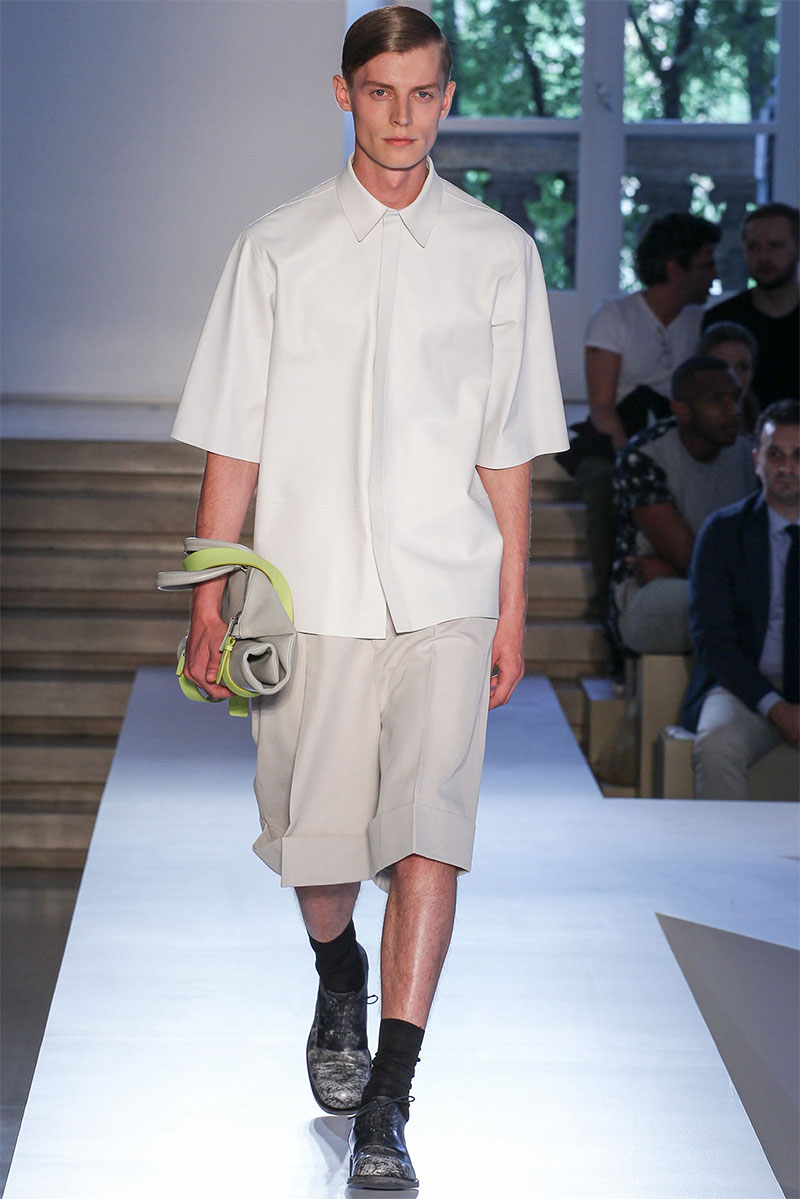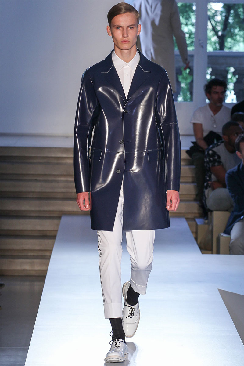 Jil Sander presented a minimal Spring/Summer 2014 collection during Milan Fashion Week, featuring voluminous proportions, glossy leathers and futuristic cuts.