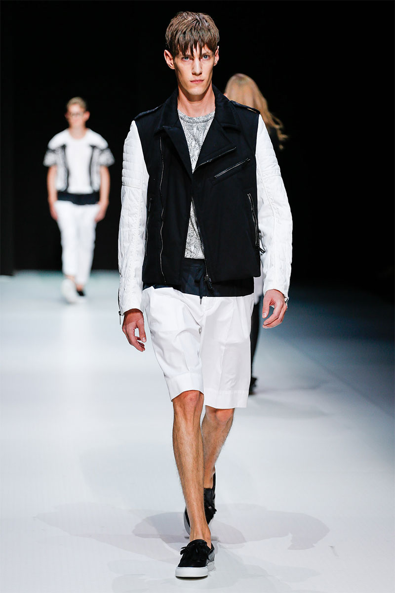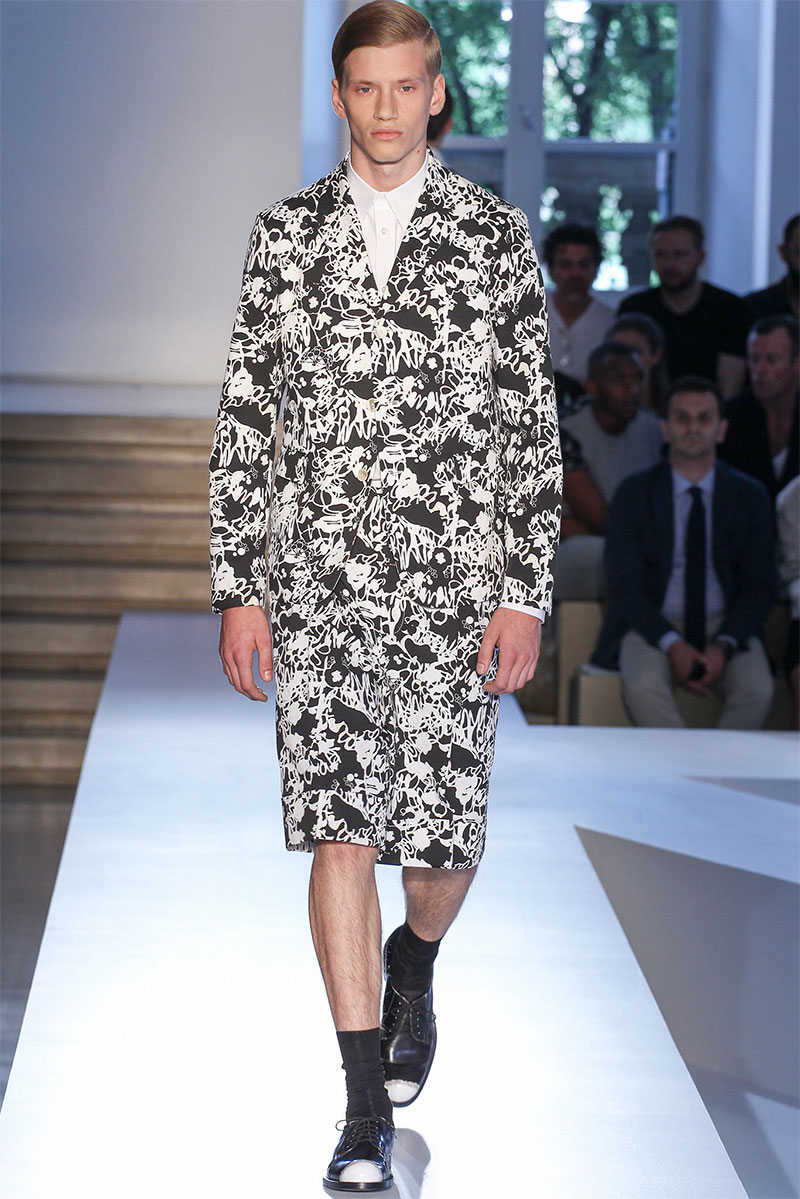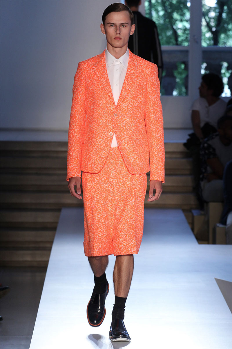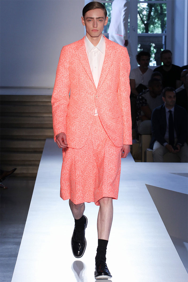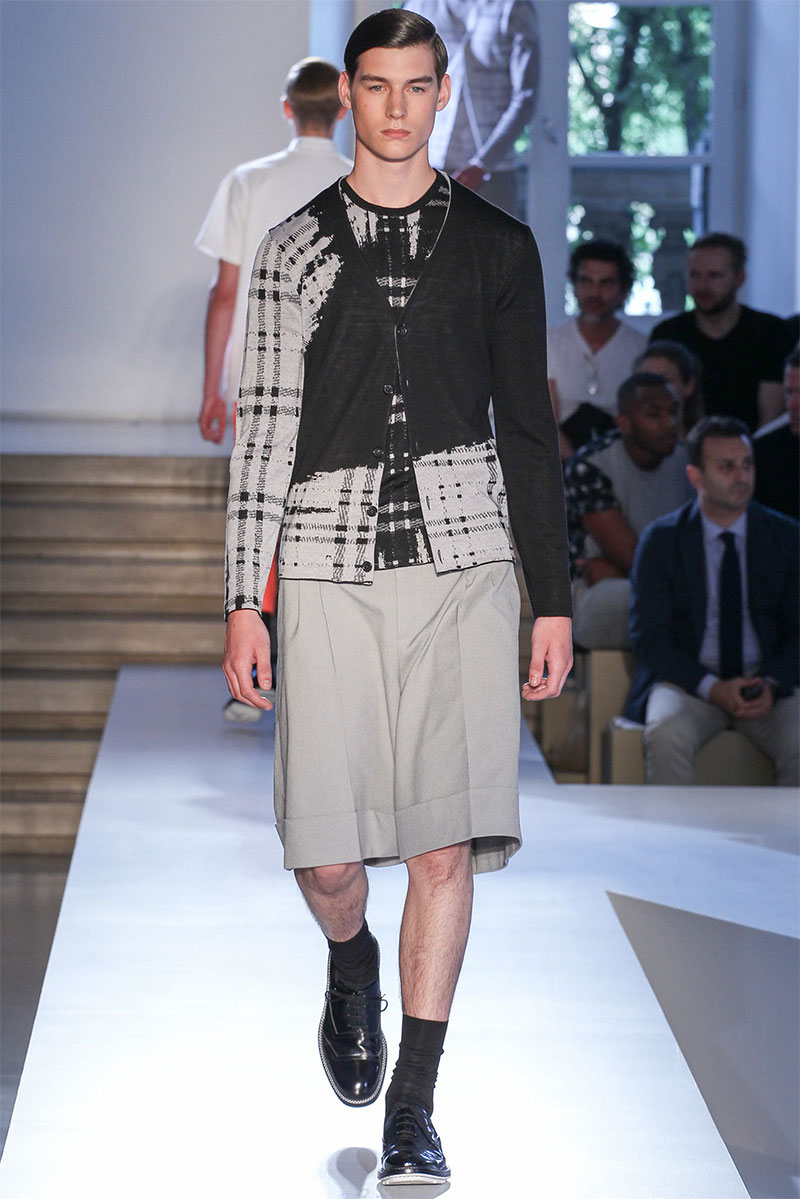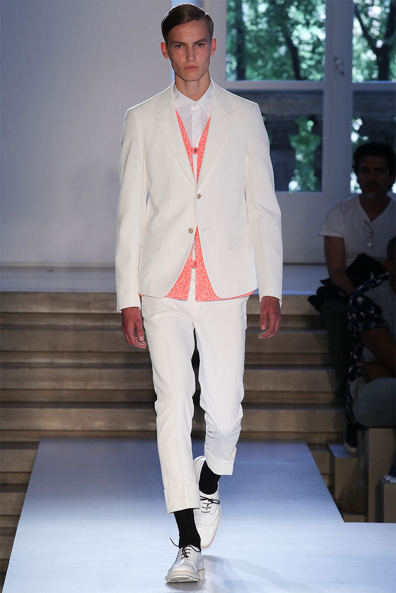 Jil Sander presented a minimal Spring/Summer 2014 collection during Milan Fashion Week, featuring voluminous proportions, glossy leathers and futuristic cuts.