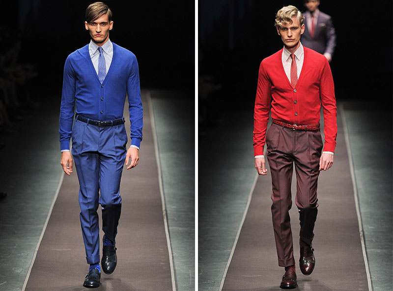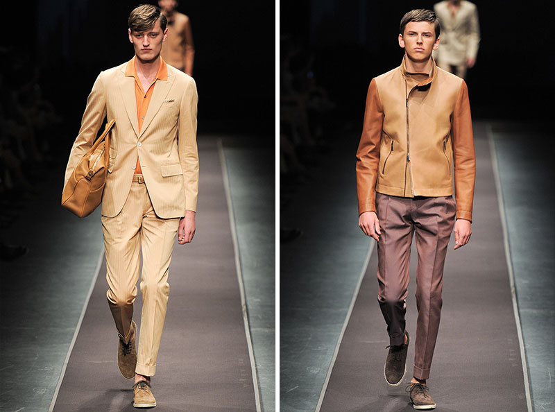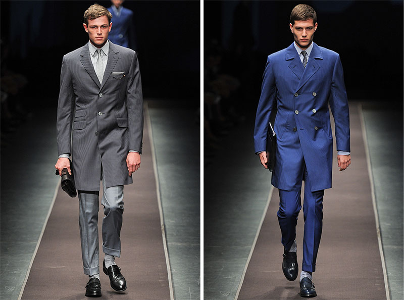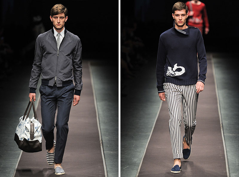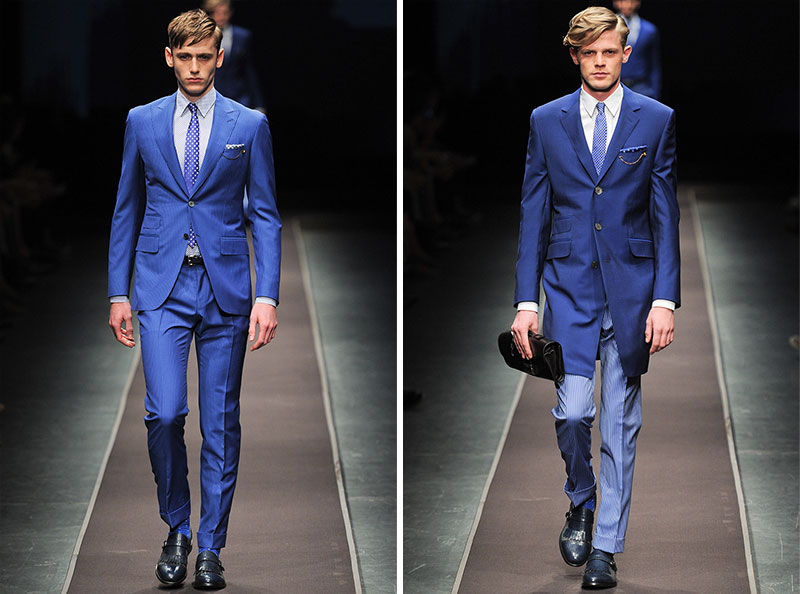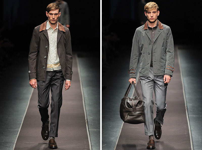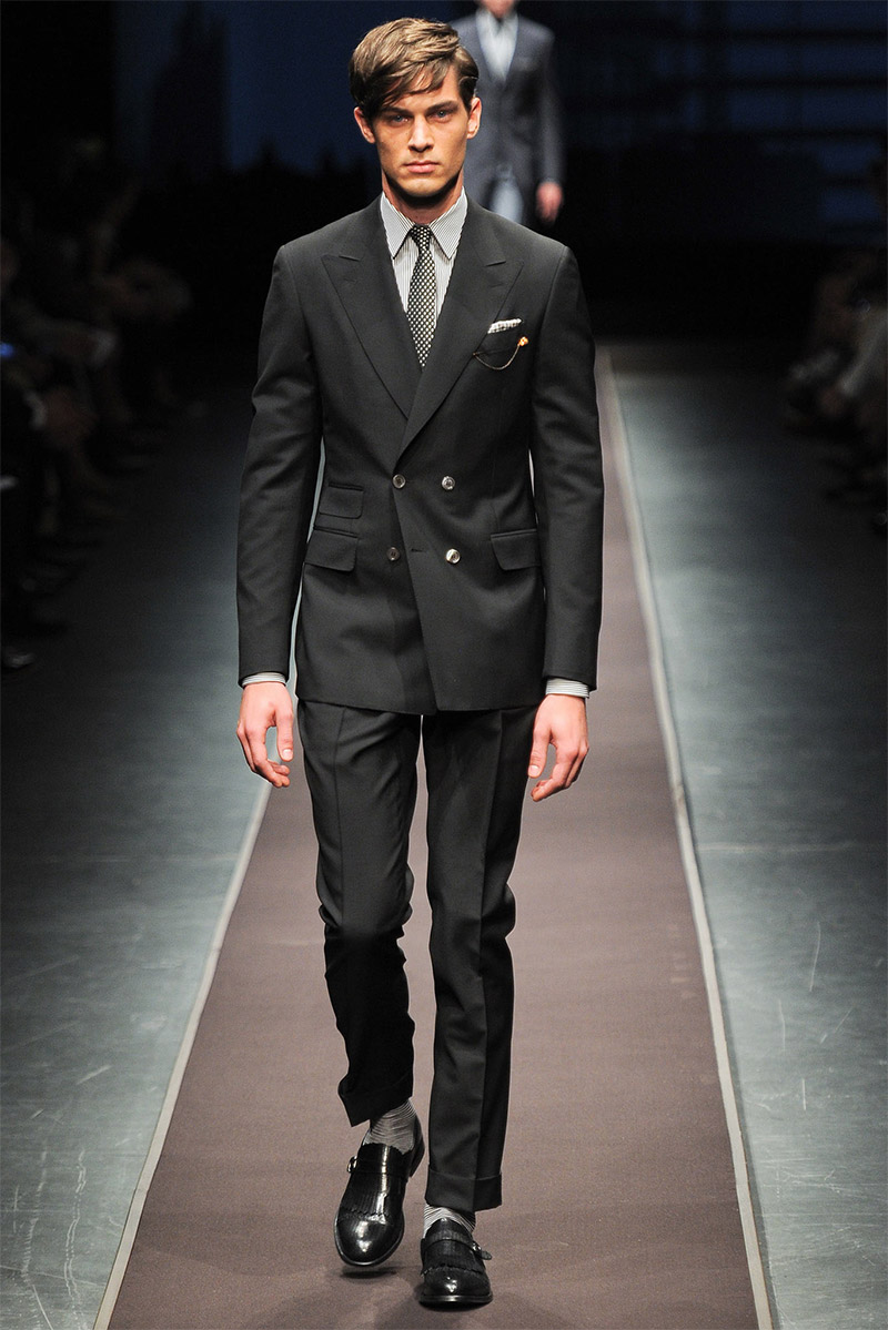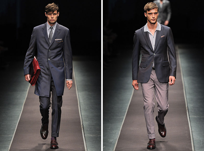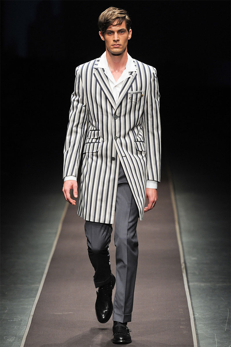 Canali presented its Spring/Summer 2014 collection during Milan Fashion Week. Fine tailoring and handcraftsmanship are blended with a pinch of irony and desire for carefreeness. Stripes and polka dots play down the rigor of a classical sense of elegance to become the guiding thread of the entire collection: formal and cotton suits, deconstructed jackets and the smartest of duster coats which call to mind the Palais Royal and its “striped” columns.