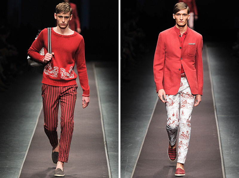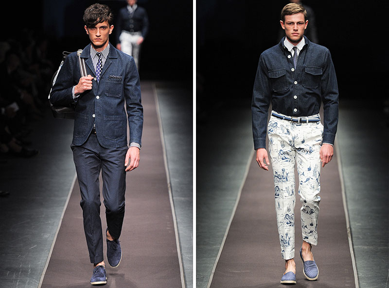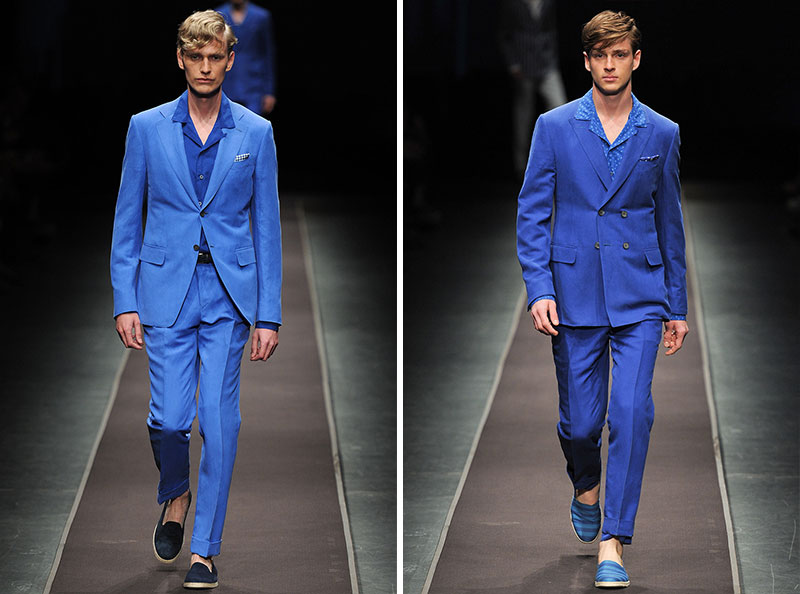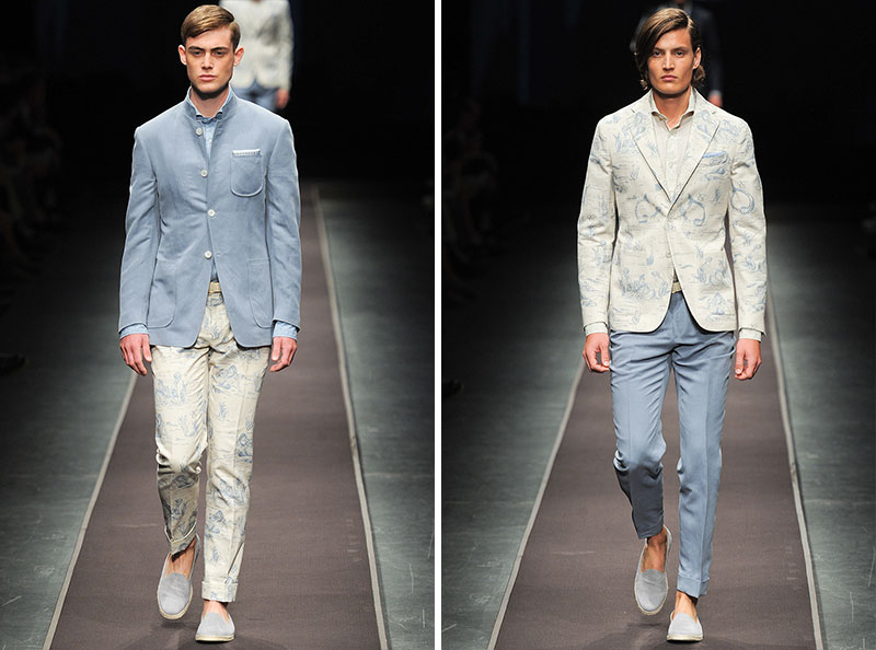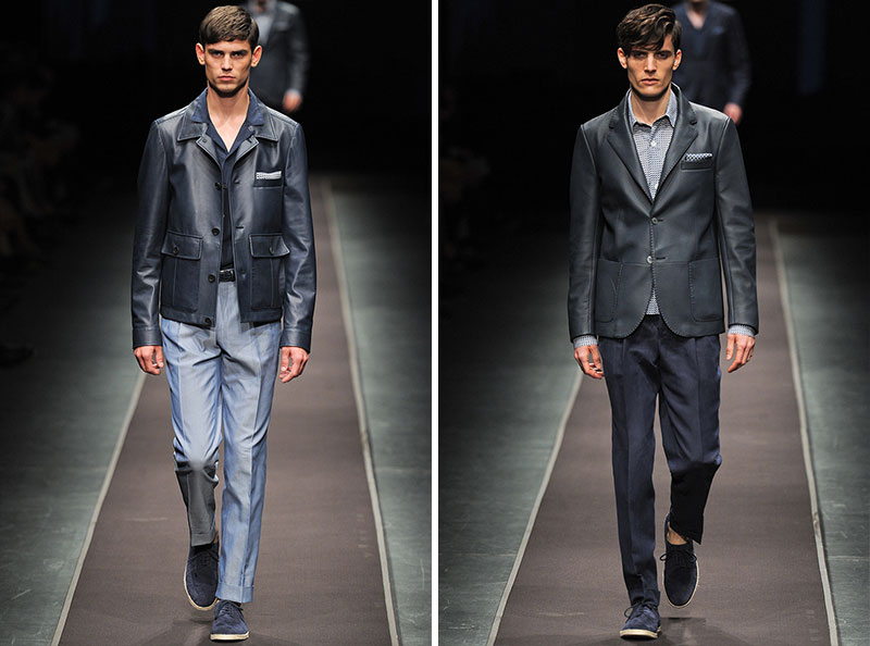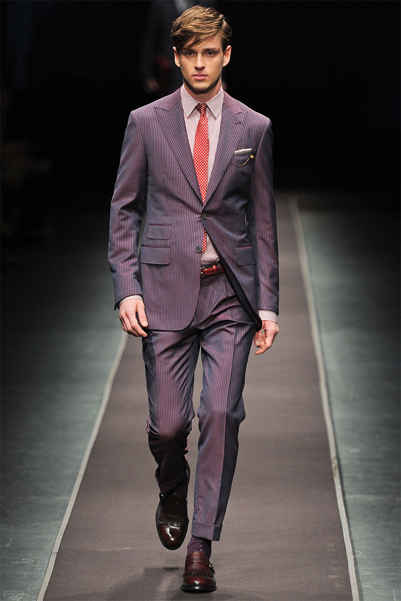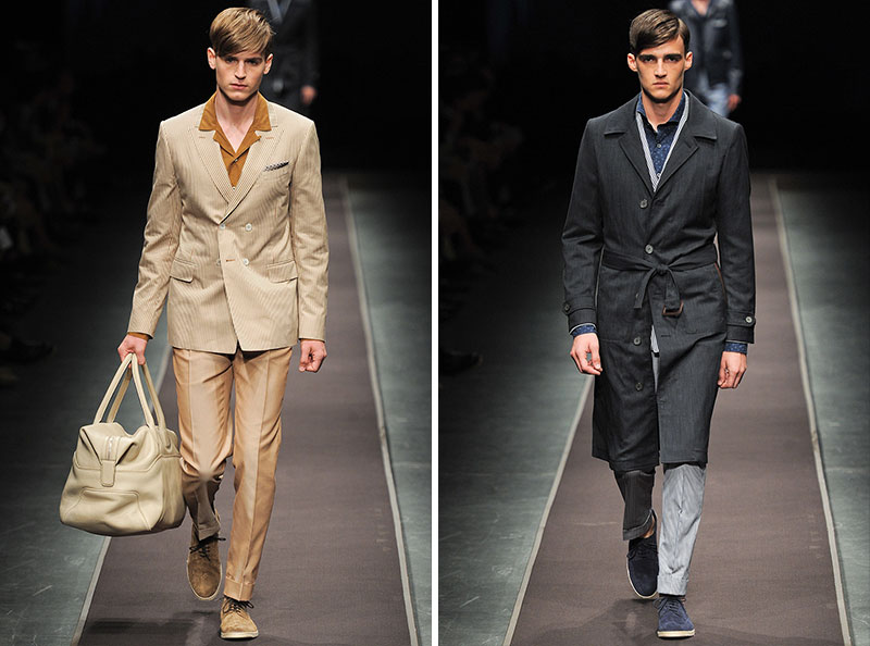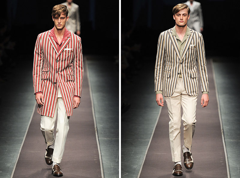 Canali presented its Spring/Summer 2014 collection during Milan Fashion Week. Fine tailoring and handcraftsmanship are blended with a pinch of irony and desire for carefreeness. Stripes and polka dots play down the rigor of a classical sense of elegance to become the guiding thread of the entire collection: formal and cotton suits, deconstructed jackets and the smartest of duster coats which call to mind the Palais Royal and its “striped” columns.