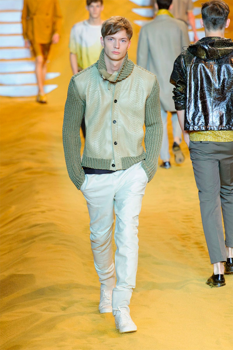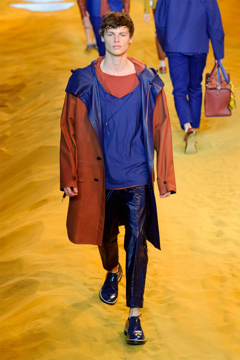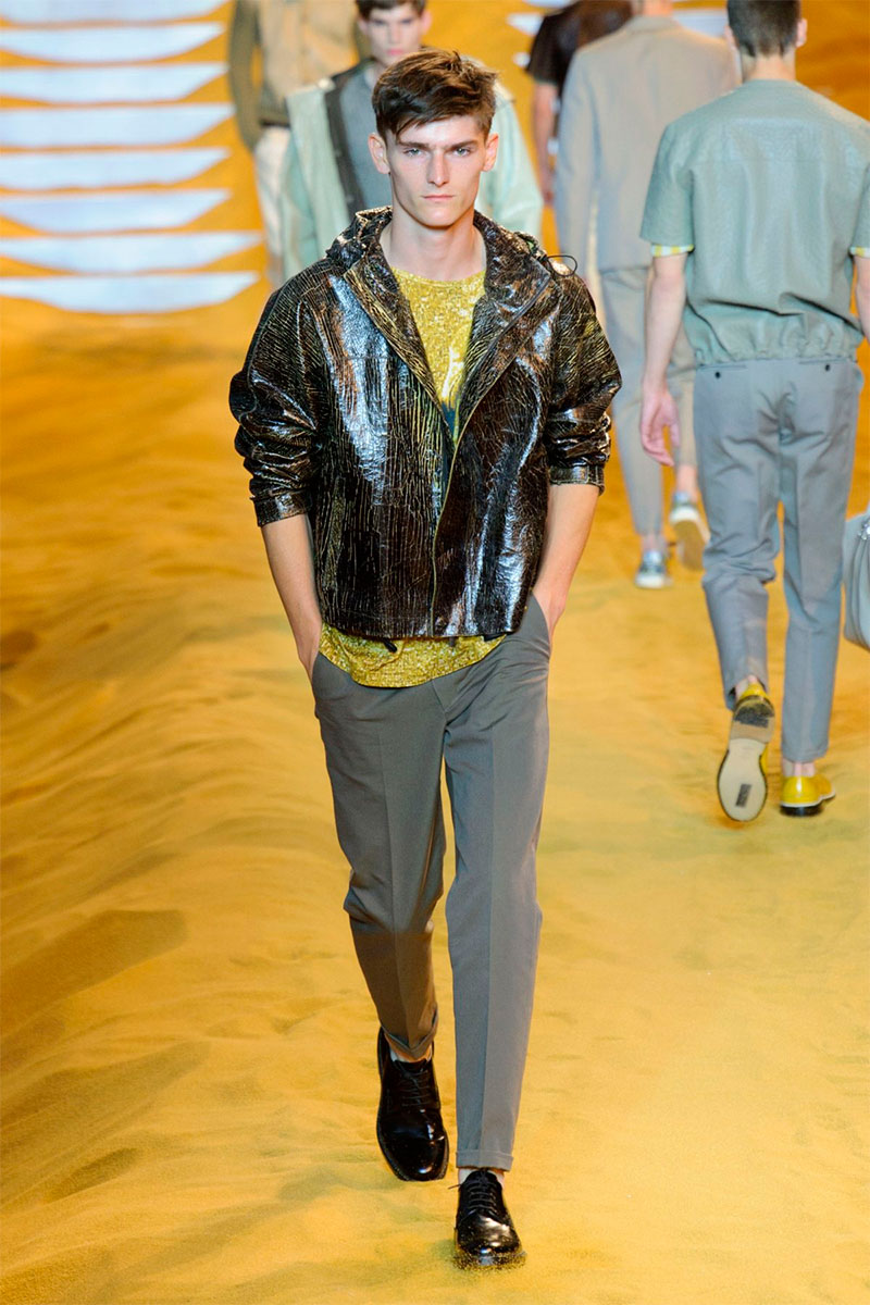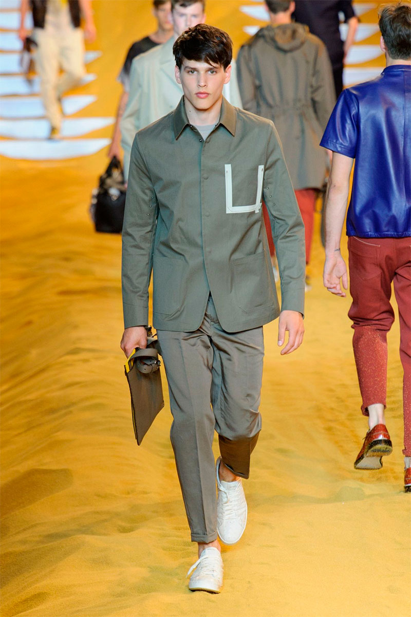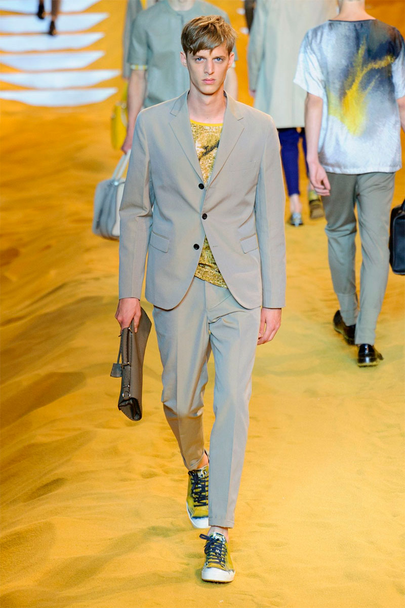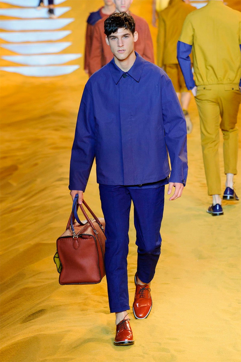 Fendi showed a sophisticated Spring/Summer 2014 collection full of rich materials, during Milan Fashion Week. Desertification. Yellow sand everywhere. The fury of a blinding sun in full blast, burning everything out, drying and cracking surfaces, morphing colors, consuming matter. The new Fendi Men’s Collection delves into another deep extreme. That’s what contemporary life is all about, after all: from one peak to the other, nothing in between. The Fendi man is fit and ready for any situation: an unfussy pragmatist, he acts and delivers. Period.