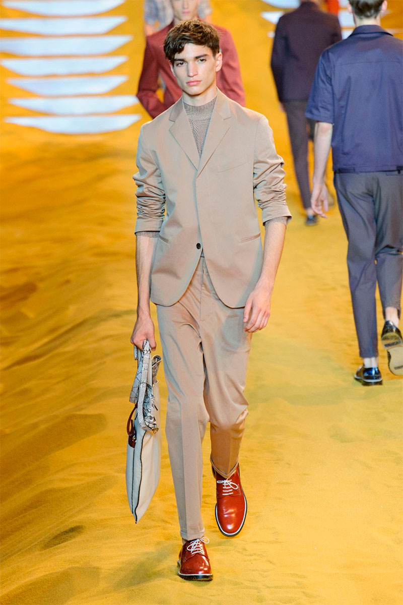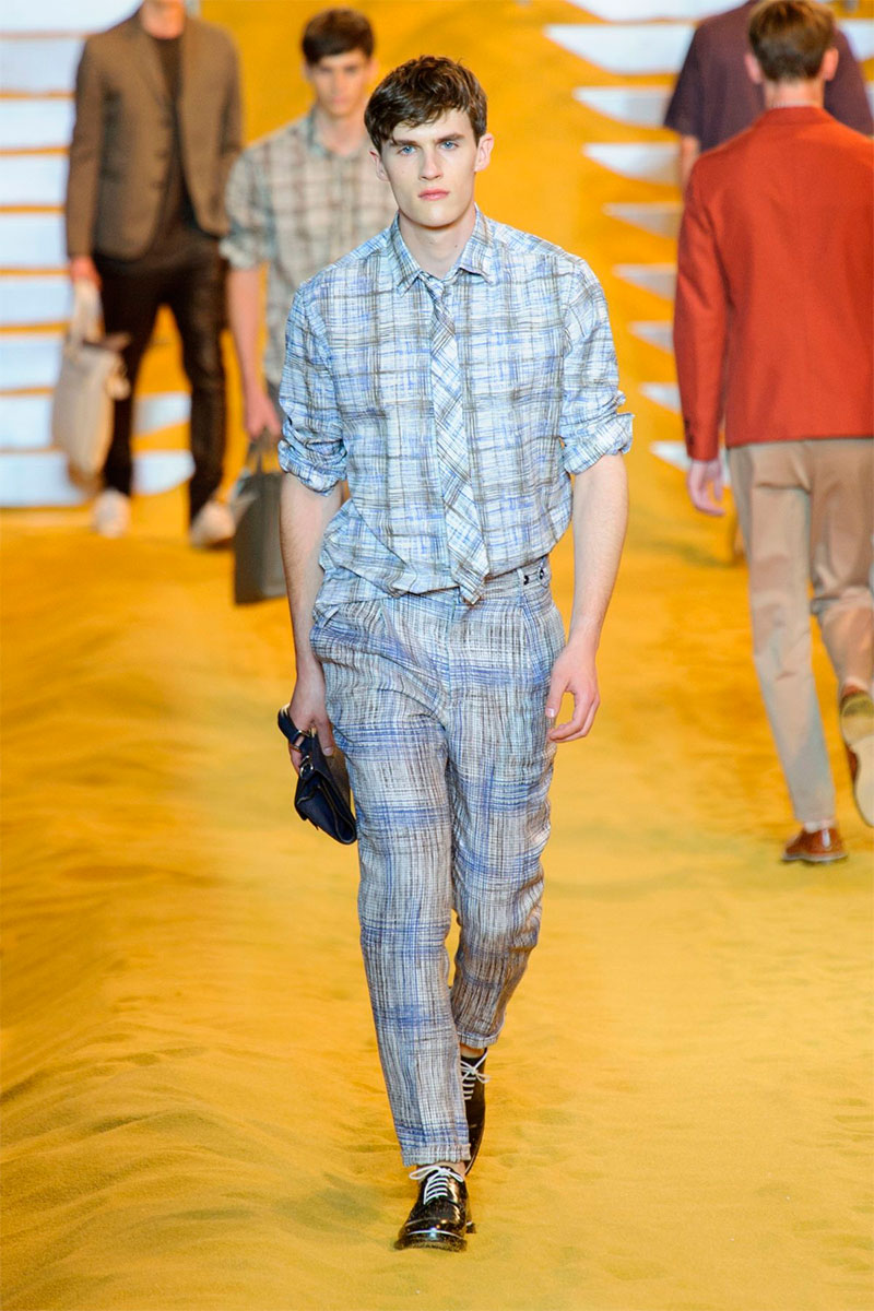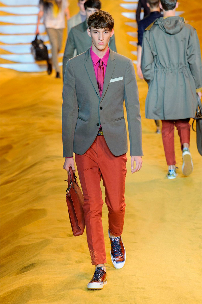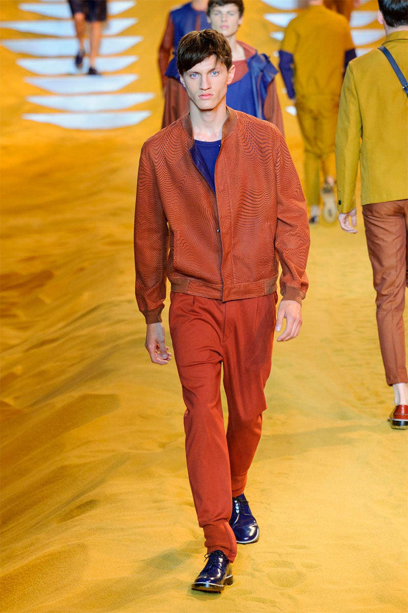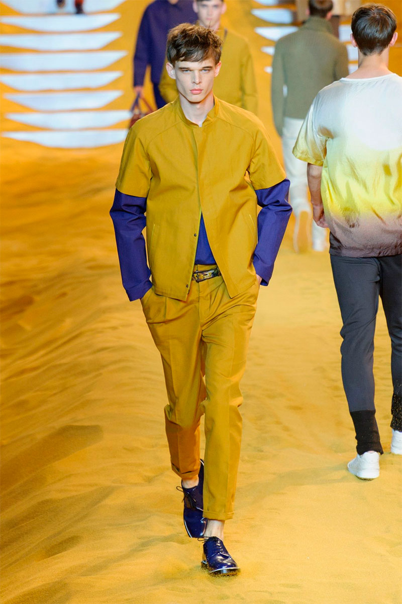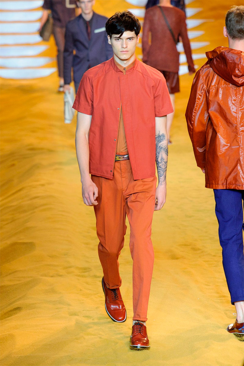 Fendi showed a sophisticated Spring/Summer 2014 collection full of rich materials, during Milan Fashion Week. Desertification. Yellow sand everywhere. The fury of a blinding sun in full blast, burning everything out, drying and cracking surfaces, morphing colors, consuming matter. The new Fendi Men’s Collection delves into another deep extreme. That’s what contemporary life is all about, after all: from one peak to the other, nothing in between. The Fendi man is fit and ready for any situation: an unfussy pragmatist, he acts and delivers. Period.