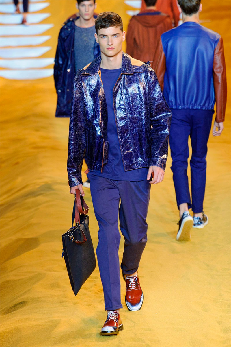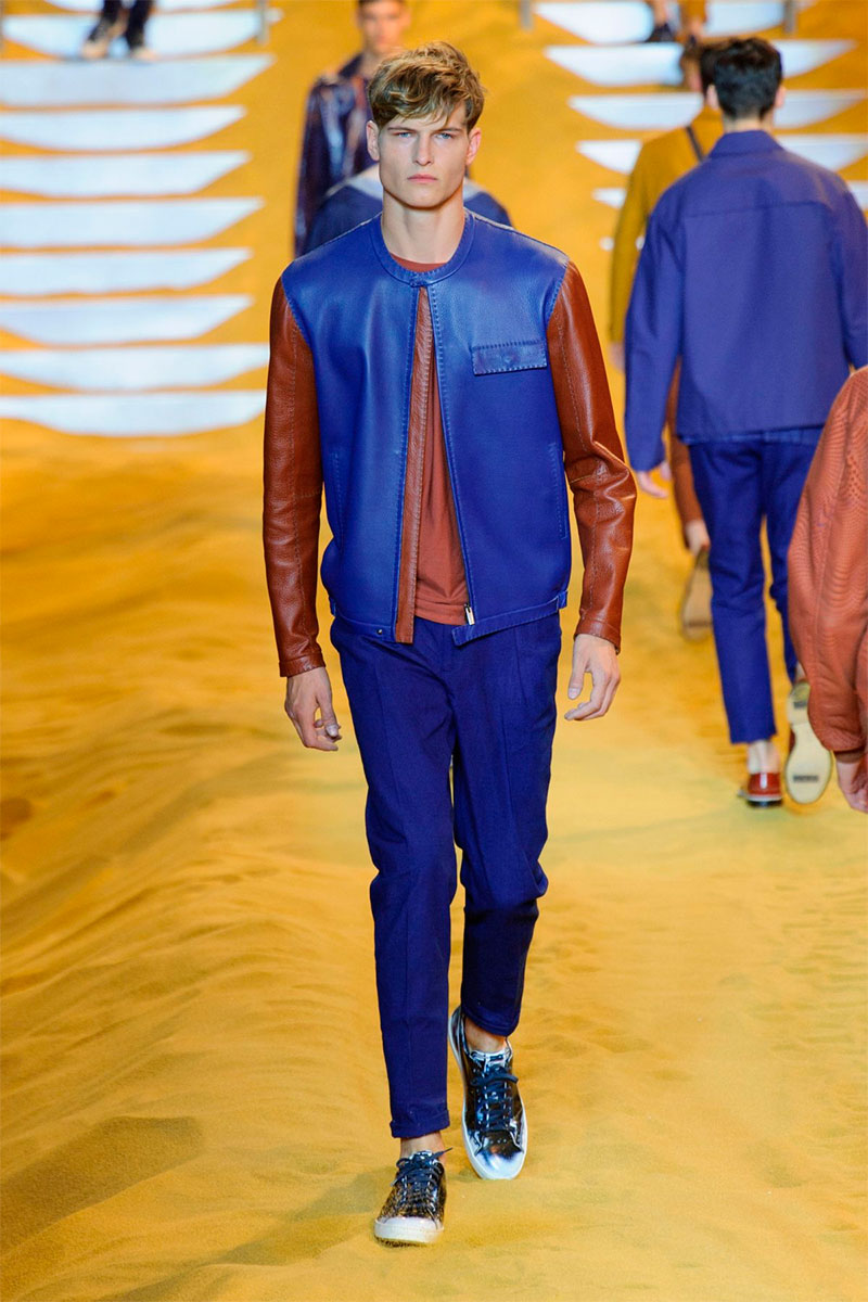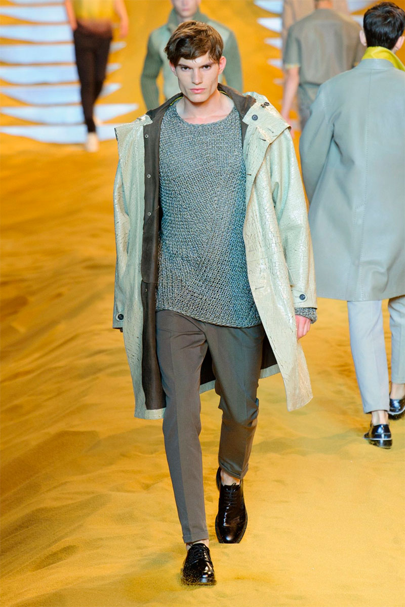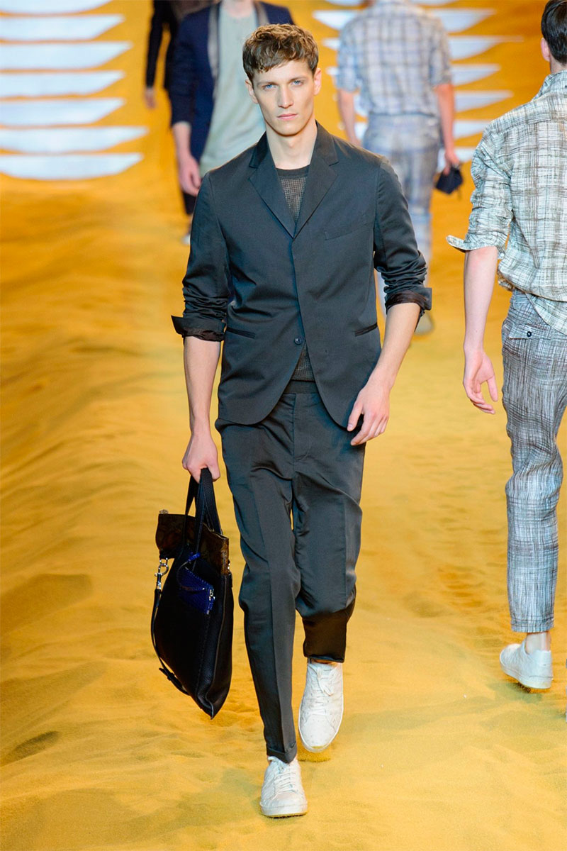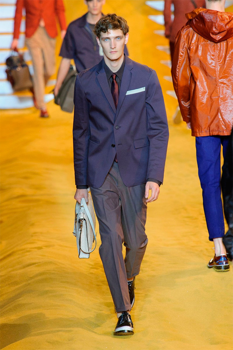 Fendi showed a sophisticated Spring/Summer 2014 collection full of rich materials, during Milan Fashion Week. Desertification. Yellow sand everywhere. The fury of a blinding sun in full blast, burning everything out, drying and cracking surfaces, morphing colors, consuming matter. The new Fendi Men’s Collection delves into another deep extreme. That’s what contemporary life is all about, after all: from one peak to the other, nothing in between. The Fendi man is fit and ready for any situation: an unfussy pragmatist, he acts and delivers. Period.