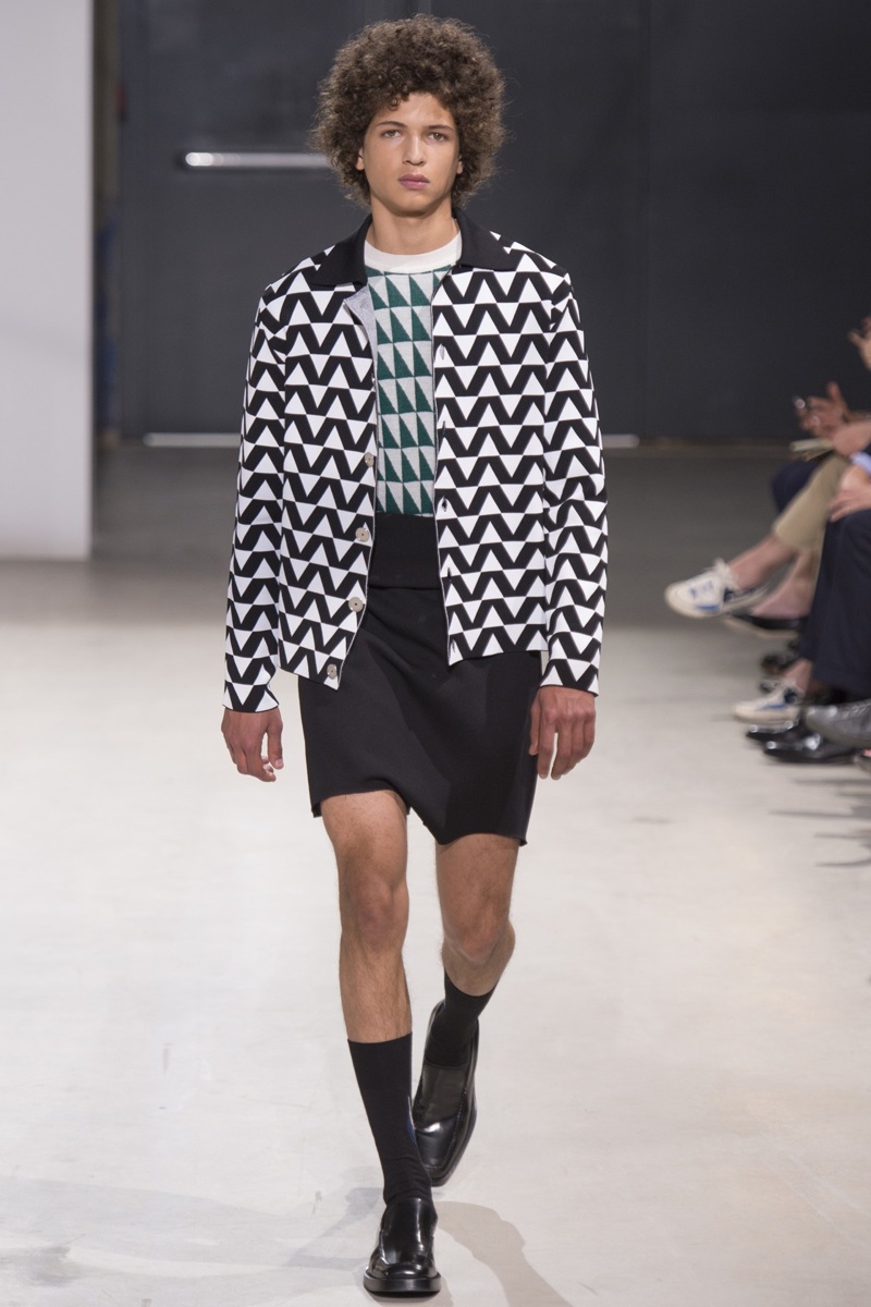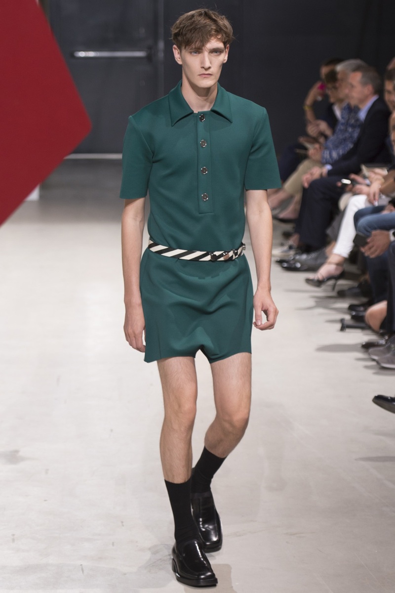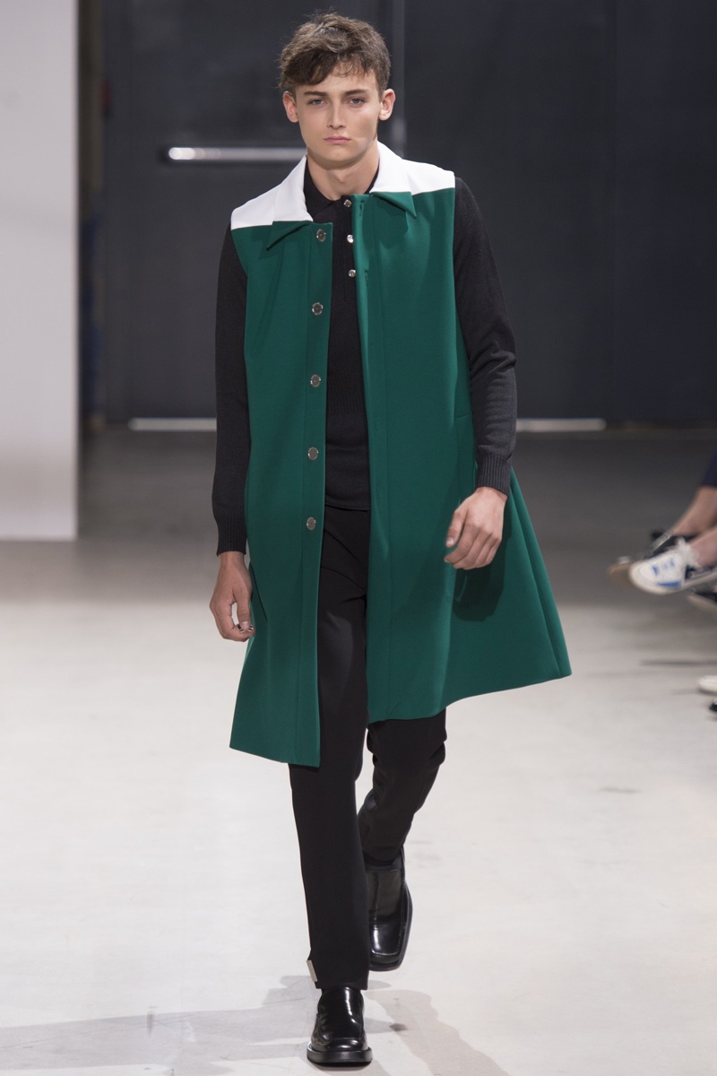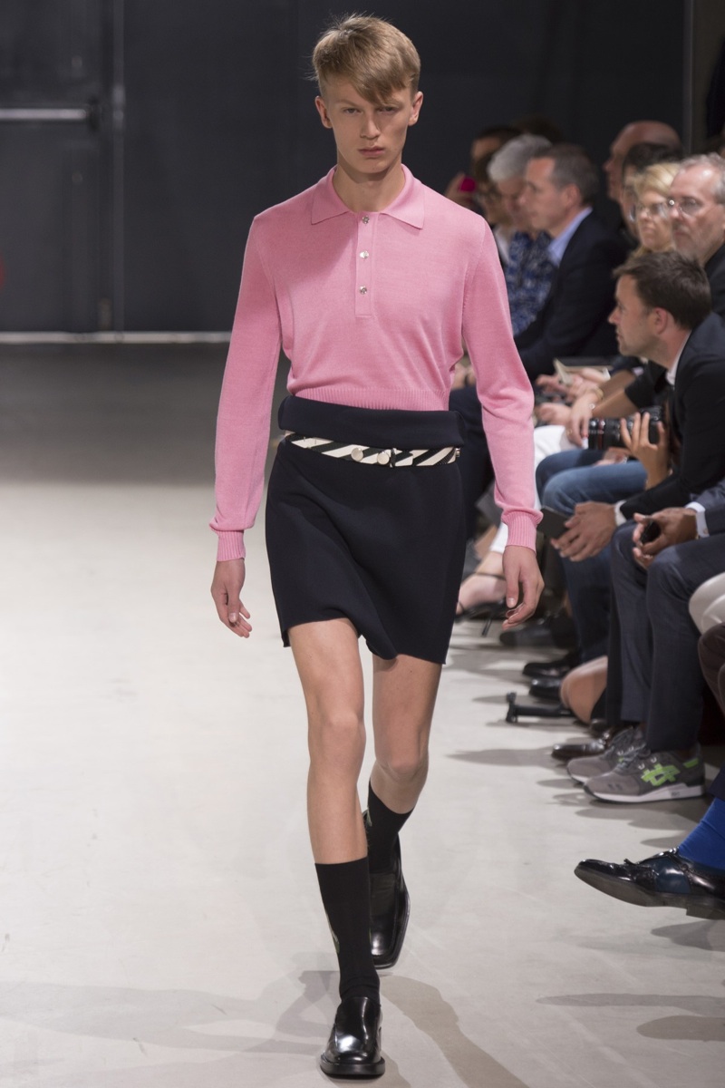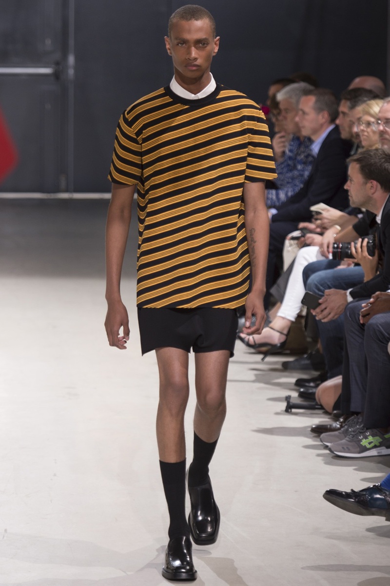 Always in the mood for a little rebellion, Belgian designer Raf Simons embraced pop art inspirations for his spring/summer 2014 collection and challenged fundamental menswear shapes along the way. Drawn to an androgynous shape, one-piece numbers were sharp with clean lines as a testament to Simons’ tailoring skills while the proportions of tops were exaggerated for a dress-like silhouette. Injecting the collection with a fun spirit courtesy of graphic images and diagonal stripes, Raf Simons’ latest was outing was the style equivalent of sugary and sweet.