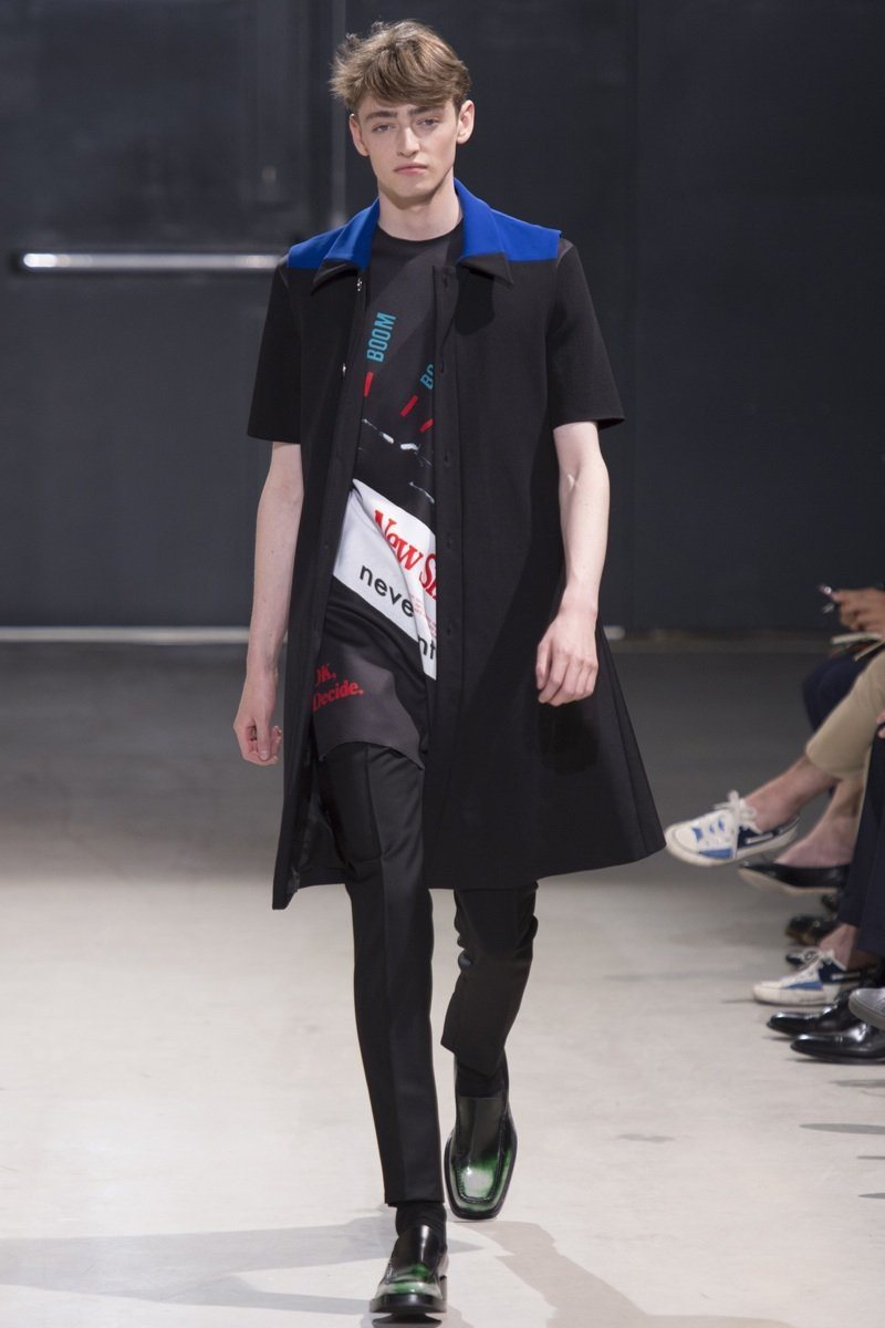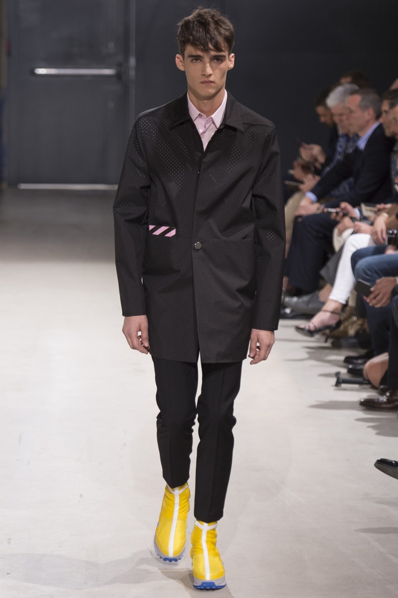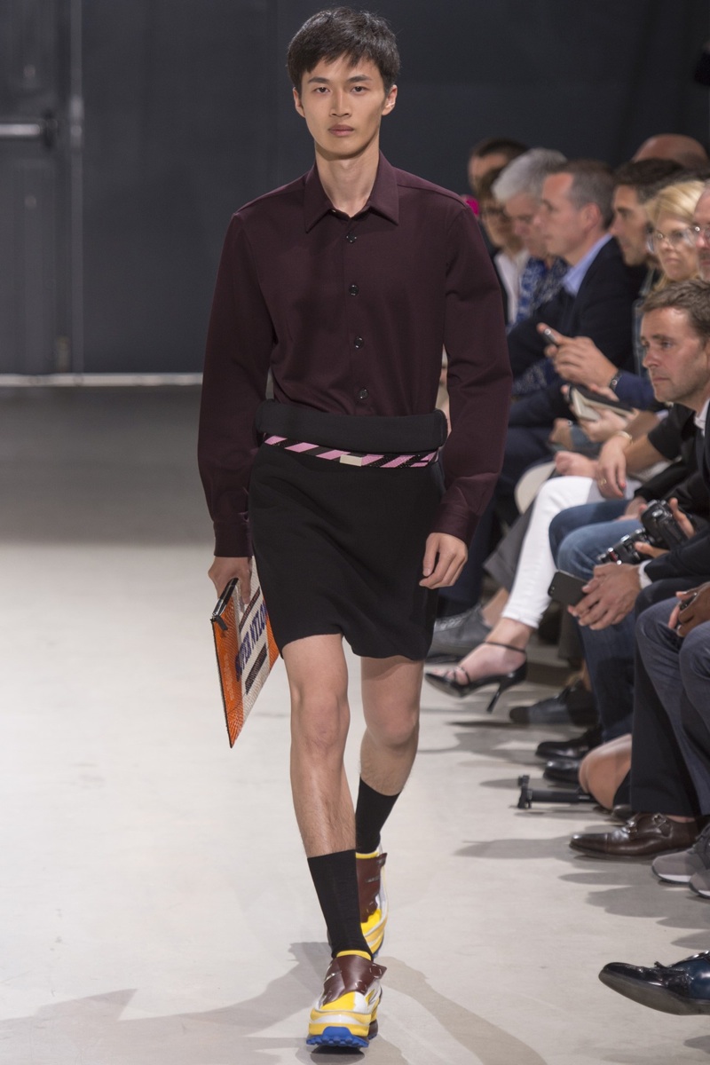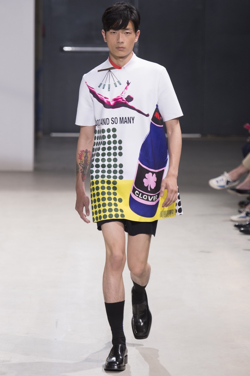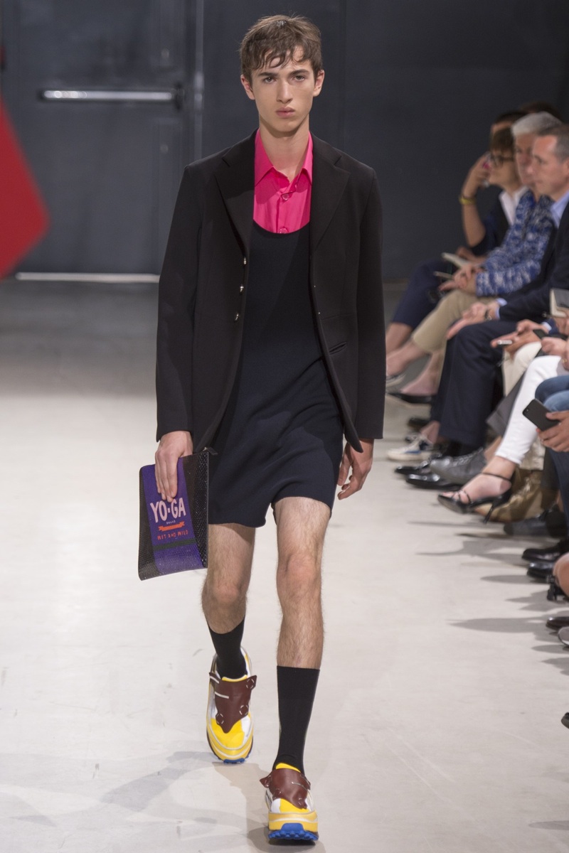 Always in the mood for a little rebellion, Belgian designer Raf Simons embraced pop art inspirations for his spring/summer 2014 collection and challenged fundamental menswear shapes along the way. Drawn to an androgynous shape, one-piece numbers were sharp with clean lines as a testament to Simons’ tailoring skills while the proportions of tops were exaggerated for a dress-like silhouette. Injecting the collection with a fun spirit courtesy of graphic images and diagonal stripes, Raf Simons’ latest was outing was the style equivalent of sugary and sweet.