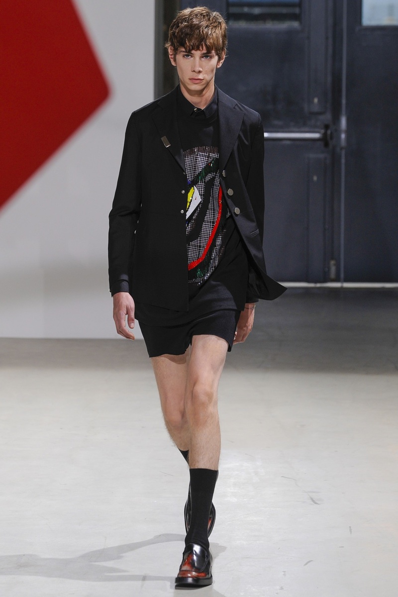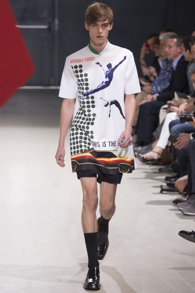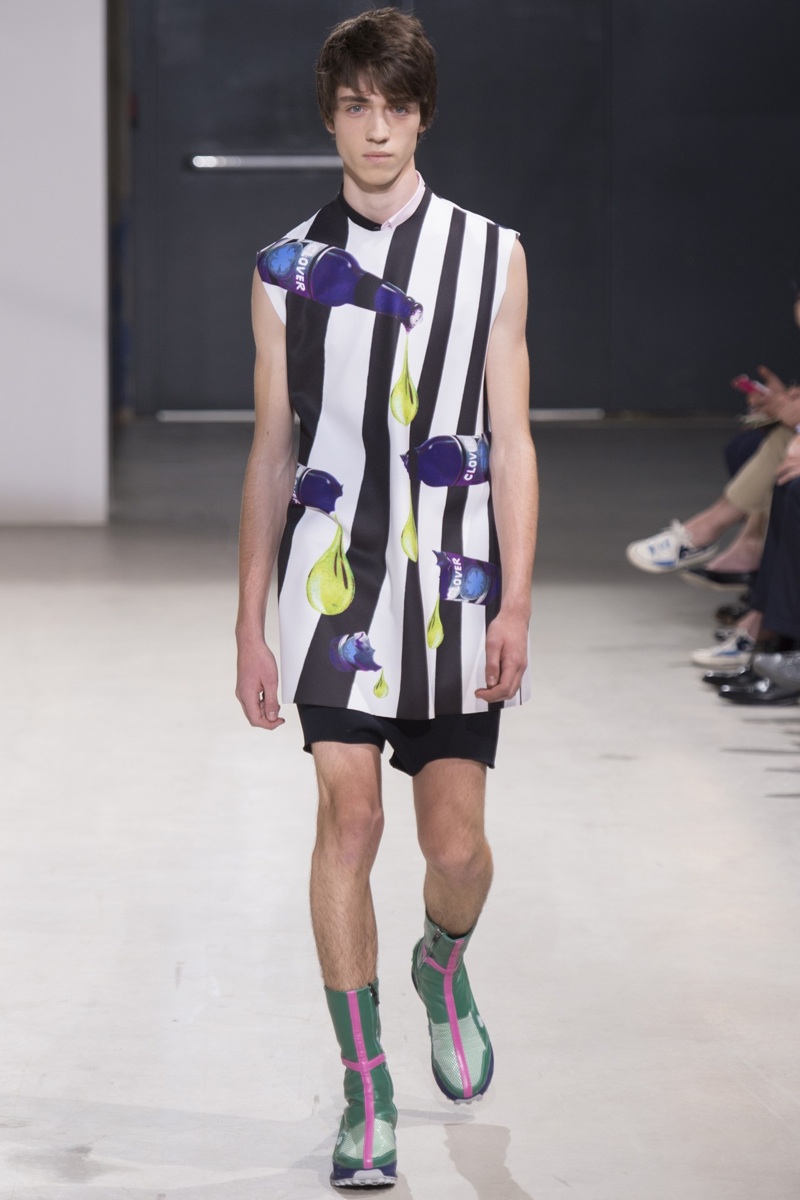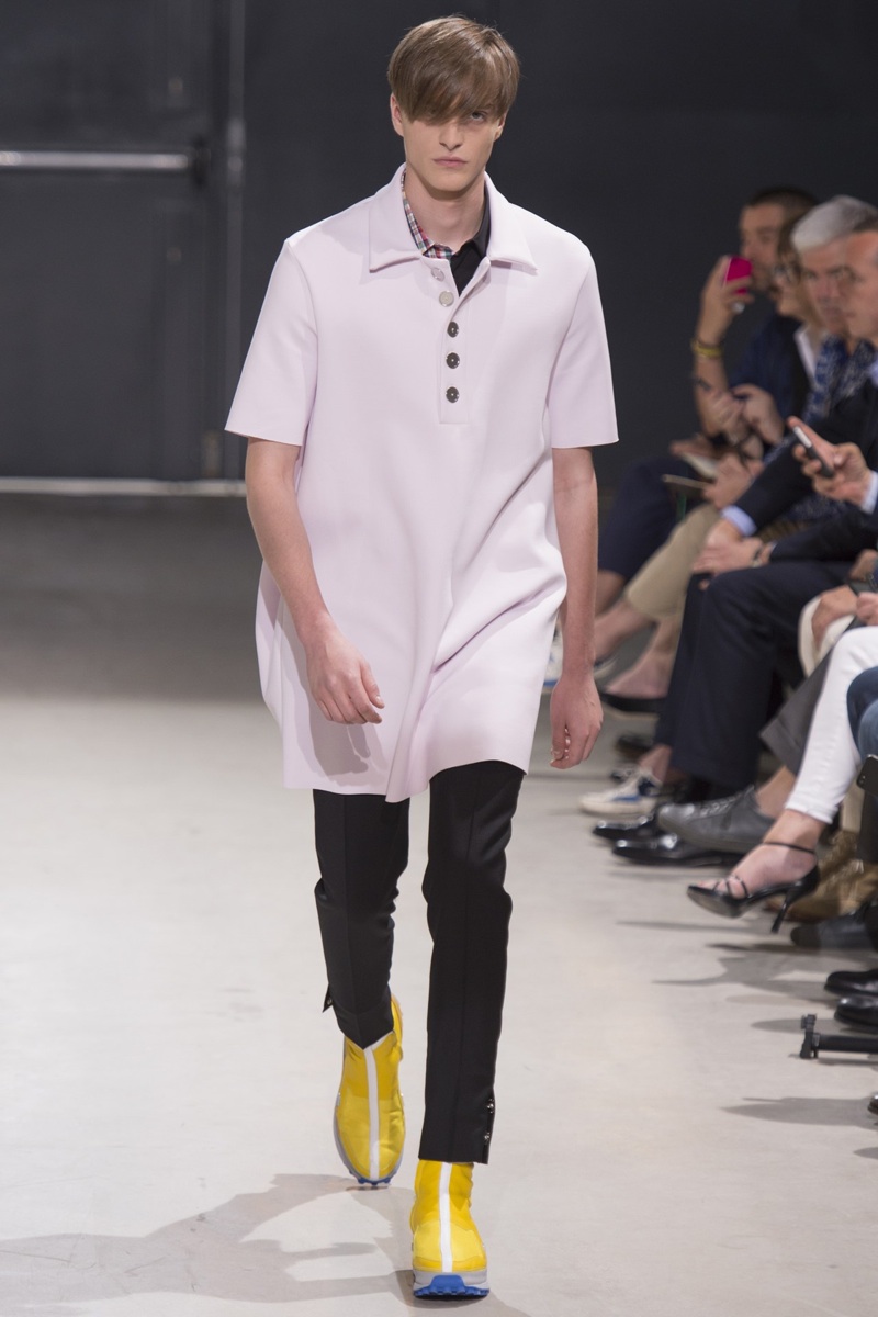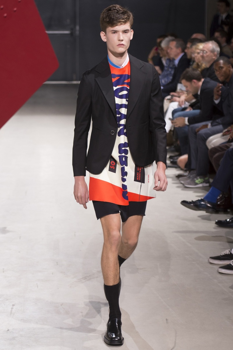 Always in the mood for a little rebellion, Belgian designer Raf Simons embraced pop art inspirations for his spring/summer 2014 collection and challenged fundamental menswear shapes along the way. Drawn to an androgynous shape, one-piece numbers were sharp with clean lines as a testament to Simons’ tailoring skills while the proportions of tops were exaggerated for a dress-like silhouette. Injecting the collection with a fun spirit courtesy of graphic images and diagonal stripes, Raf Simons’ latest was outing was the style equivalent of sugary and sweet.