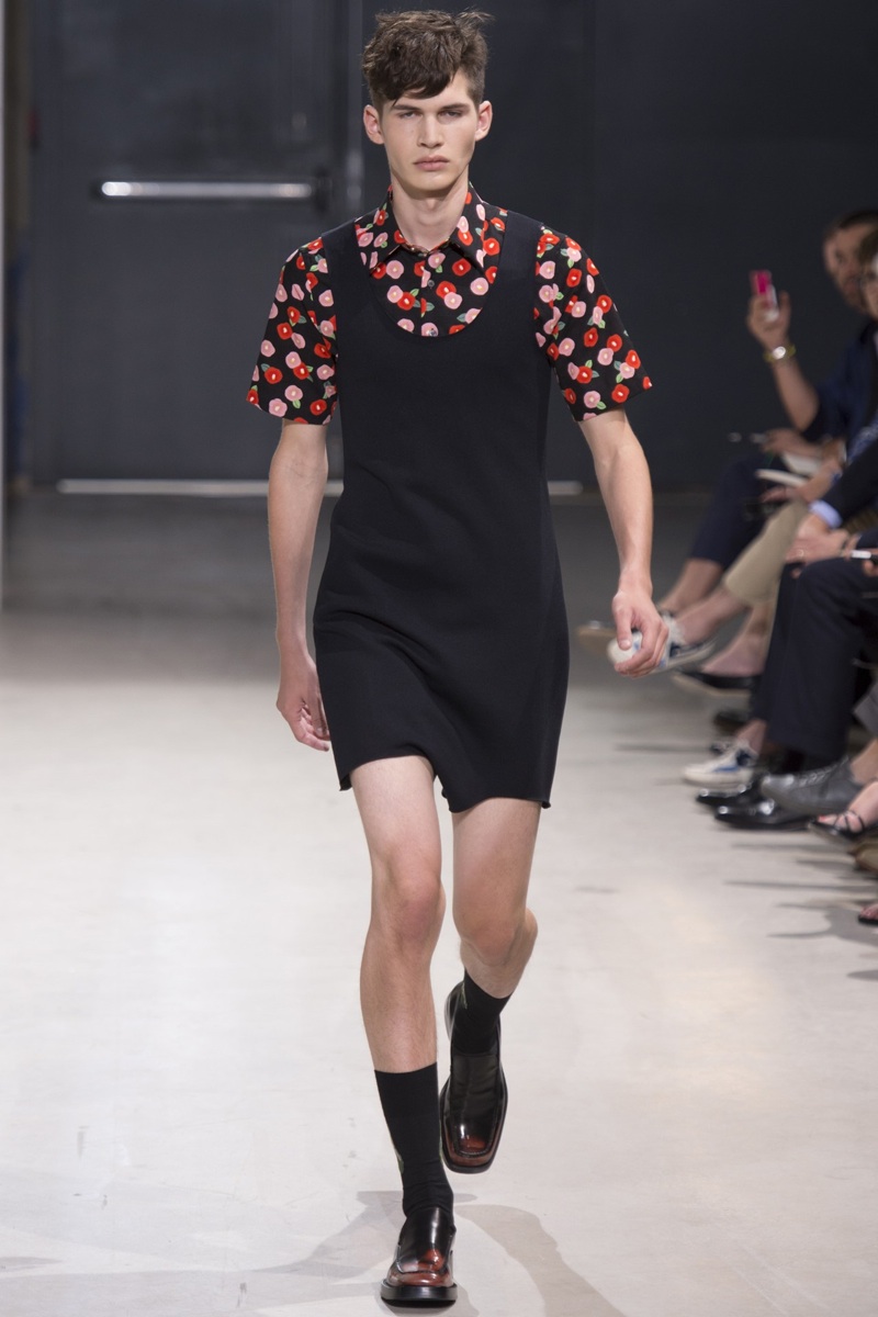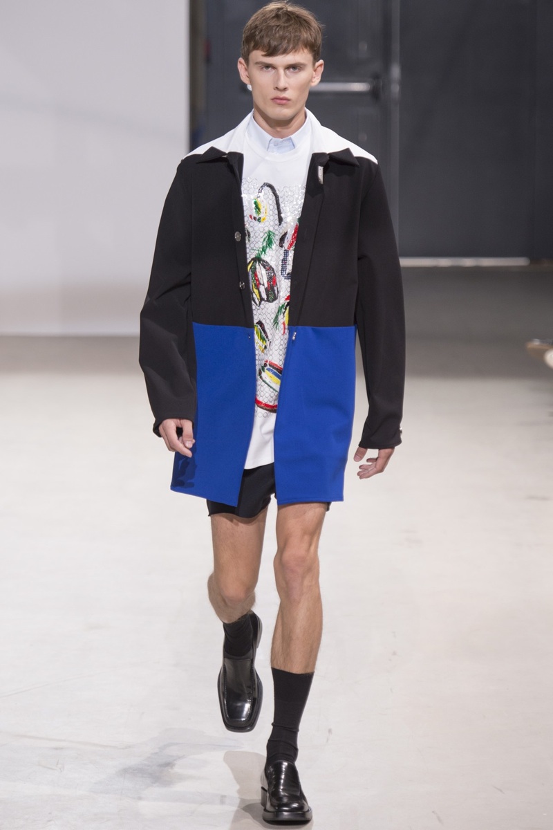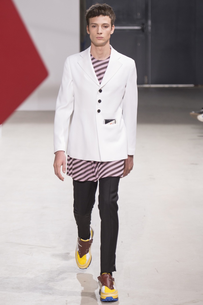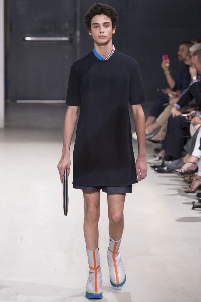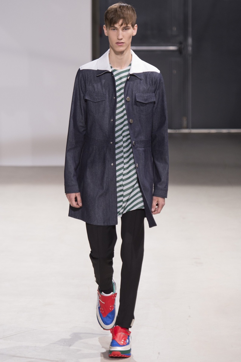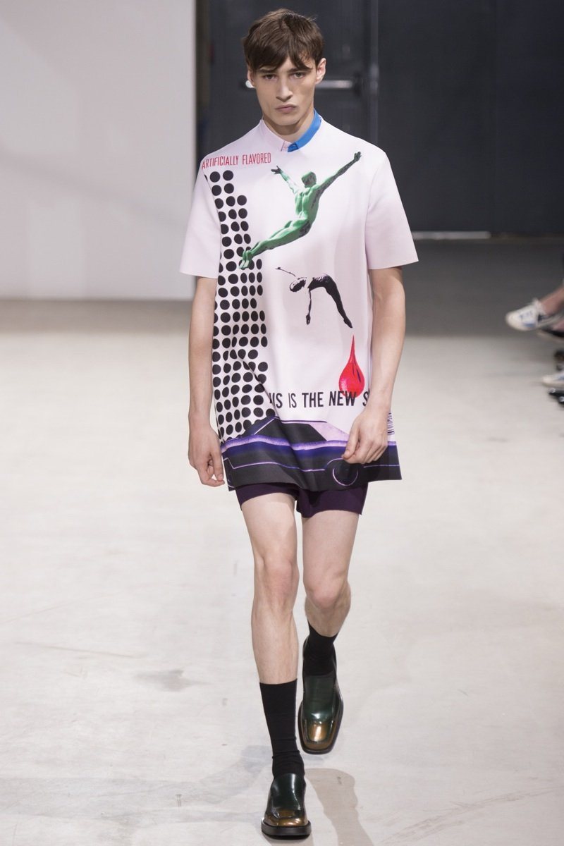 Always in the mood for a little rebellion, Belgian designer Raf Simons embraced pop art inspirations for his spring/summer 2014 collection and challenged fundamental menswear shapes along the way. Drawn to an androgynous shape, one-piece numbers were sharp with clean lines as a testament to Simons’ tailoring skills while the proportions of tops were exaggerated for a dress-like silhouette. Injecting the collection with a fun spirit courtesy of graphic images and diagonal stripes, Raf Simons’ latest was outing was the style equivalent of sugary and sweet.