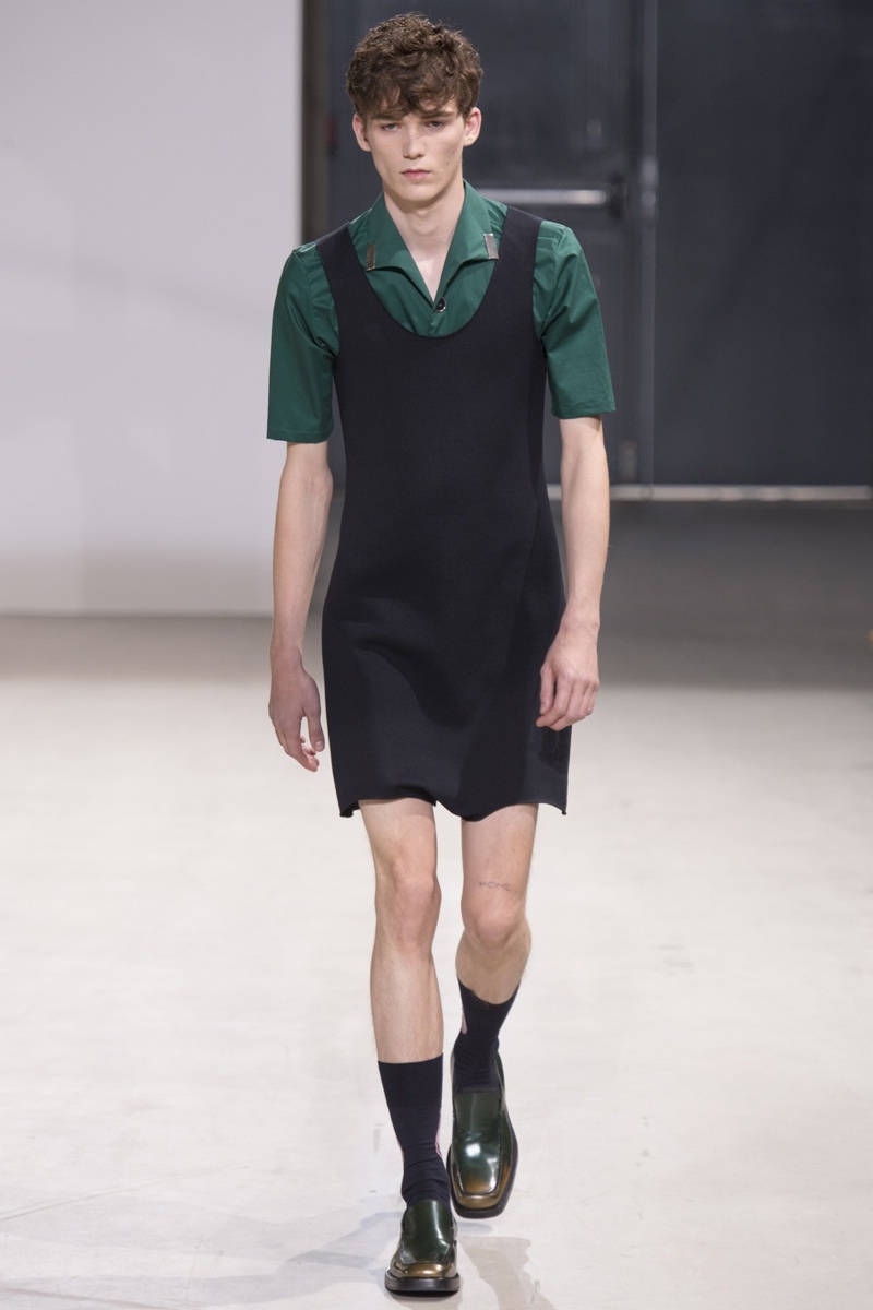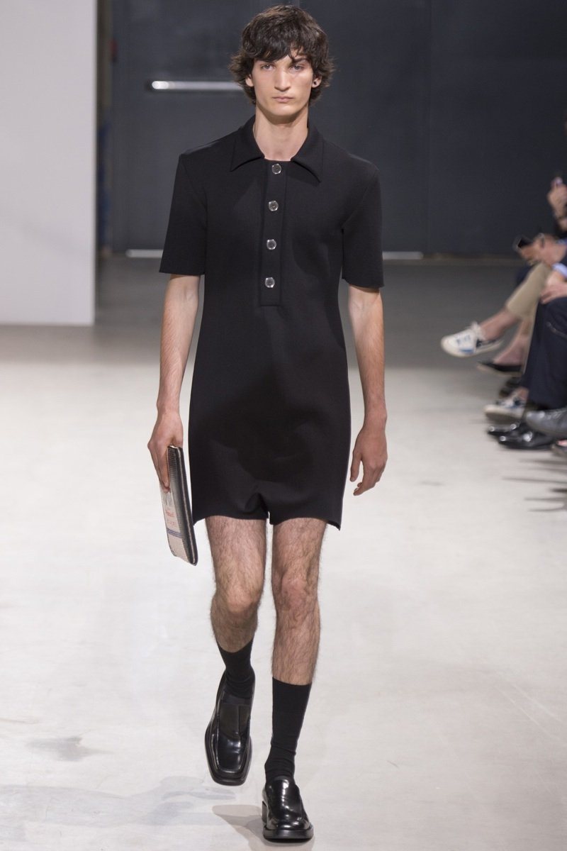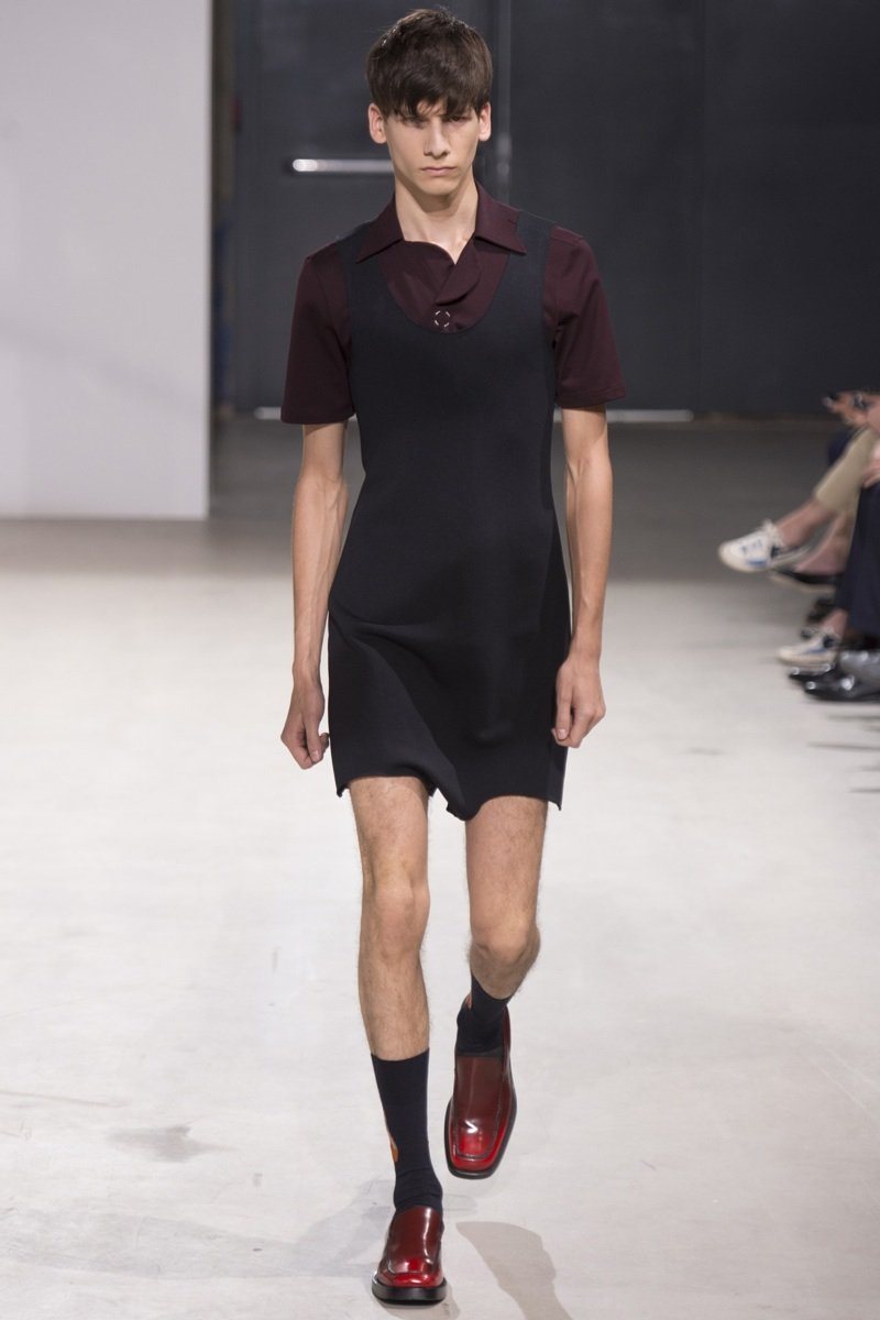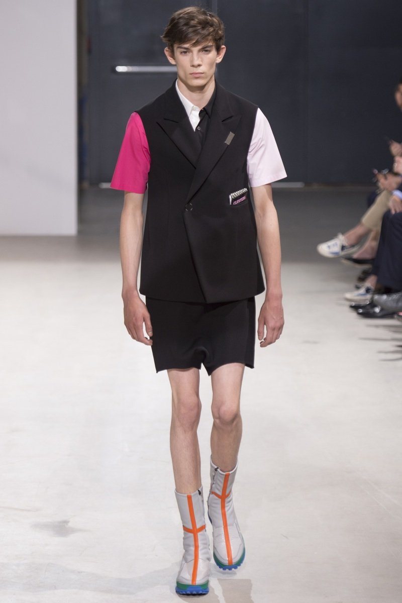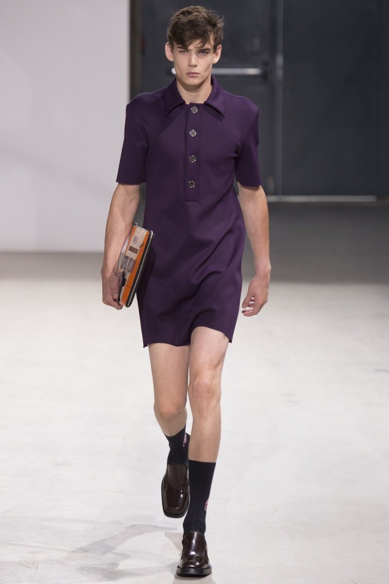 Always in the mood for a little rebellion, Belgian designer Raf Simons embraced pop art inspirations for his spring/summer 2014 collection and challenged fundamental menswear shapes along the way. Drawn to an androgynous shape, one-piece numbers were sharp with clean lines as a testament to Simons’ tailoring skills while the proportions of tops were exaggerated for a dress-like silhouette. Injecting the collection with a fun spirit courtesy of graphic images and diagonal stripes, Raf Simons’ latest was outing was the style equivalent of sugary and sweet.