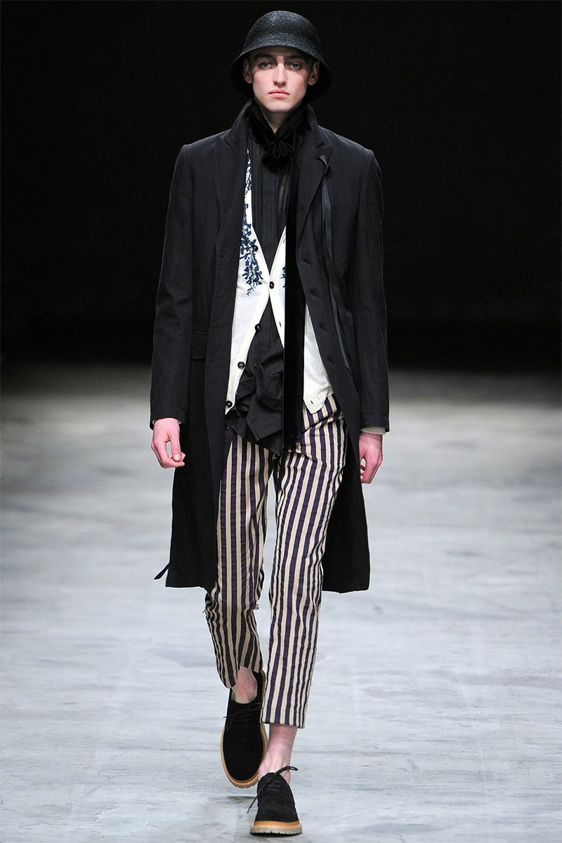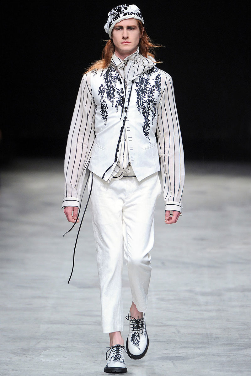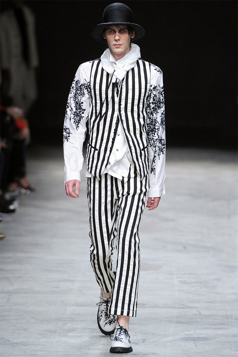 Ann Demeulemeester presented a romantic and dark Spring/Summer 2014 collection during Paris Fashion Week, featuring formal tailoring, stripes and velvet flowers all over the collection.